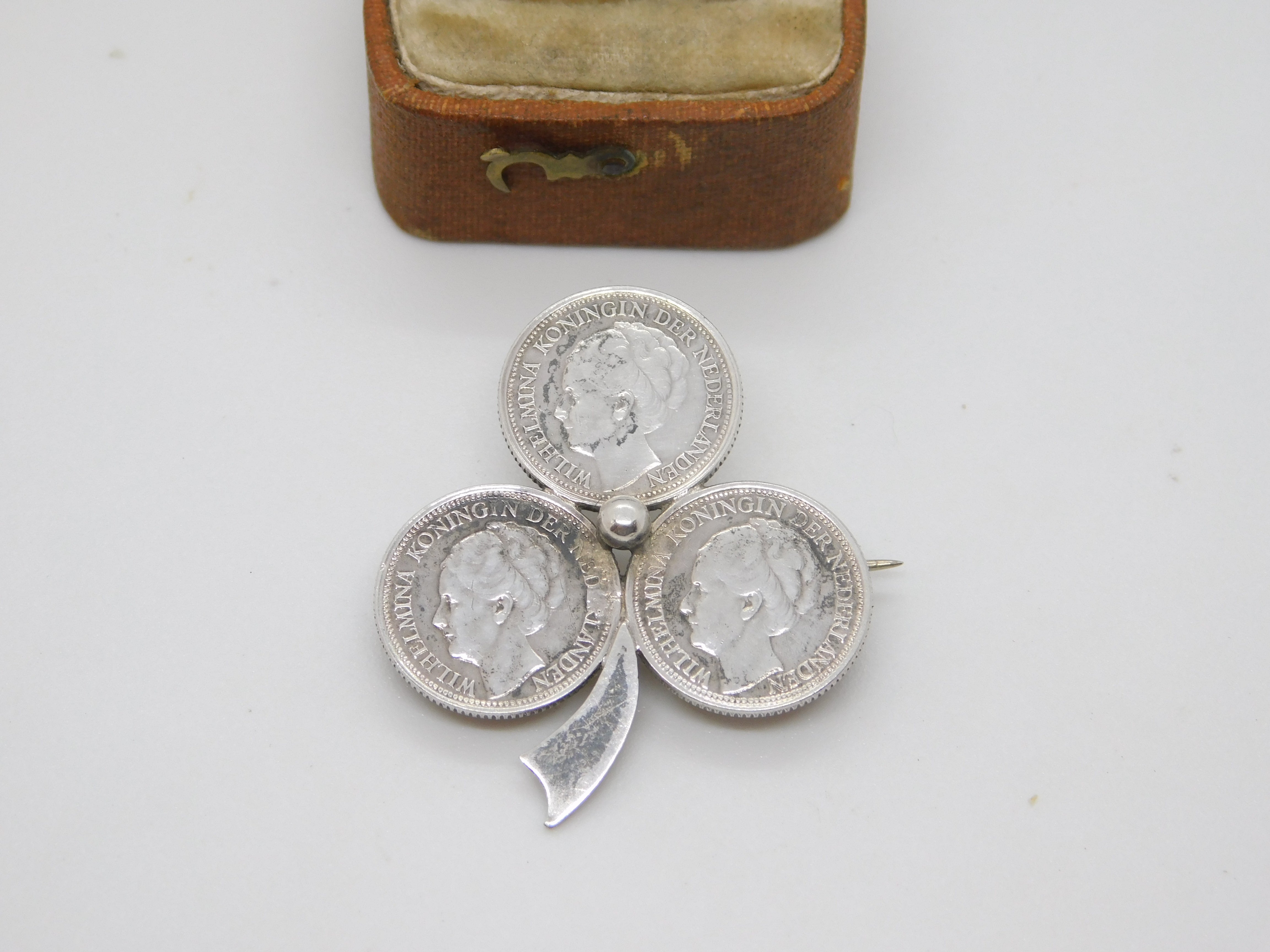 Dutch .640 Silver Queen Wilhelmina Coin Lucky Shamrock Brooch Antique 1941