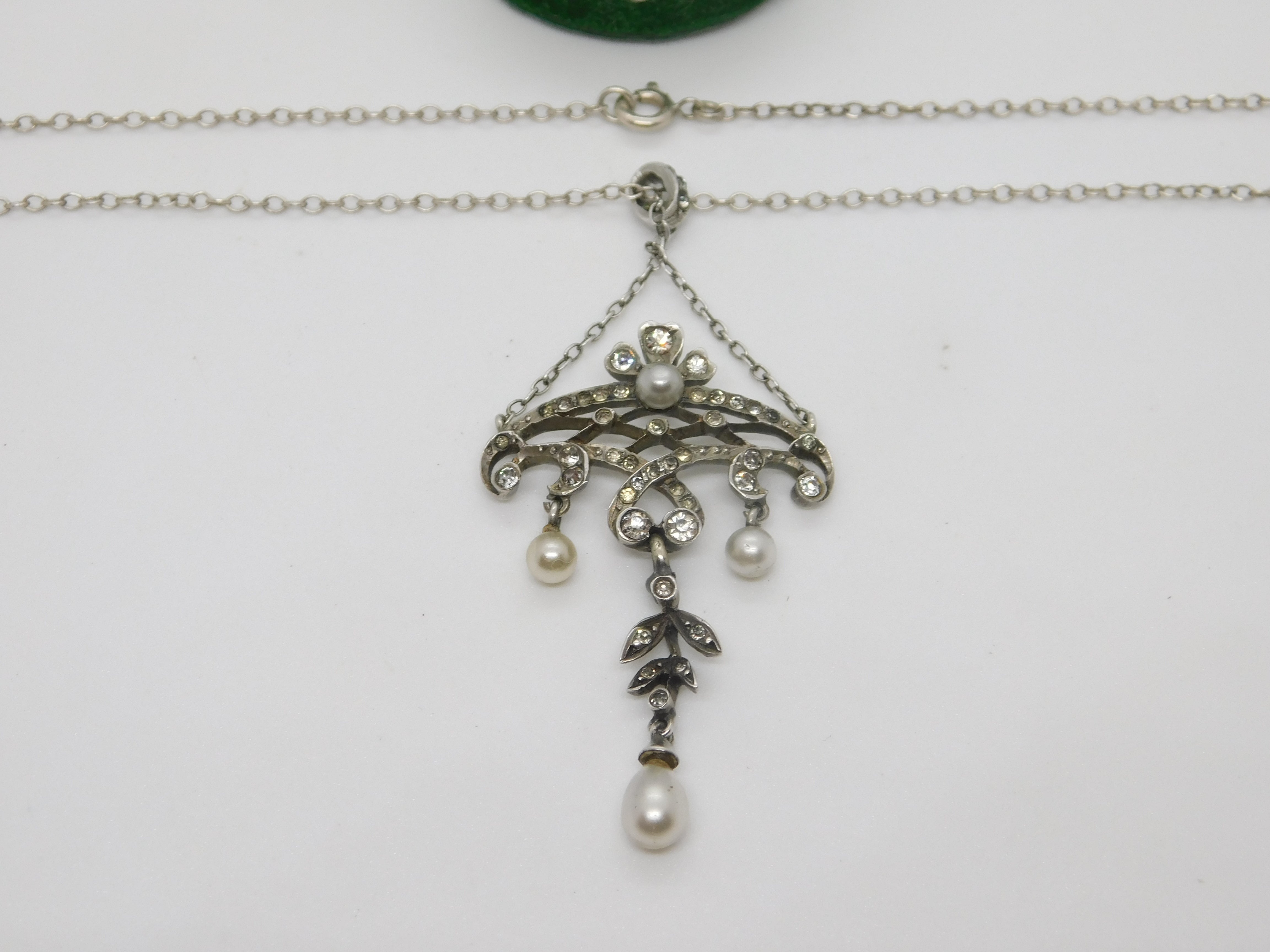 Belle Époque Sterling Silver, Paste & Pearl Set Lavalier Drop Necklace c1890