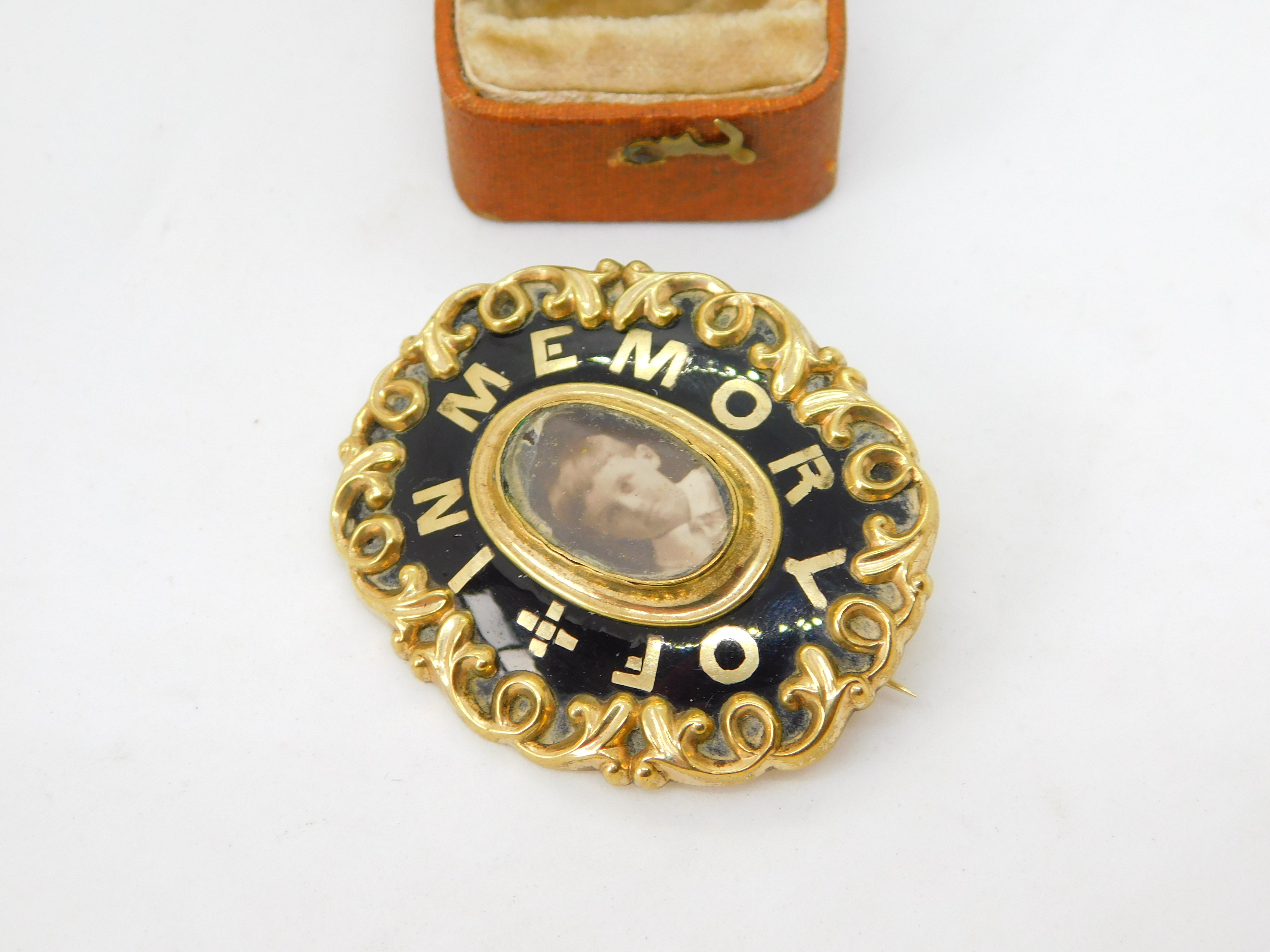 9ct Gold Cased & Black Enamel In Memory Of Mourning Brooch c1880 Antique