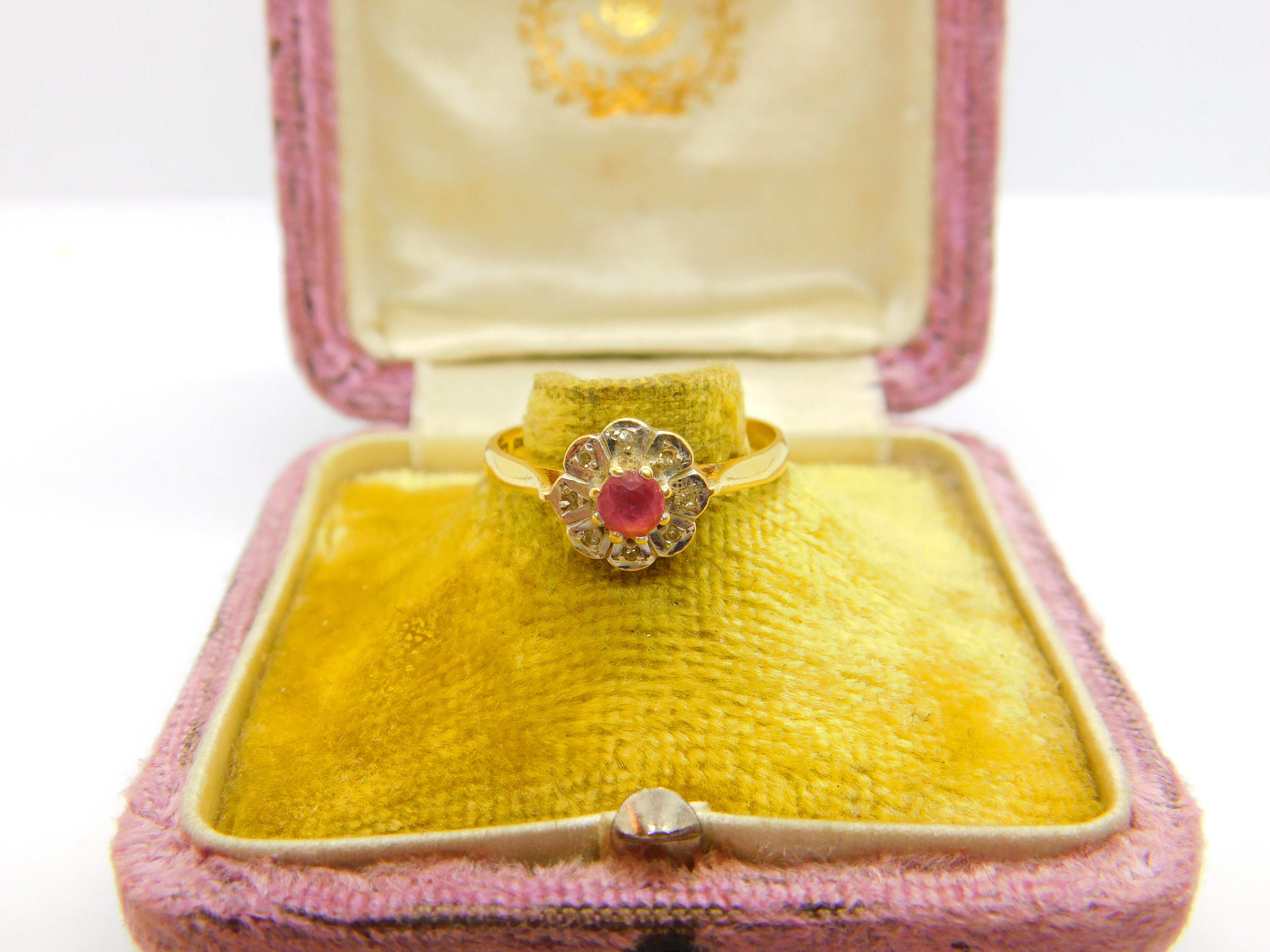 18ct Yellow Gold, Ruby & Diamond Floral Cluster Ring 1953 Birmingham Vintage