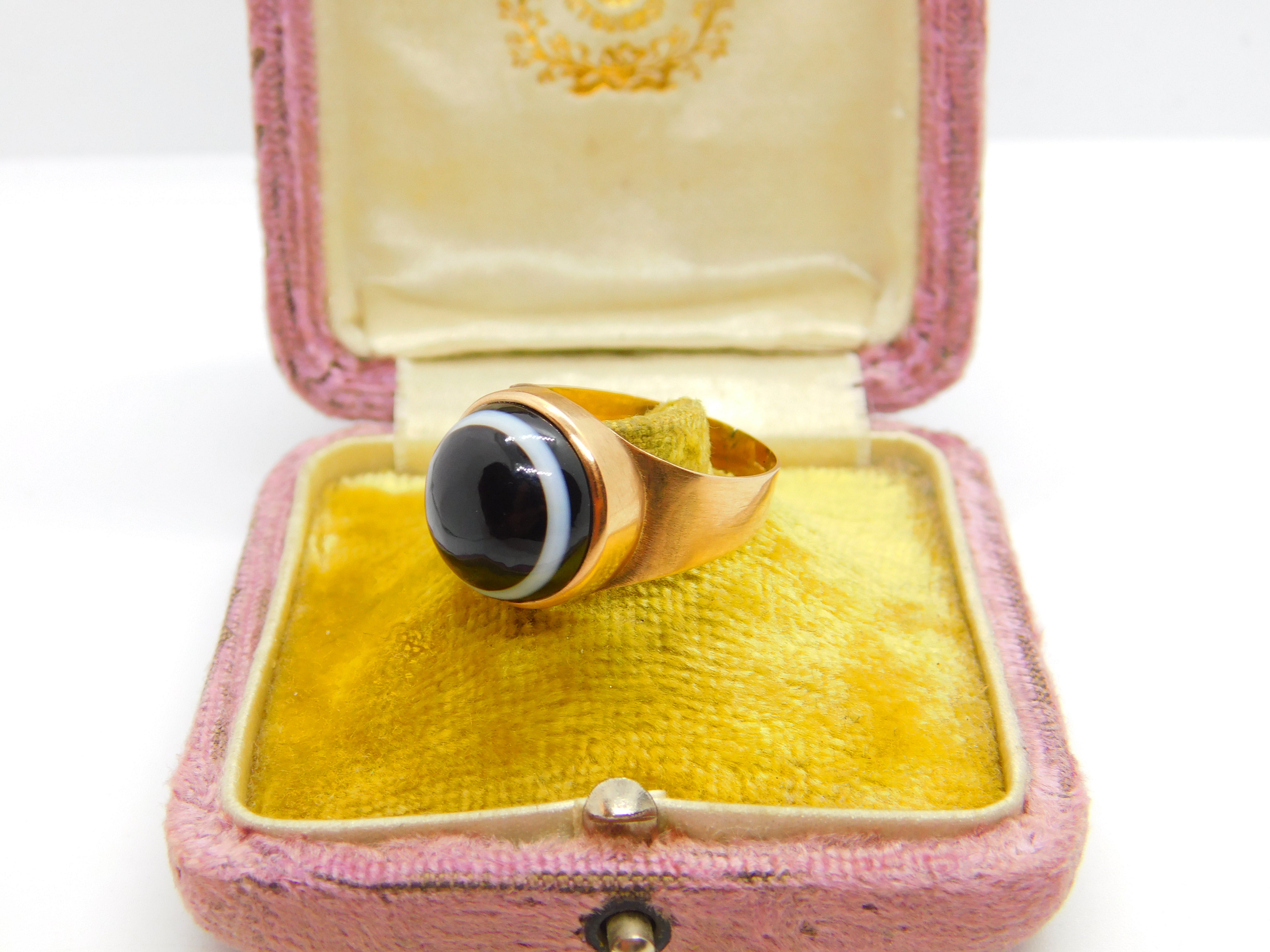 Georgian 12ct Gold Bulls Eye Agate Mourning Ring 'Charles Williams Ob. 1799, Aged 84' Antique