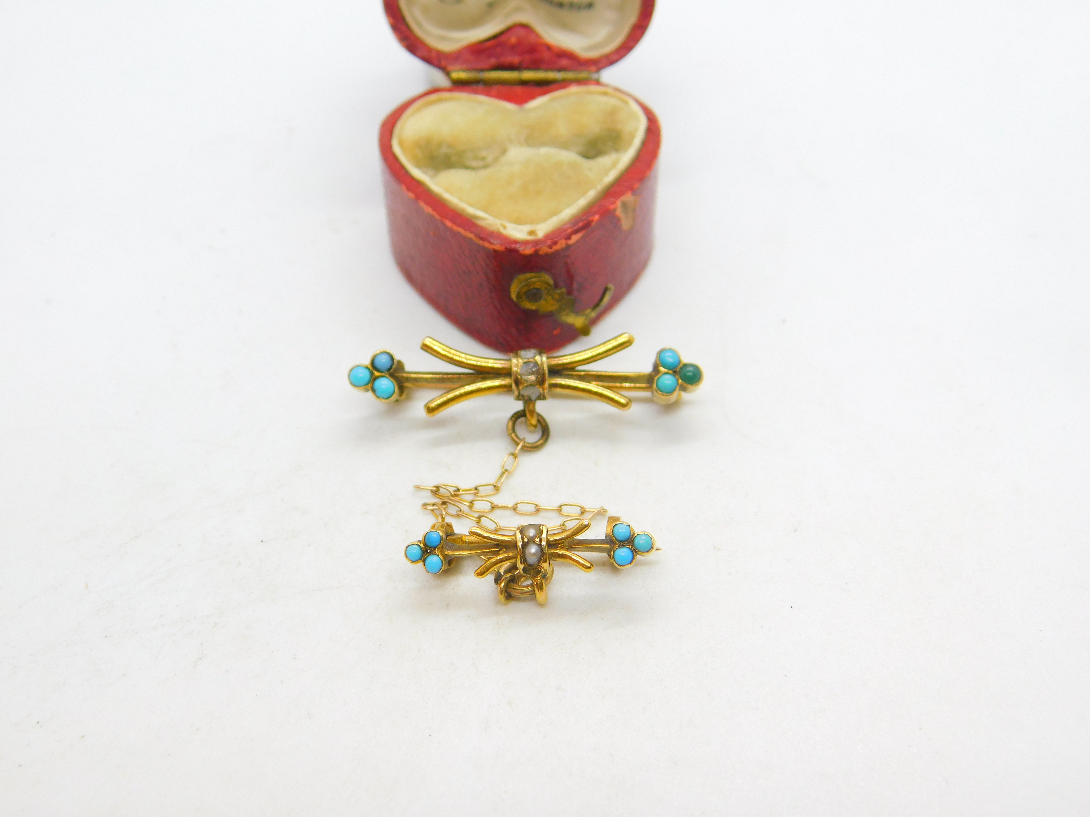 Victorian 15ct Gold, Turquoise, Diamond & Seed Pearl Double Knot Brooch c1850