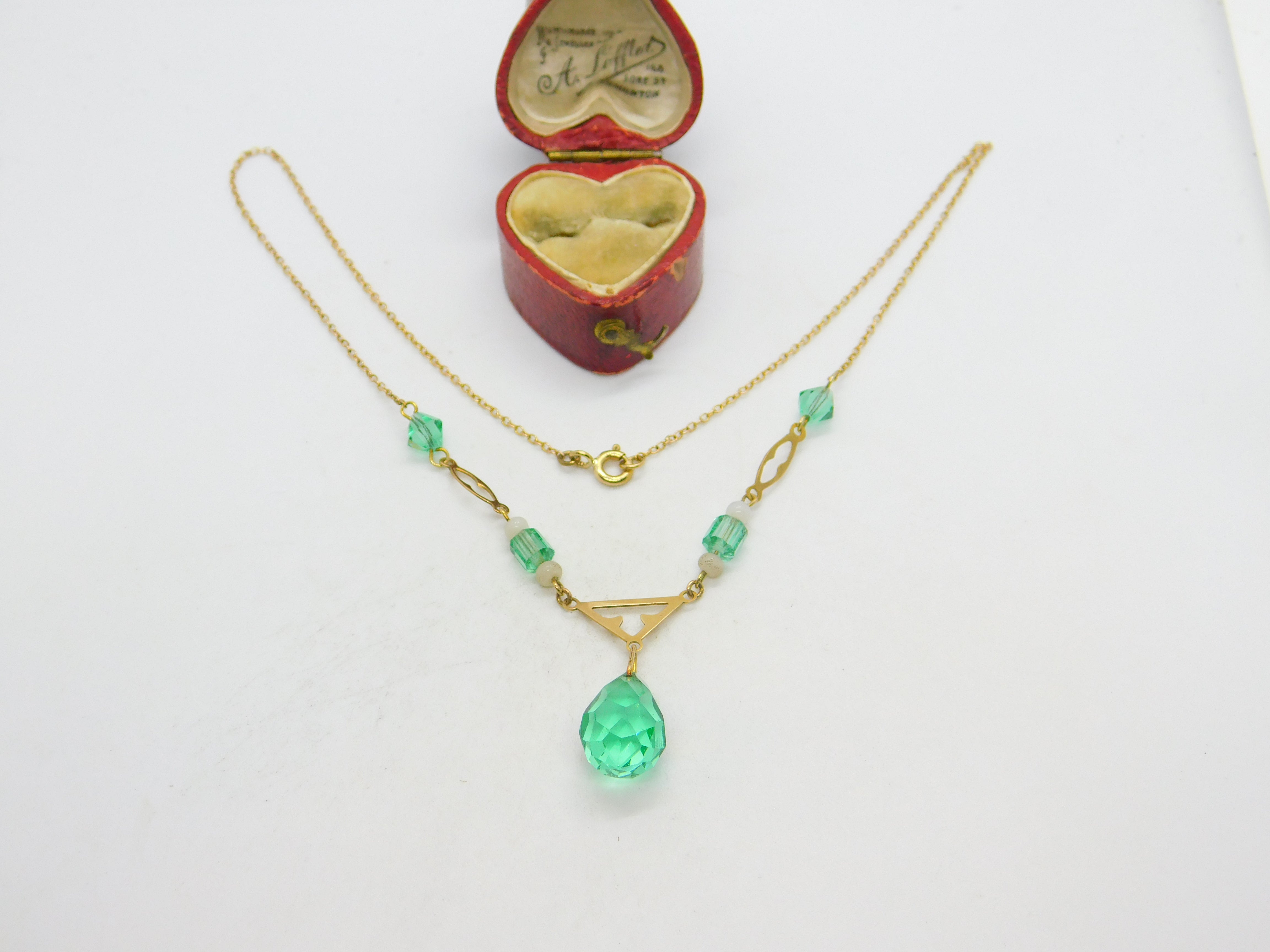 9ct Yellow Gold & Faceted Green Glass Modernist Drop Necklace Art Deco c1940