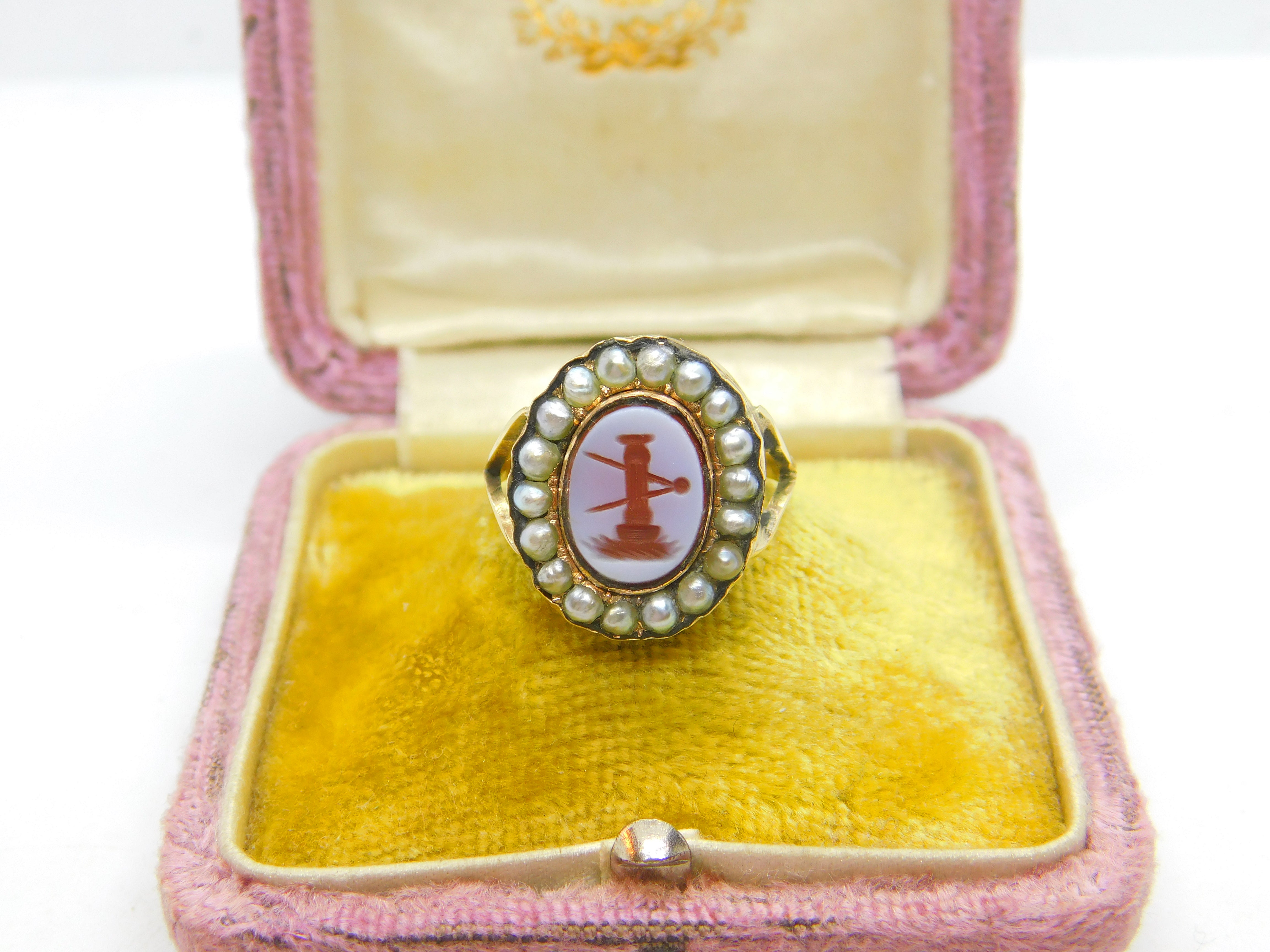 Georgian Early 15ct Yellow Gold, Seed Pearl & Sardonyx Intaglio Seal Ring c1790