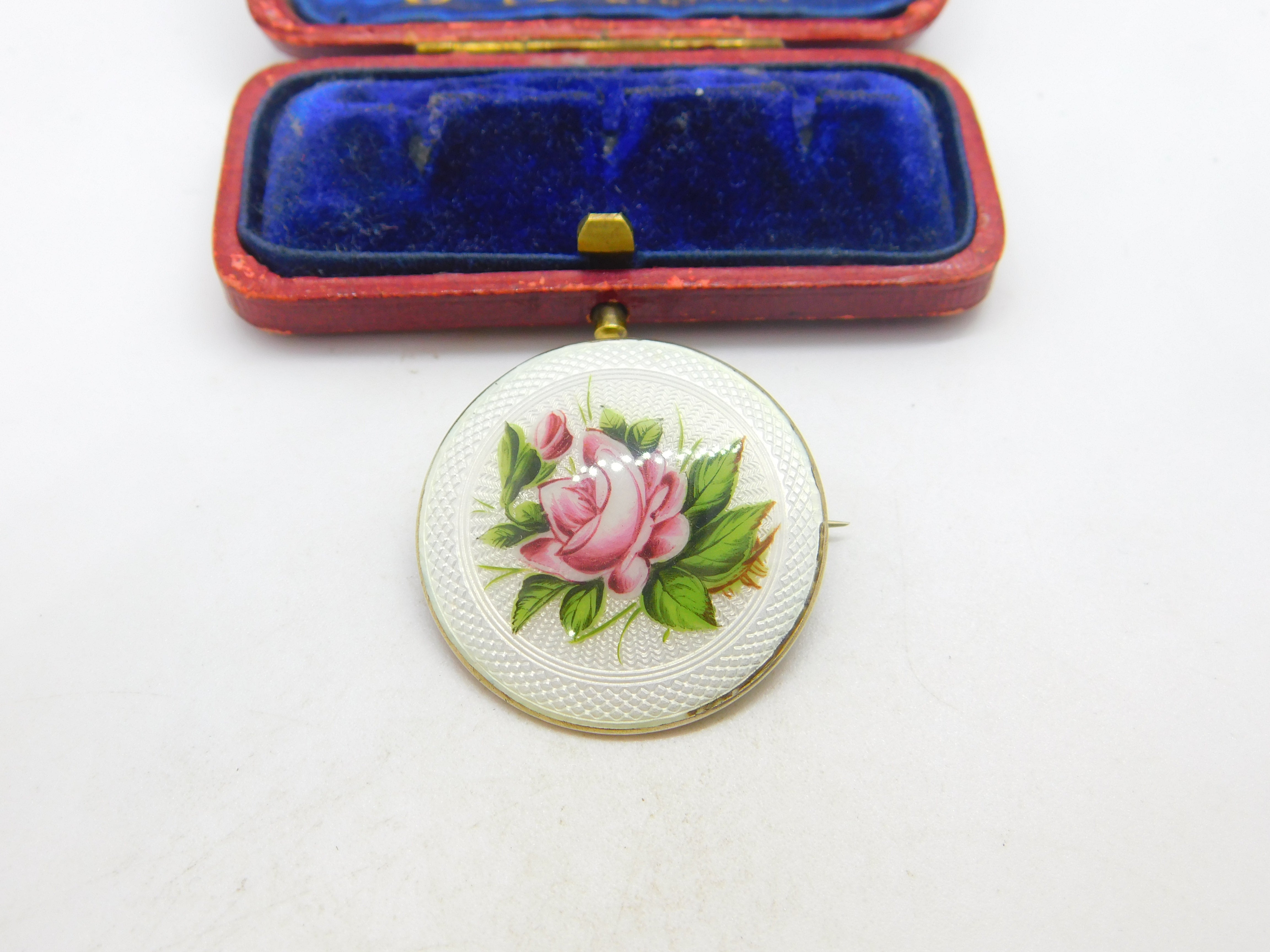 Gold on Sterling Silver Guilloche Rose Flower Enamel Brooch 1912 Birmingham