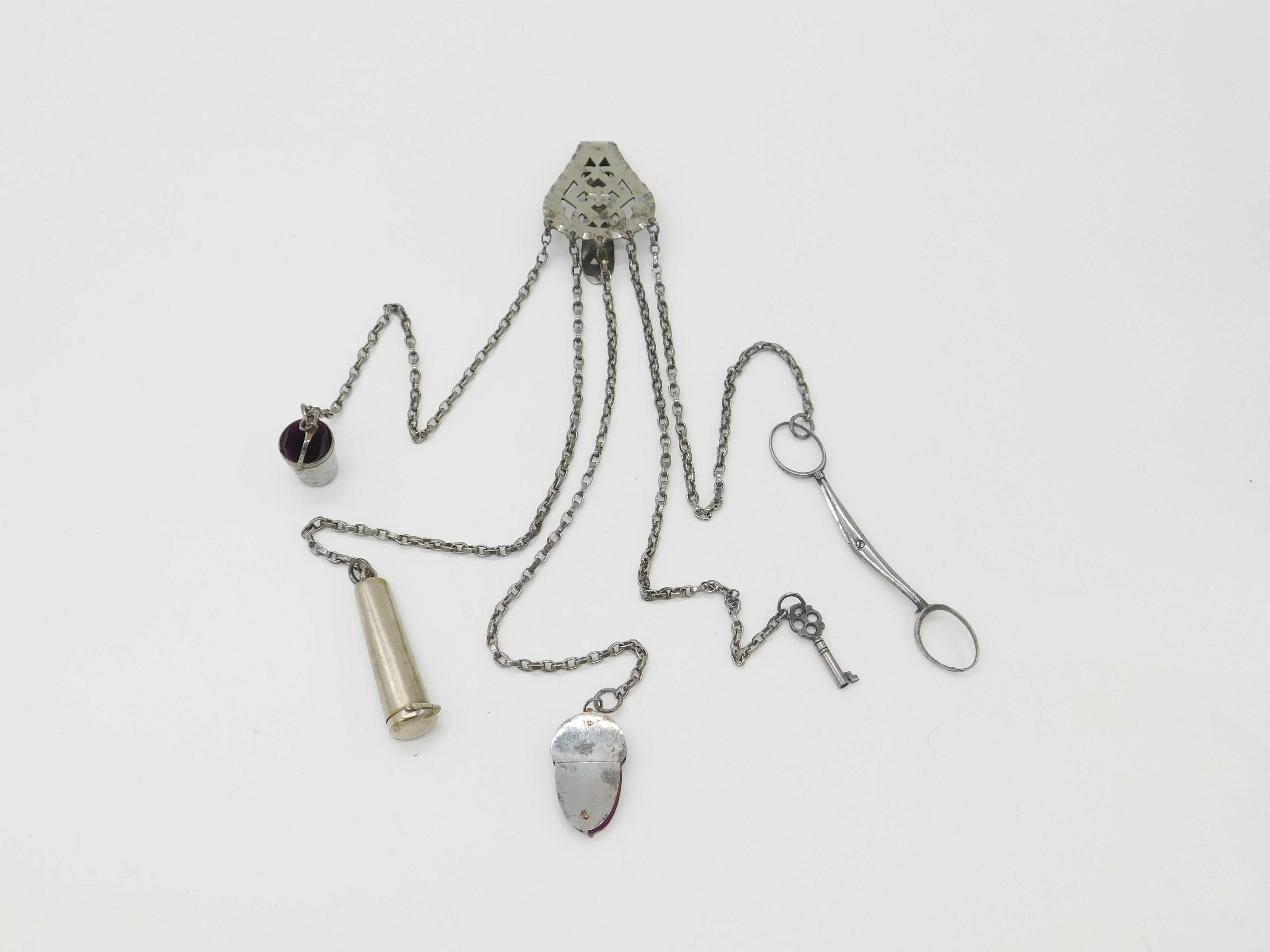 Large Victorian Cut Steel Sewing Chatelaine with Multiple Tools Antique c1850