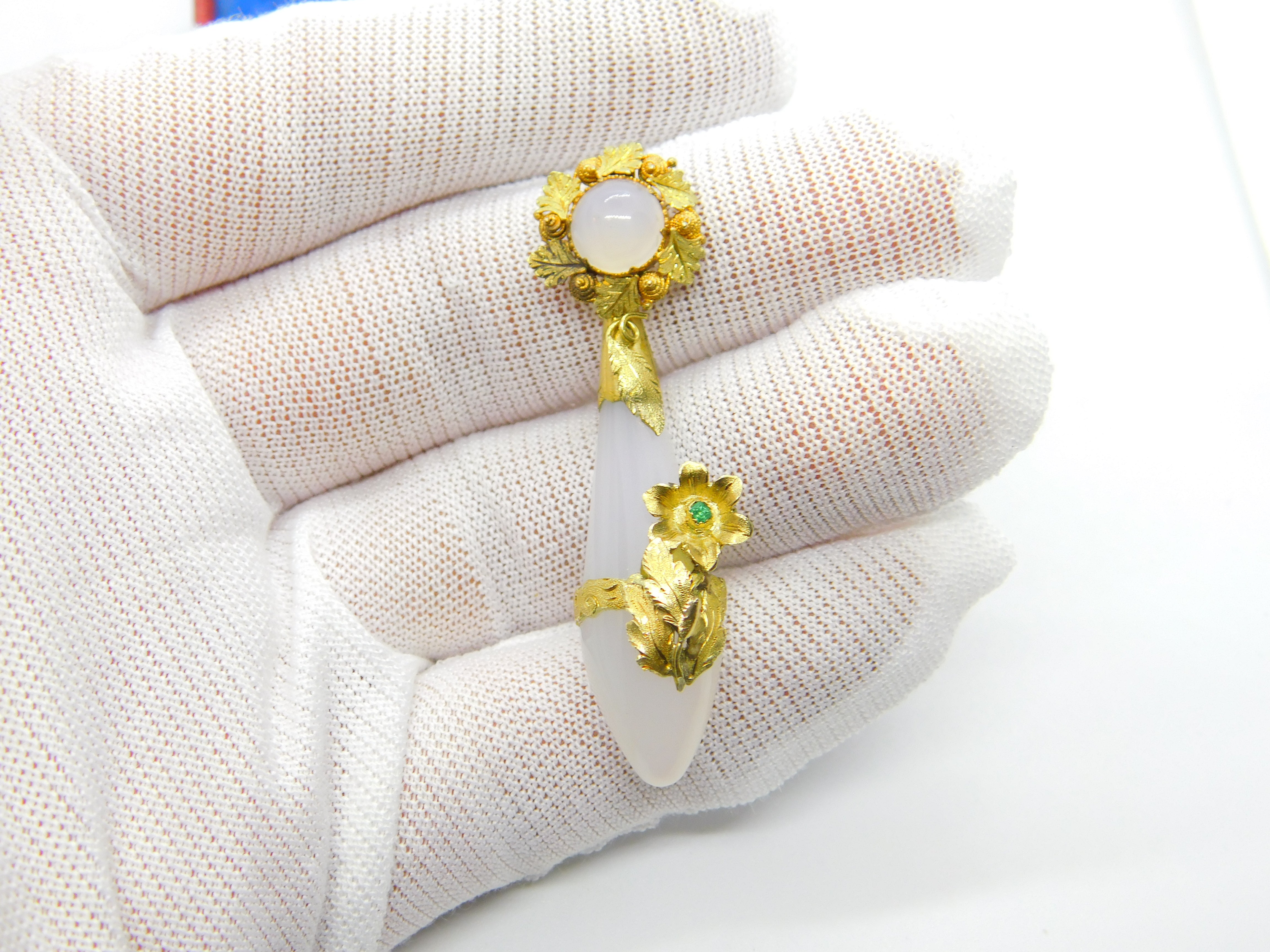 Early Victorian 18ct Gold, Carved Chalcedony & Emerald Floral Pendant c1840
