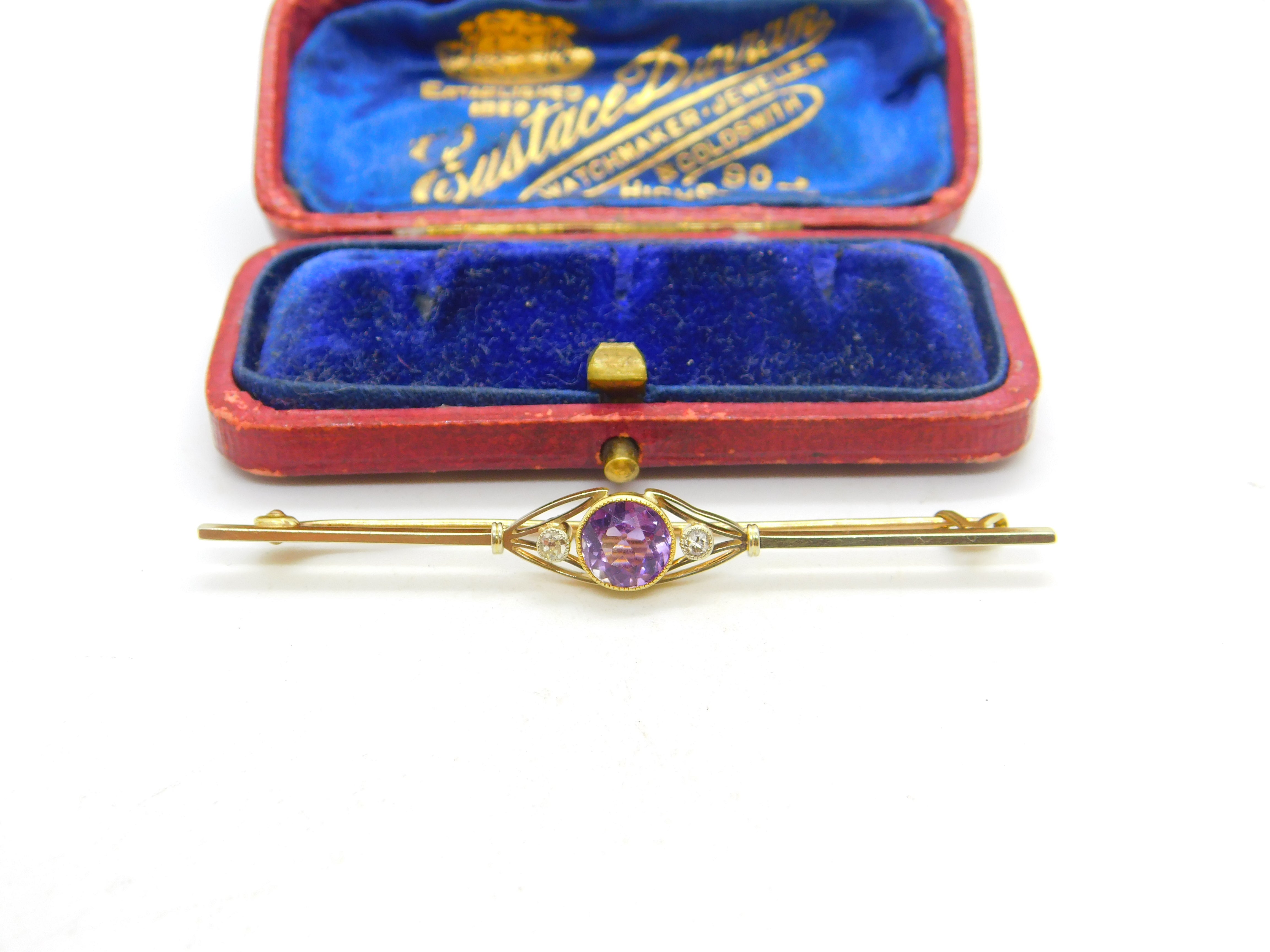Edwardian 15ct Gold, Amethyst & Diamond Bar Brooch Antique c1910