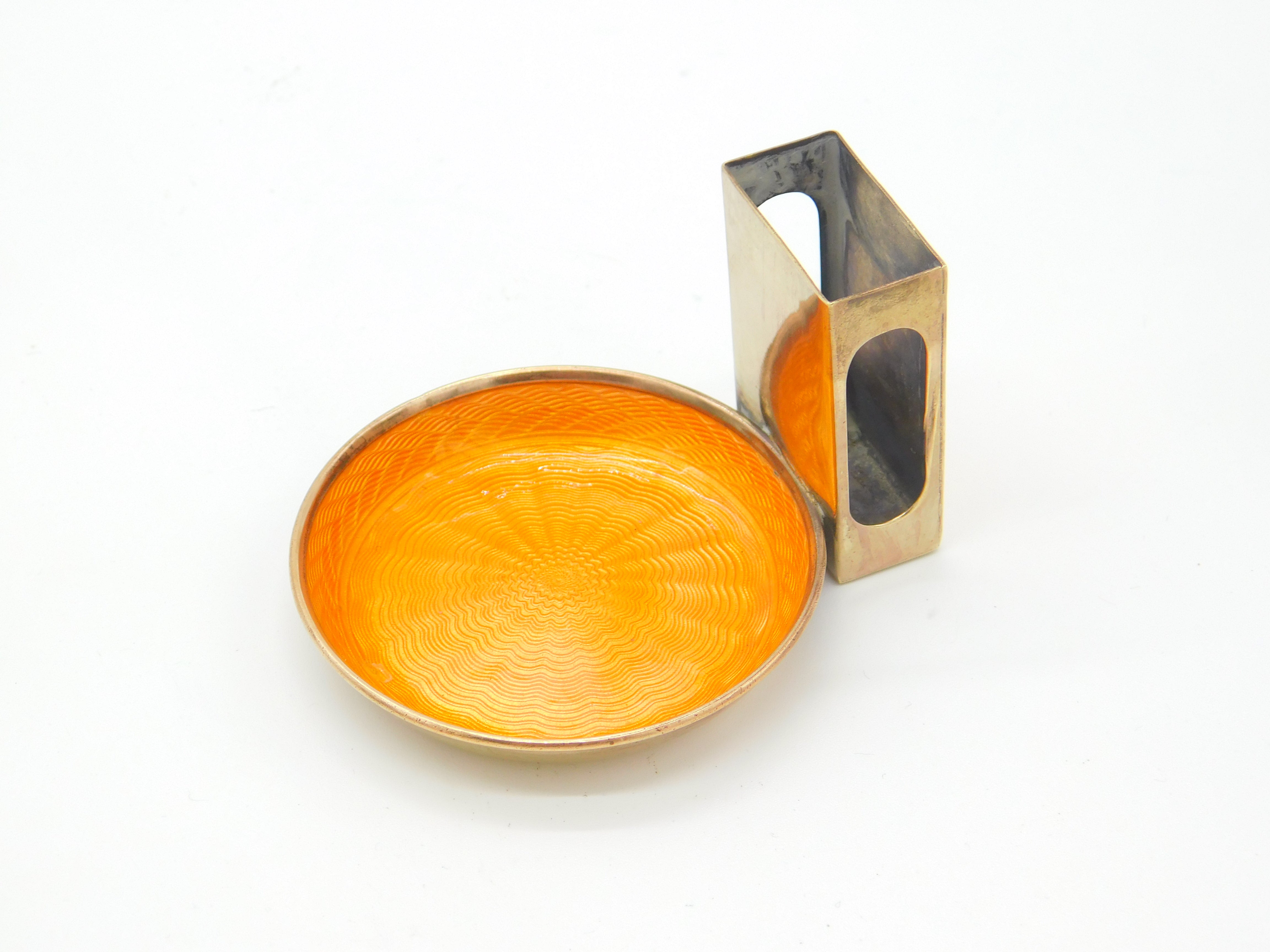 Gold Plated Orange Guilloche Enamel Ashtray & Match Box Holder c1920 Art Deco