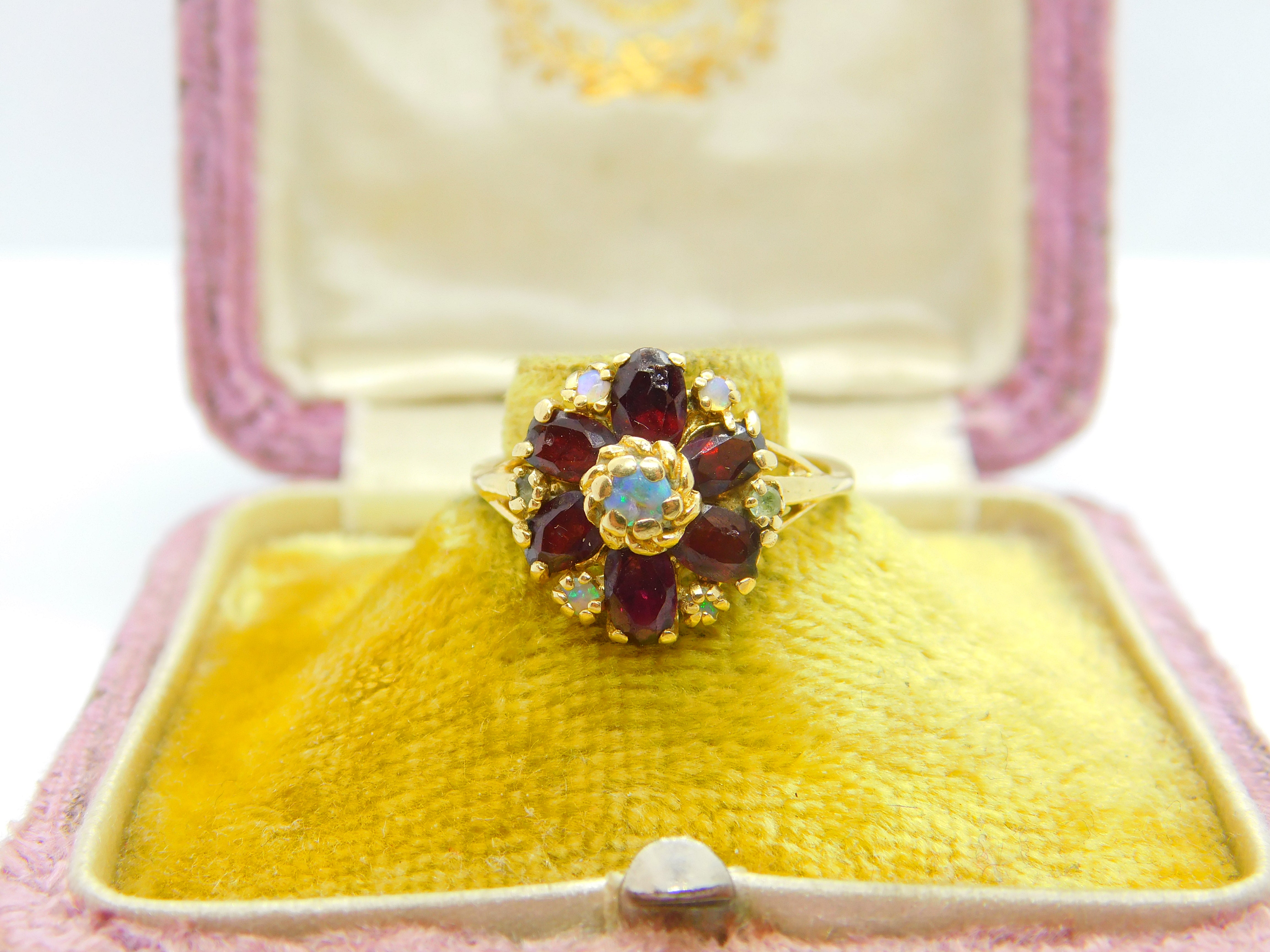 14ct Gold, Almandine Garnet & Water Opal Cluster Ring Antique c1920 Art Deco
