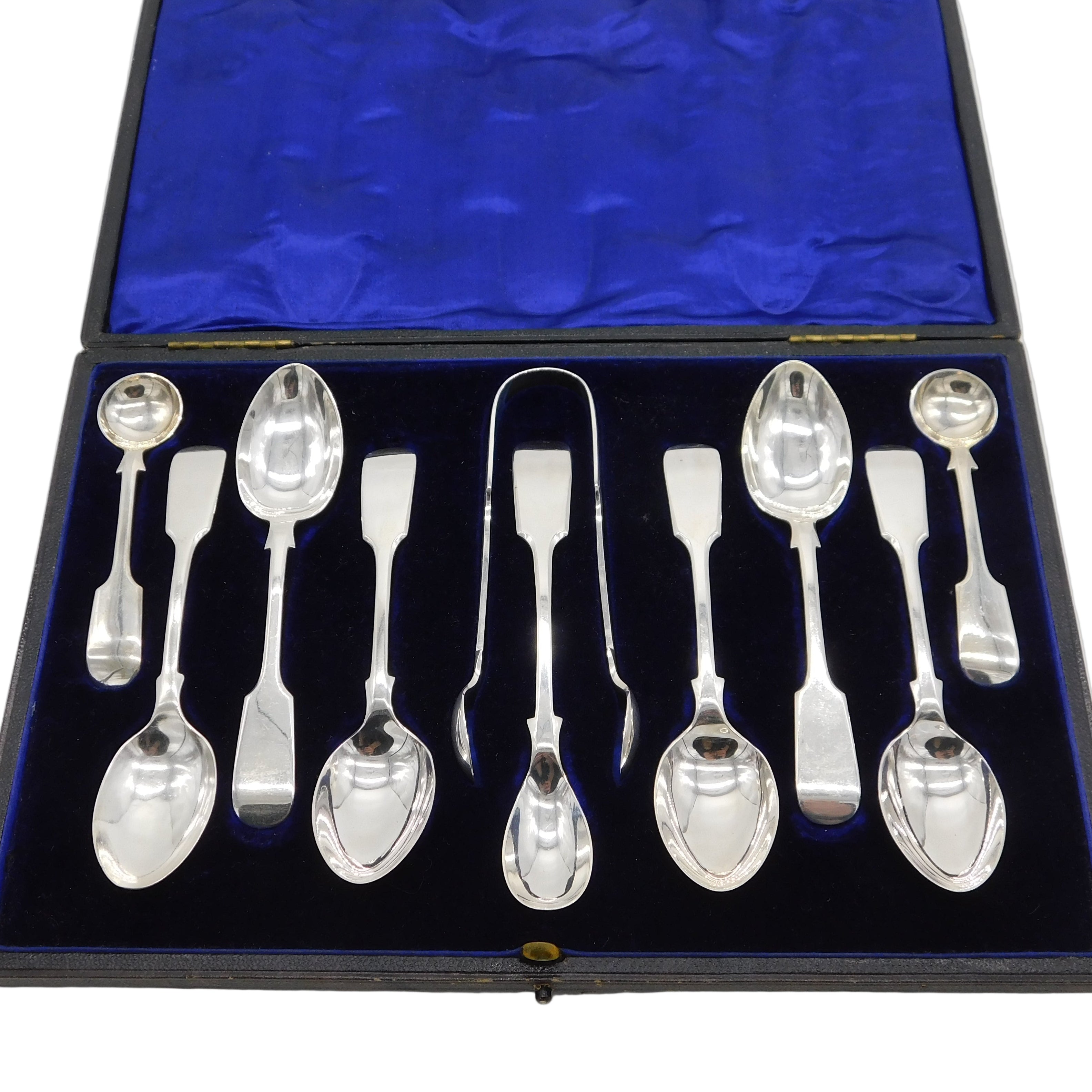 Edwardian Boxed Sterling Silver Teaspoons, Tongs & Mustards Set 1905 Sheffield