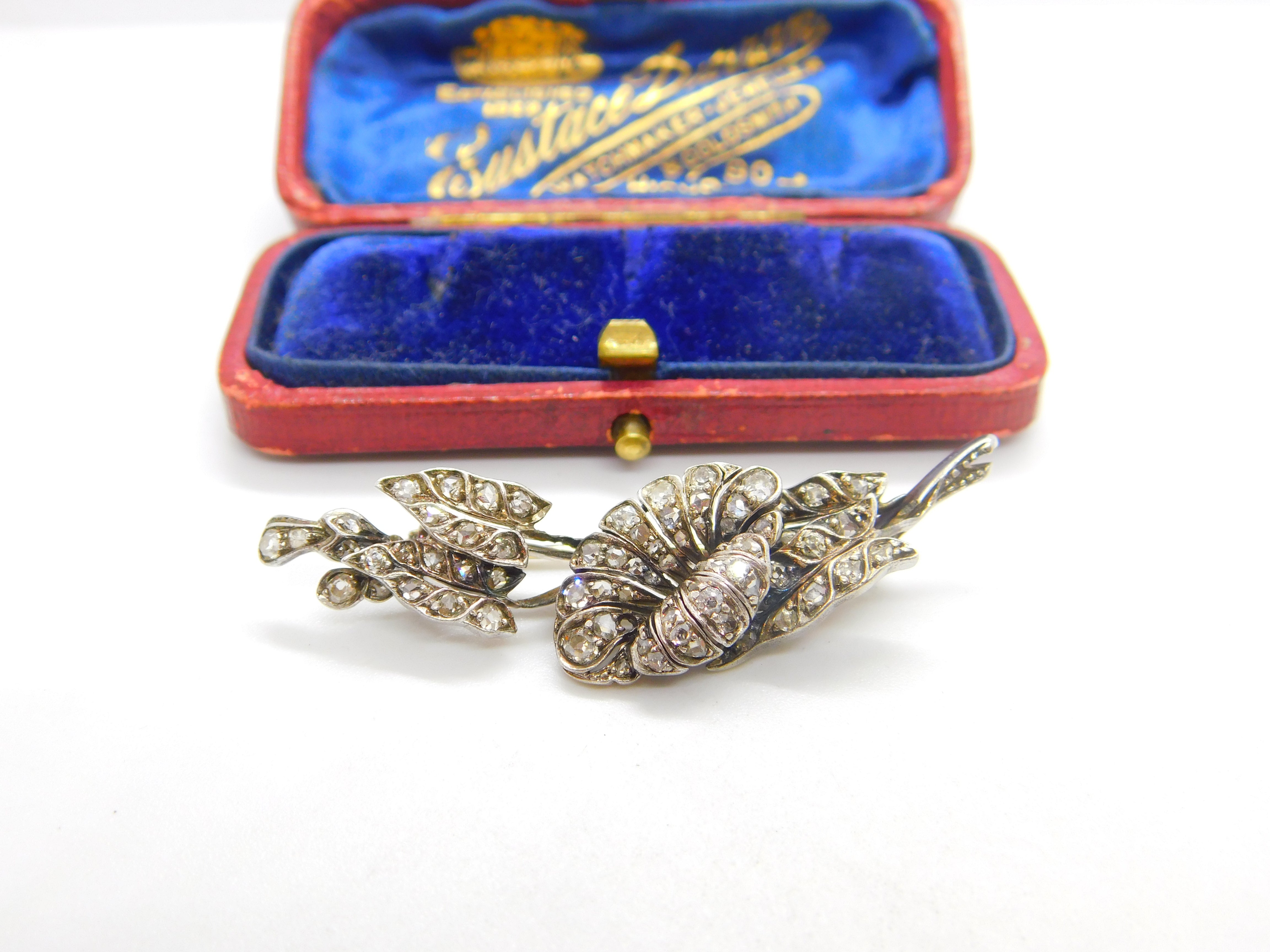 Art Nouveau 14ct Yellow Gold & Pave Set 1.1ct Diamond Floral Brooch c1880 Antique