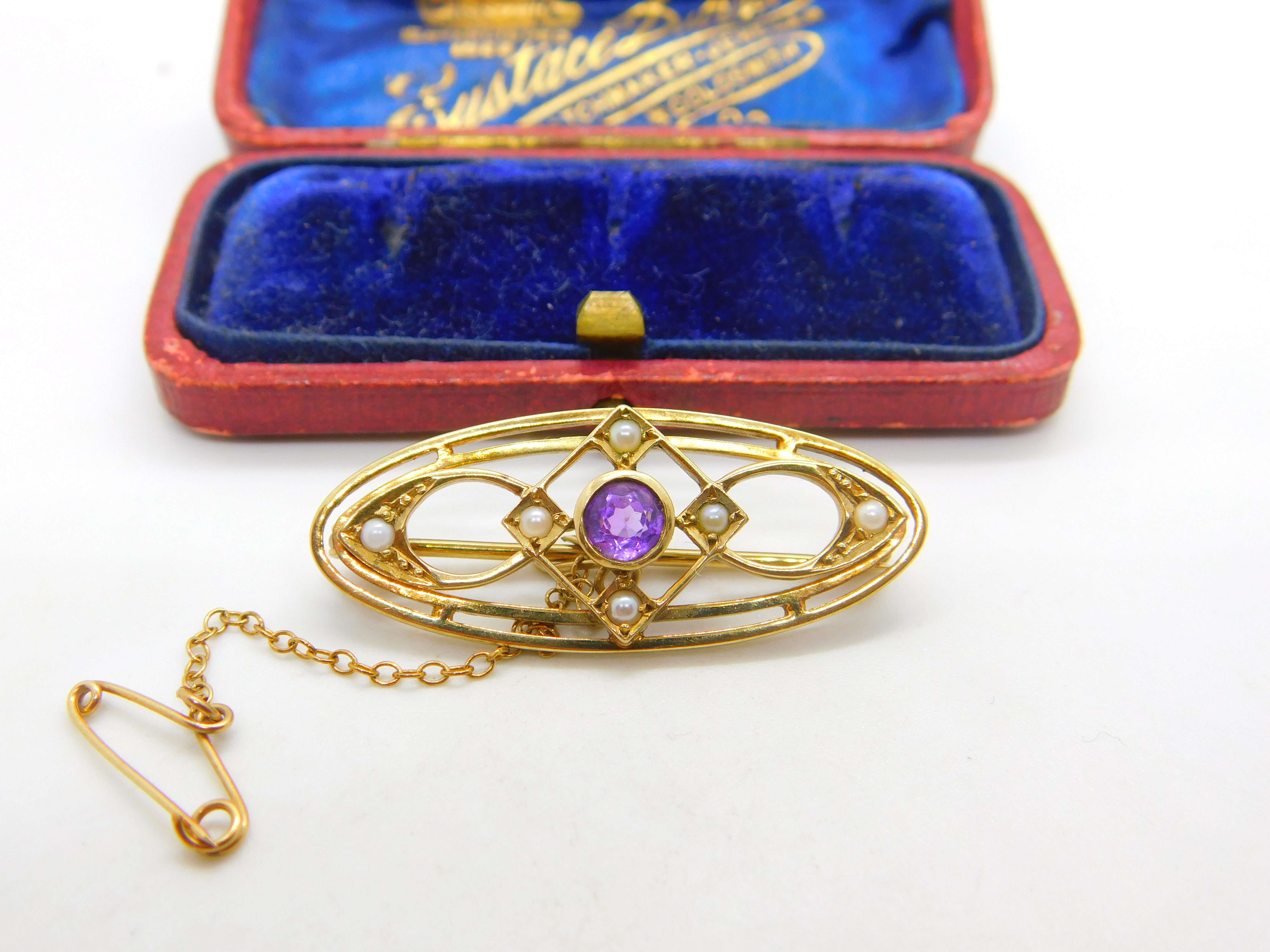 Edwardian 9ct Gold, Seed Pearl & Amethyst Sweetheart Brooch Antique c1910