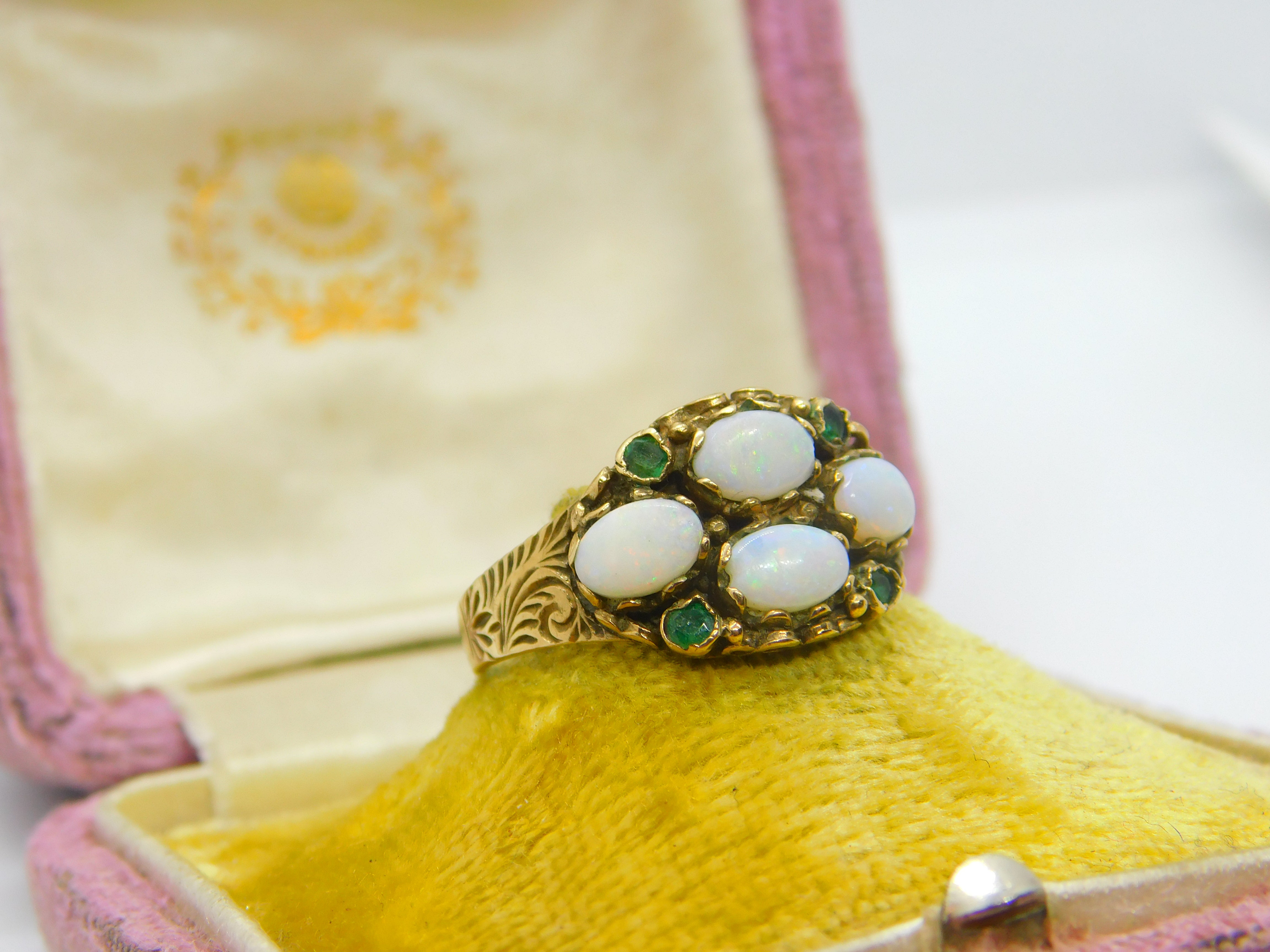 9ct Yellow Gold, Cabochon Opal & Emerald Statement Ring 1993 Birmingham