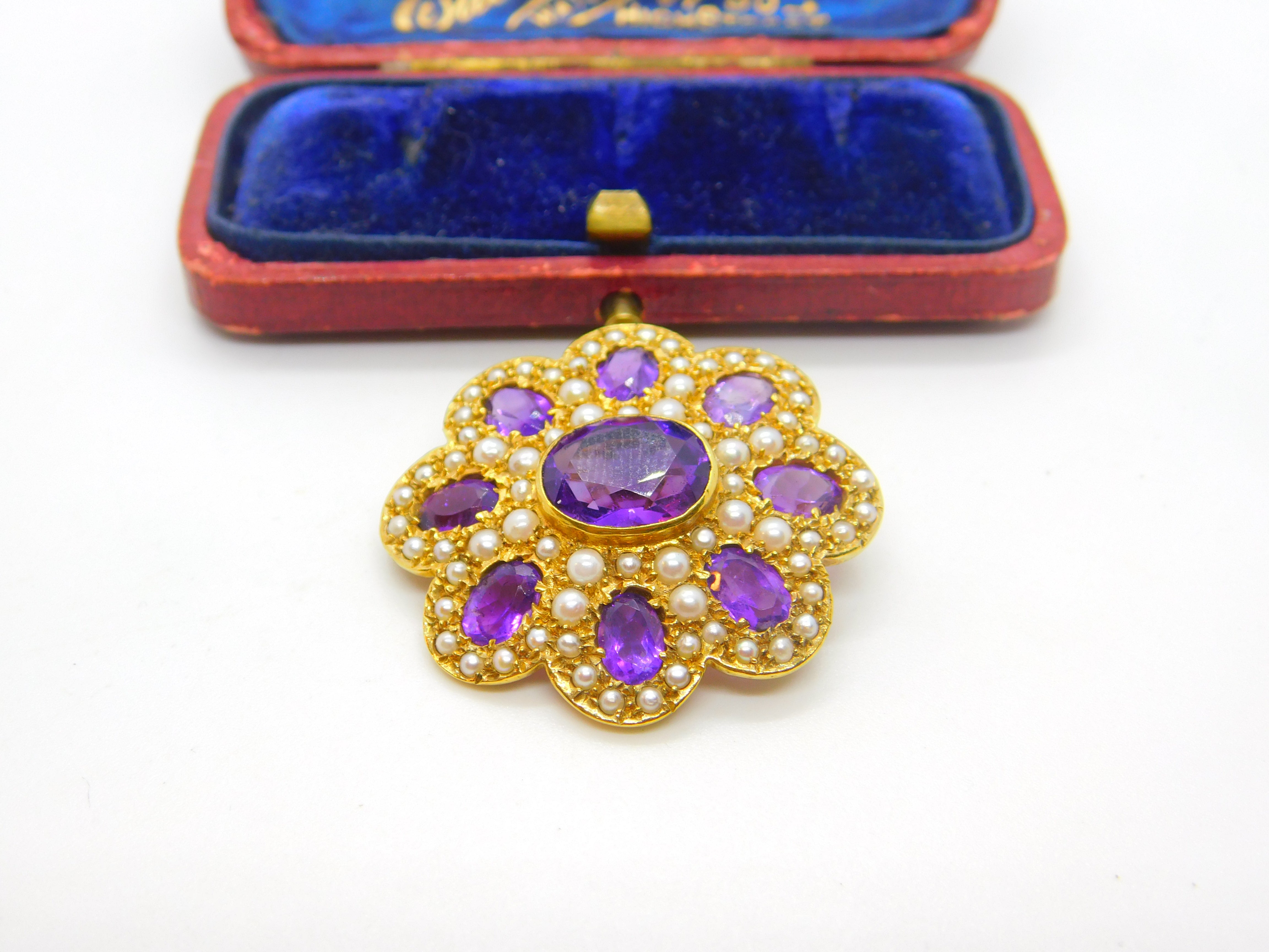 Victorian Revival 9ct Gold, Amethyst & Seed Pearl Floral Brooch 1972 London