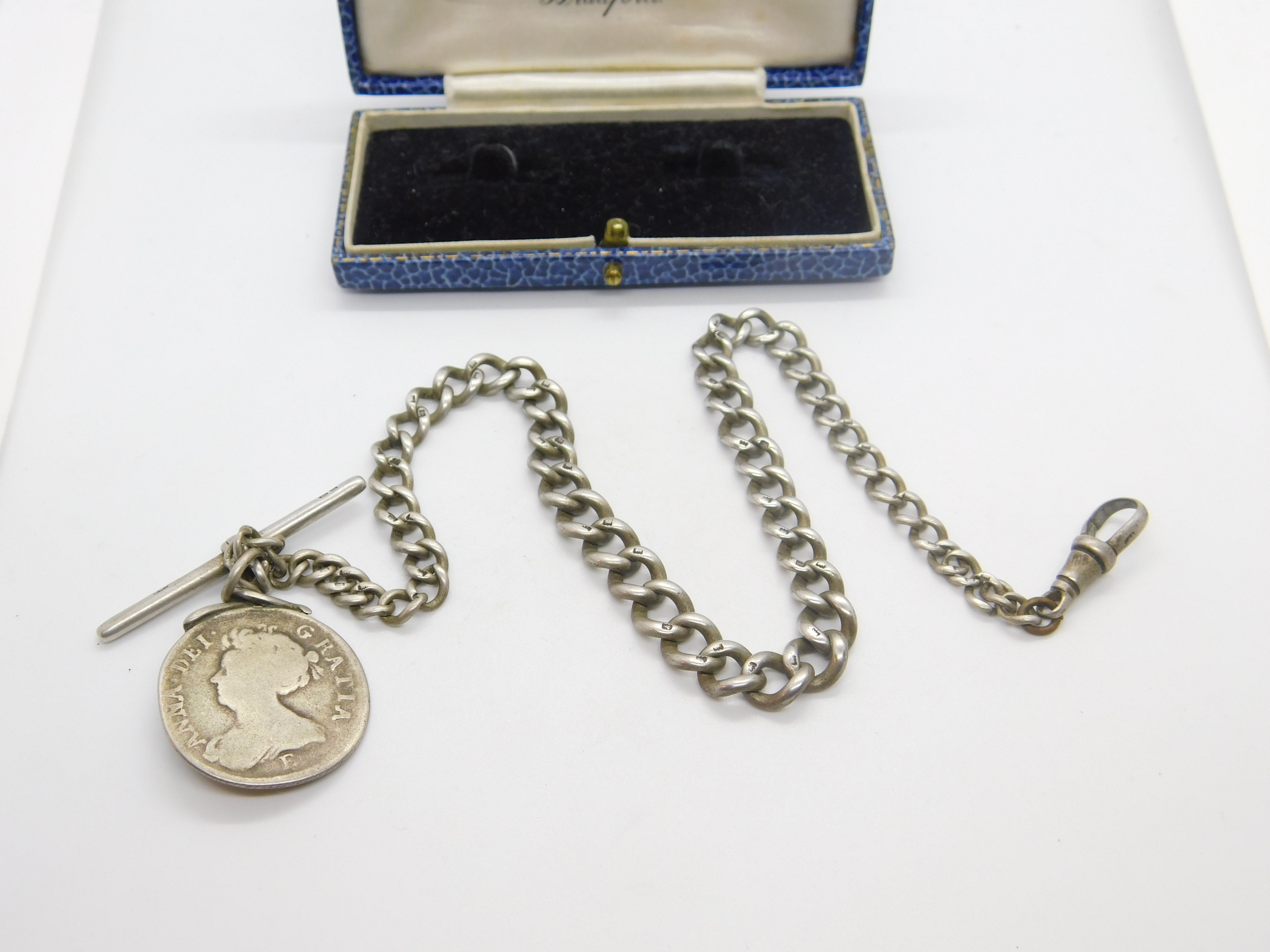 Sterling Silver Graduating Albert Watch Chain with Queen Anne 1707 Shilling Fob
