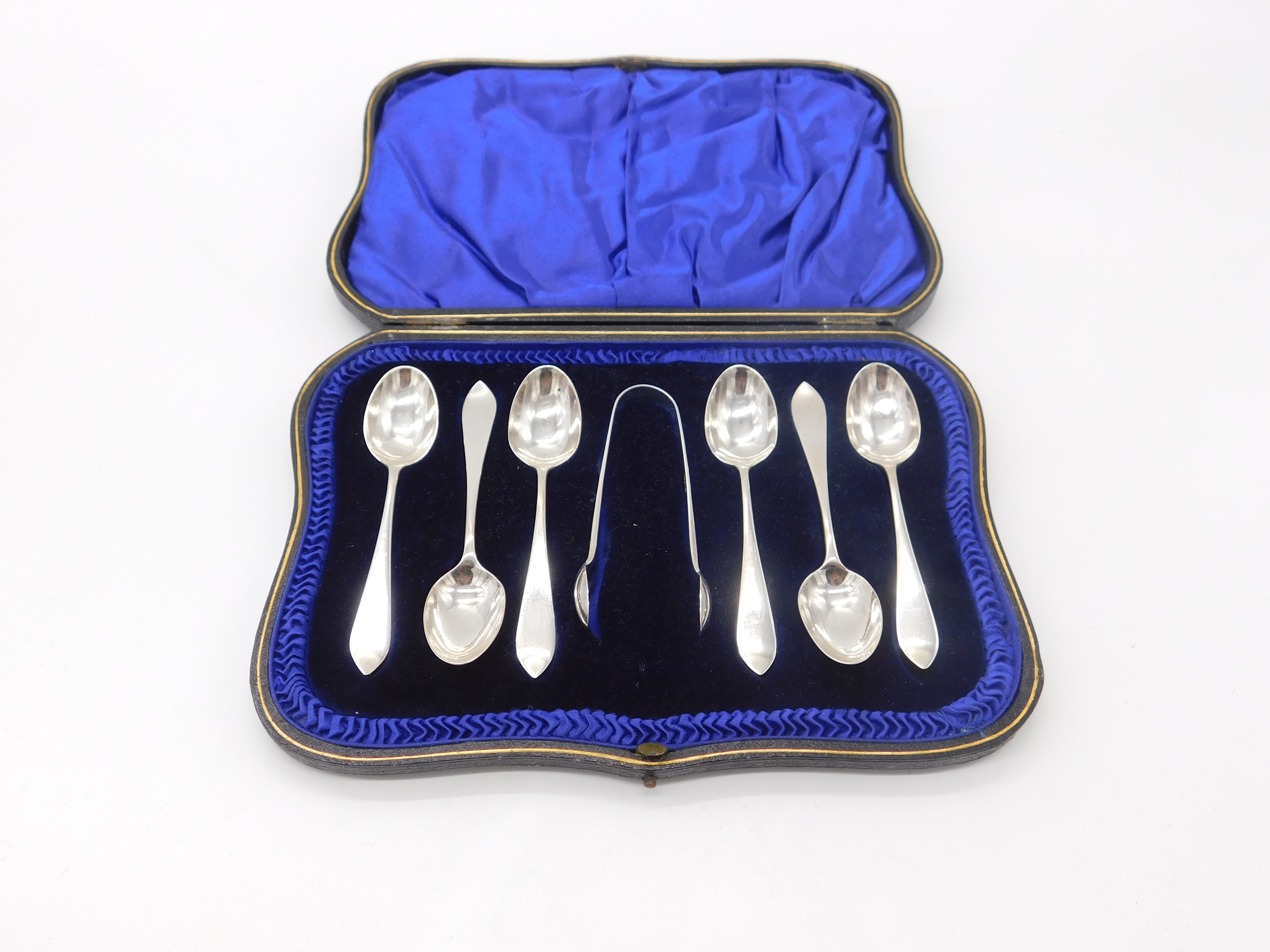 Boxed Set of Sterling Silver Tea Spoons & Tongs Antique 1914 London Art Deco