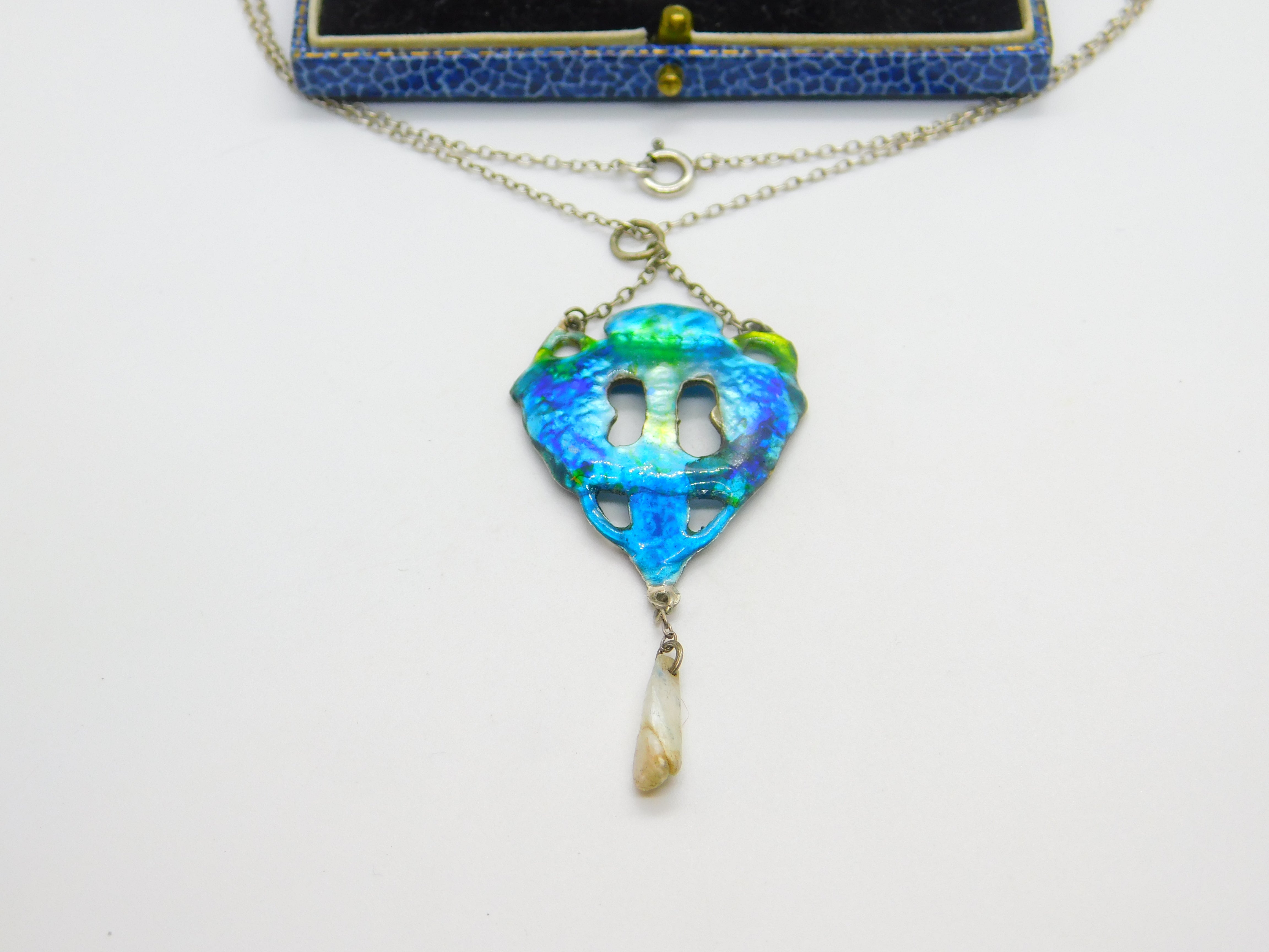 Victorian Art Nouveau Sterling Silver & Blue-Green Enamel Pearl Drop Pendant c1890