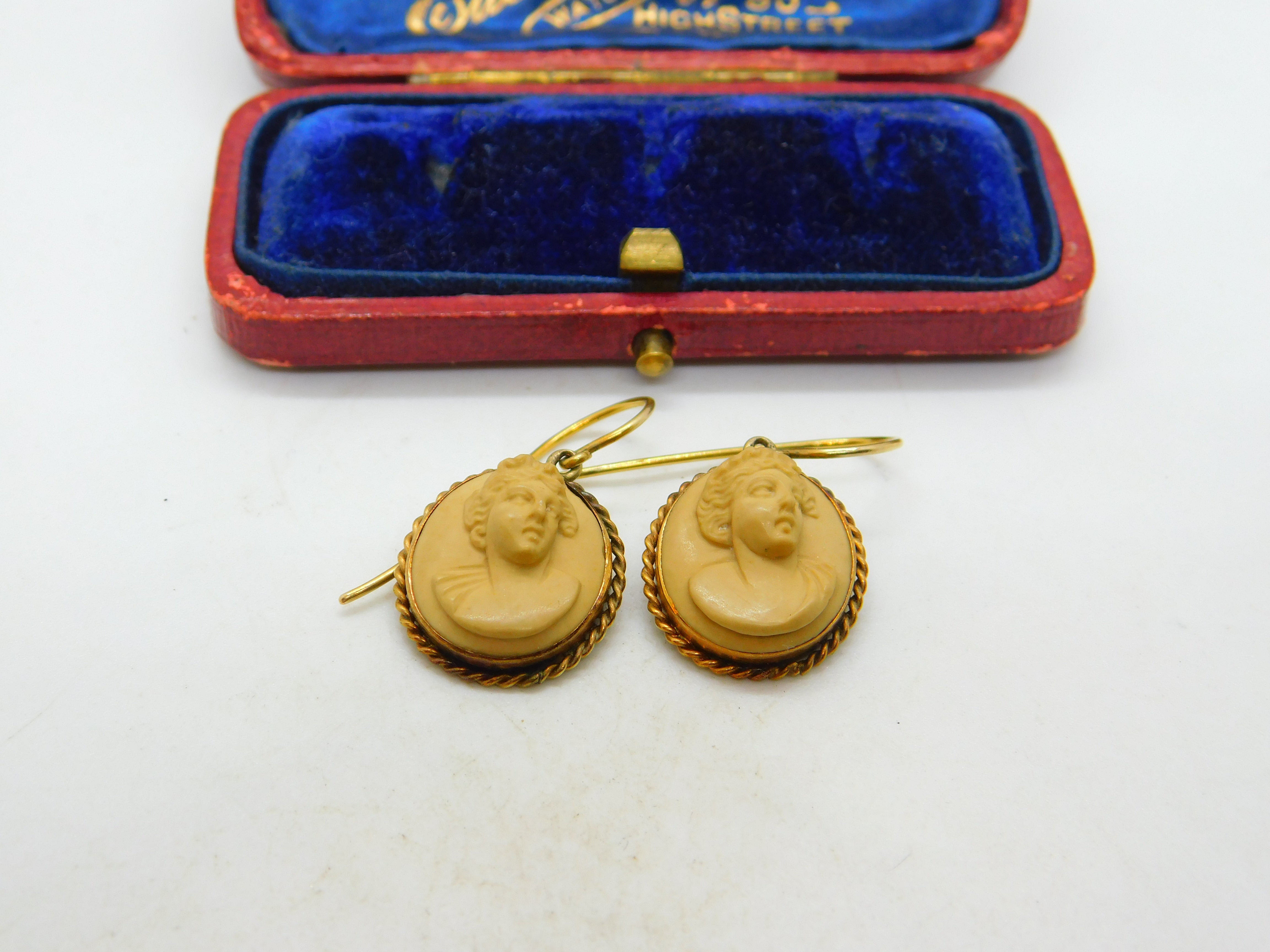 Regency Grand Tour 9ct Gold Carved Lava Female Cameo Earrings Antique c1830