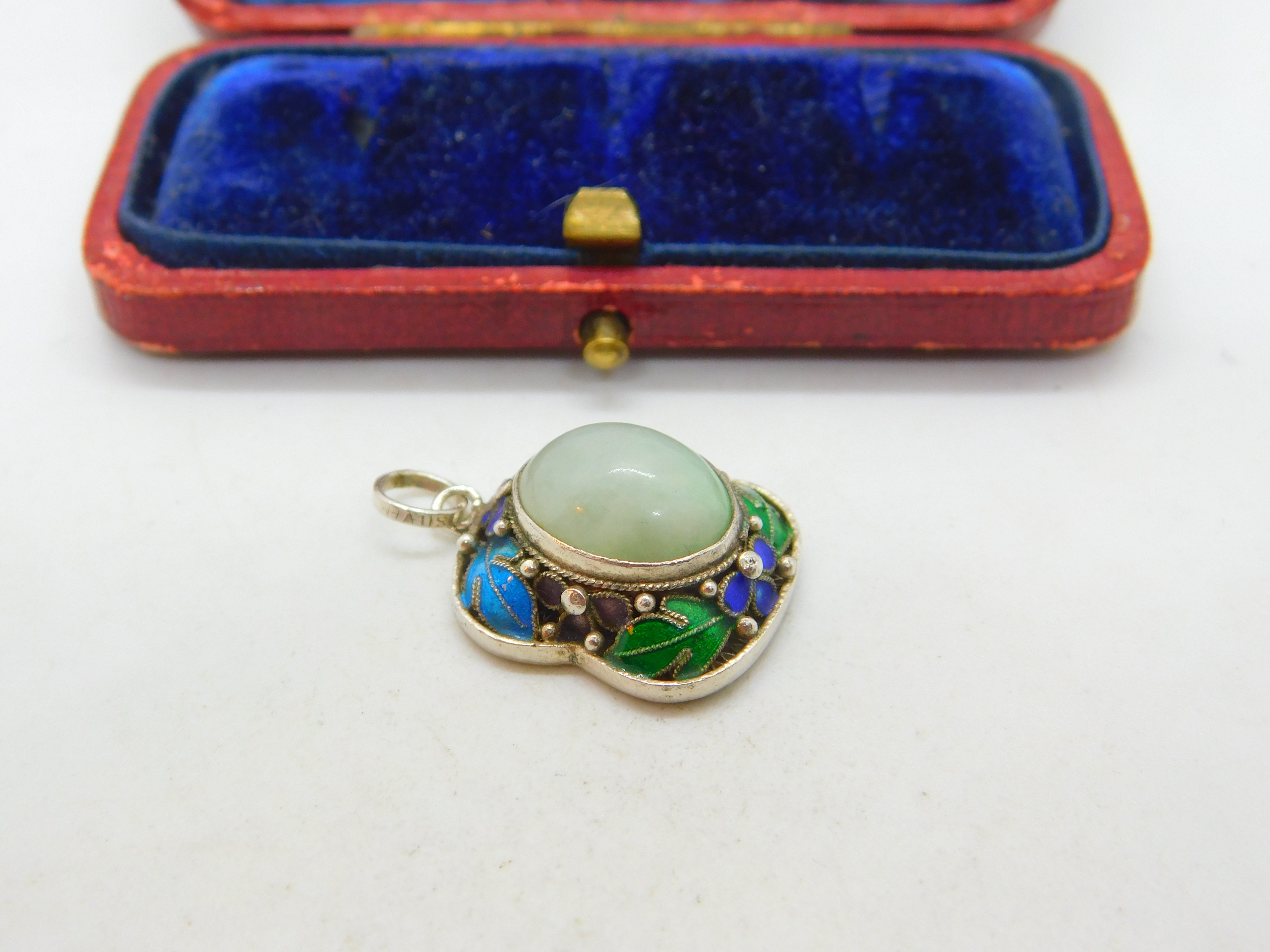 Chinese Export Mutton Fat Jade Enamel and Sterling Silver Pendant Vintage c1950