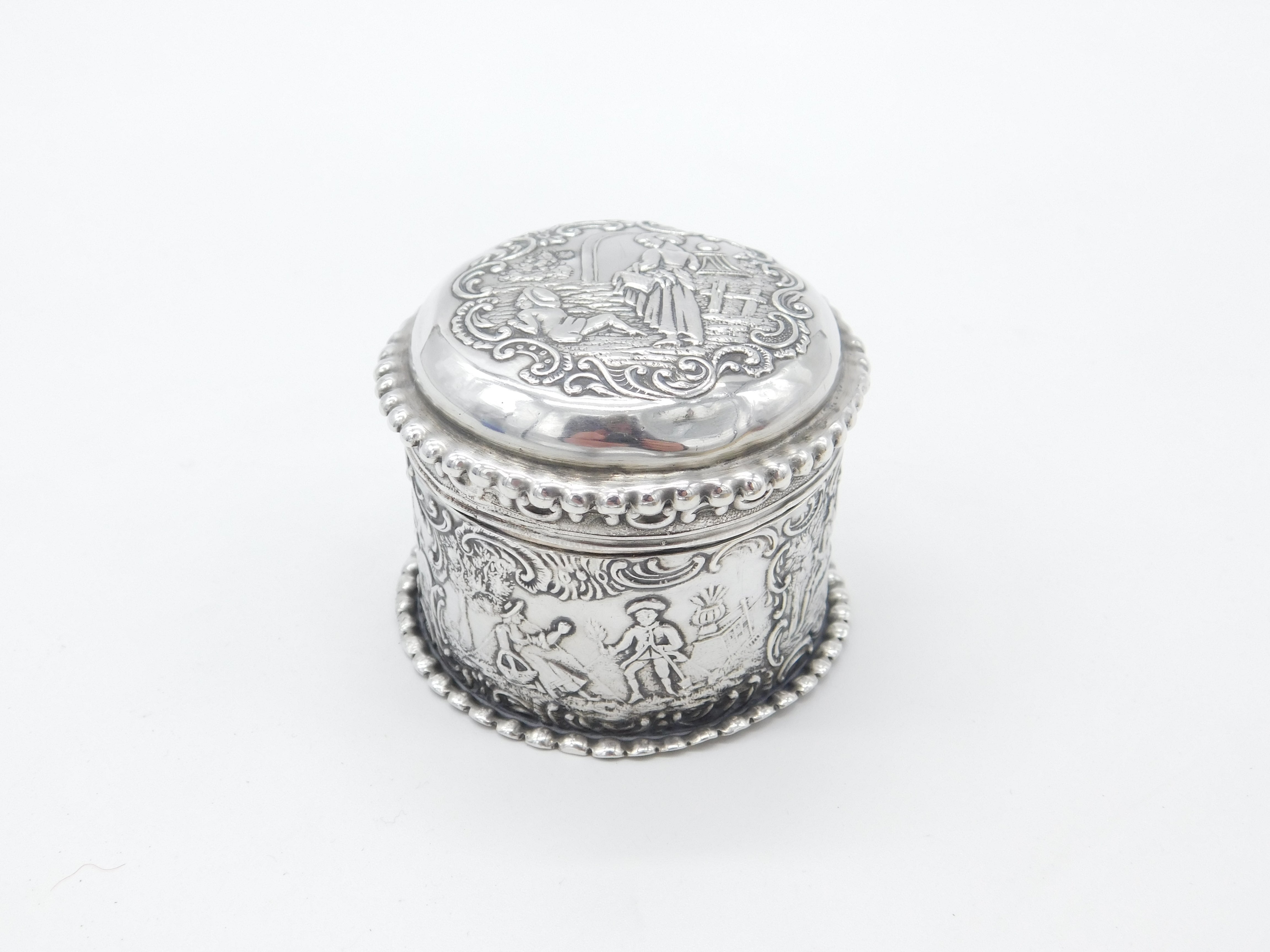 Victorian Sterling Silver Repousse Trinket Box Charming Scenes Antique 1893