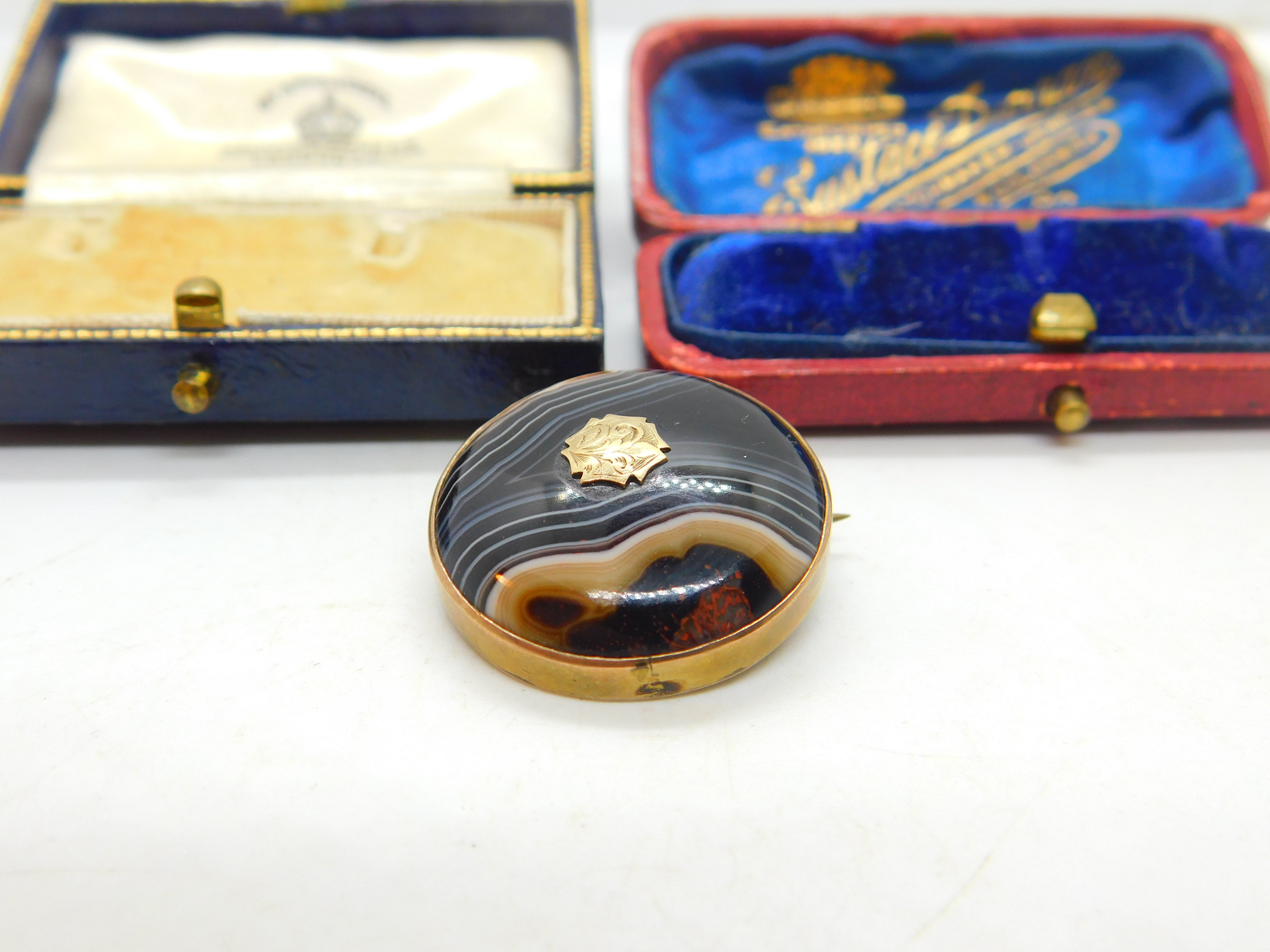 Victorian 9ct Gold & Banded Agate Target Mourning Brooch Antique c1880