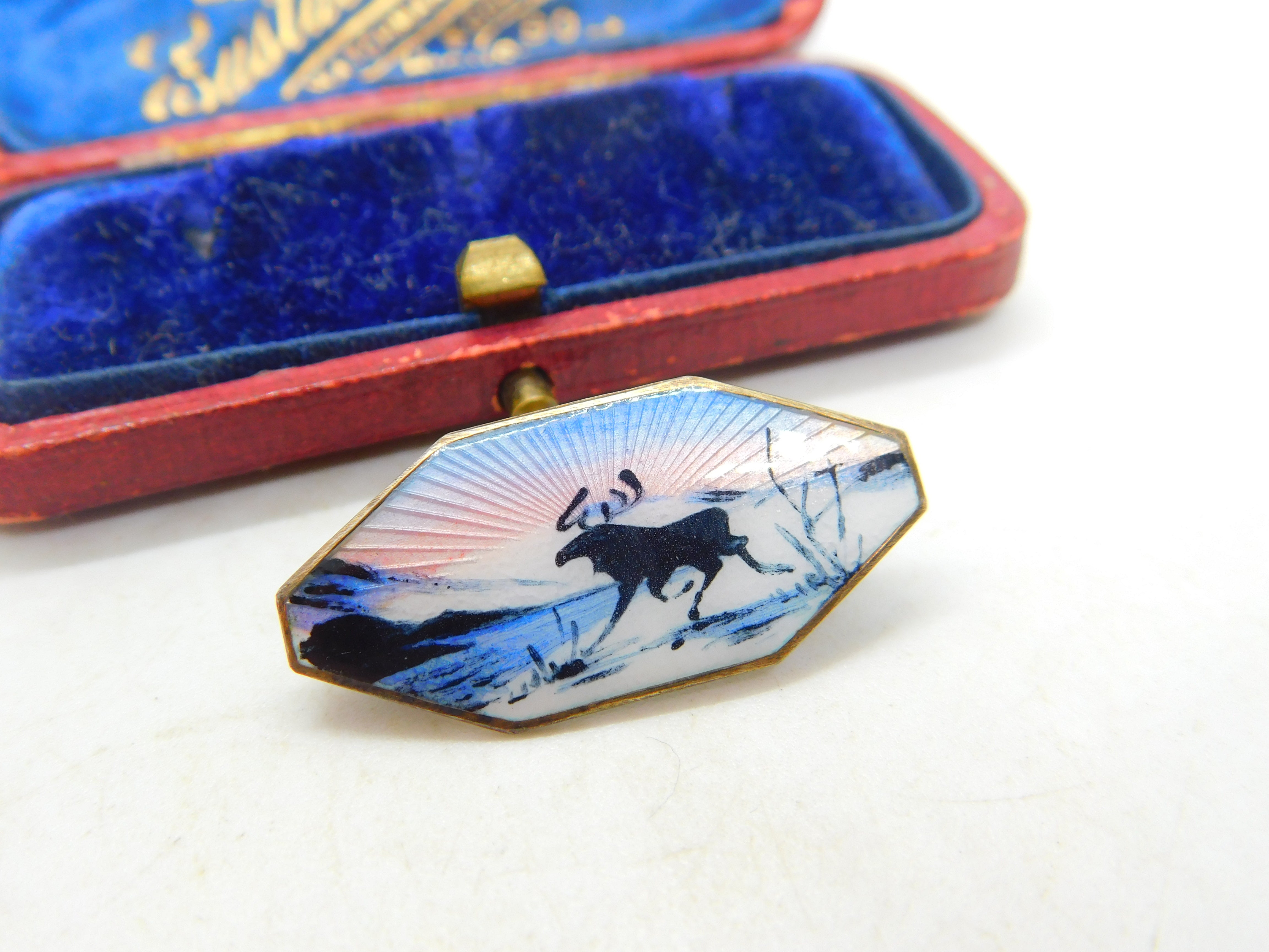 Norwegian Sterling Silver & Enamel Reindeer Scene Brooch Antique c1920 Art Deco
