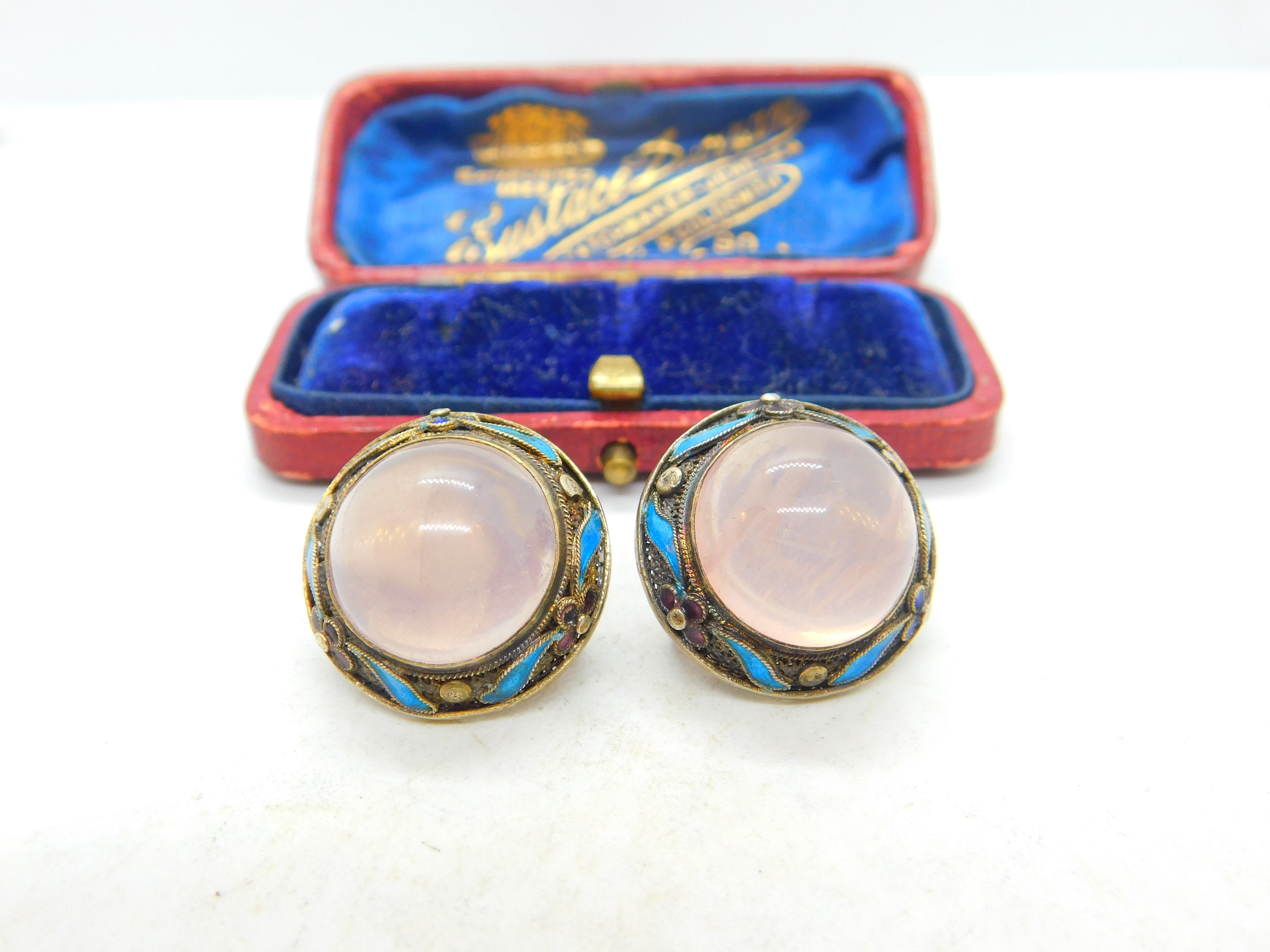 Chinese Export Sterling Silver Gilt, Enamel & Cabochon Rose Quartz Earrings