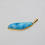 Blue pendant with gold setting on a light gray background