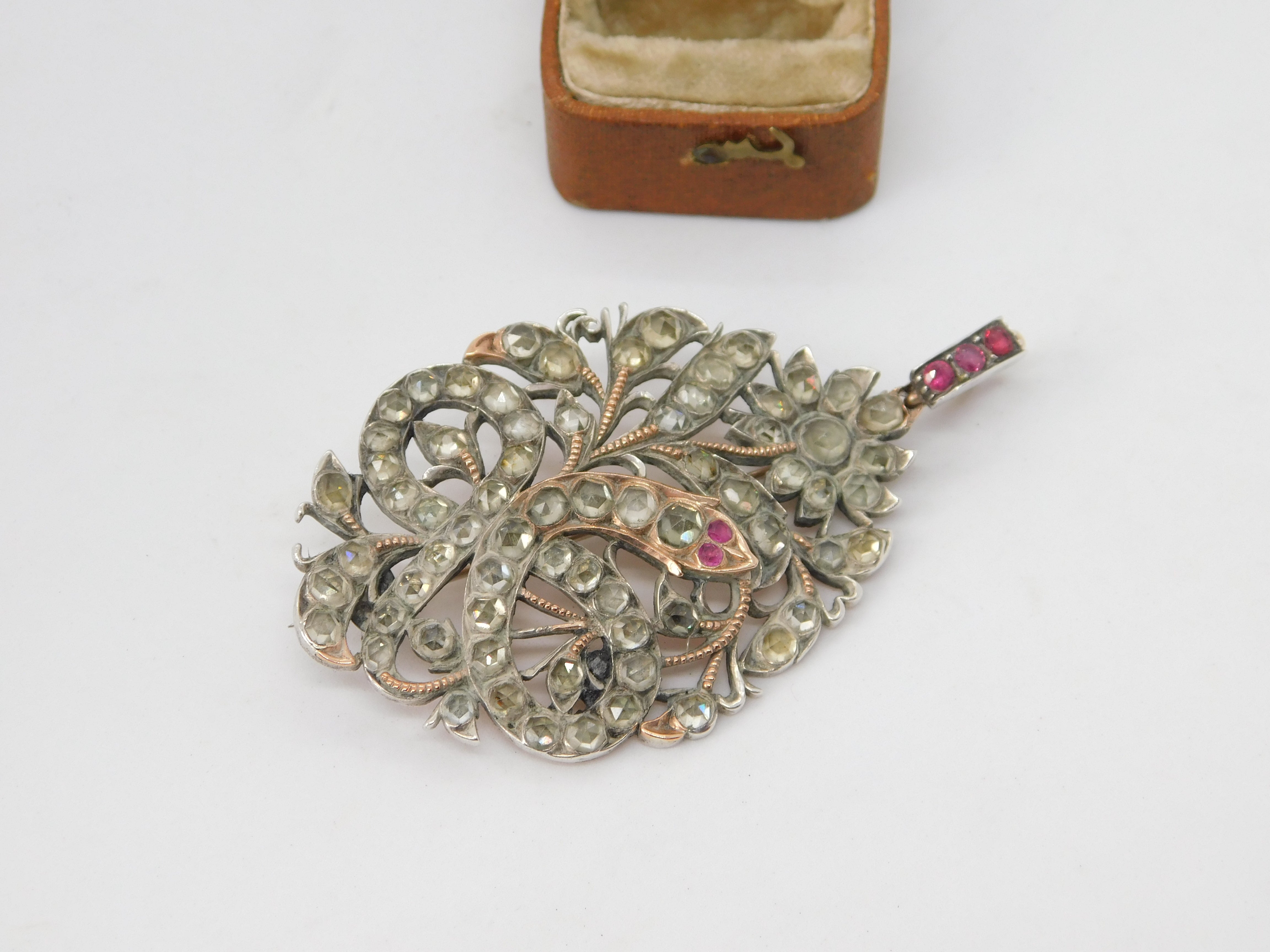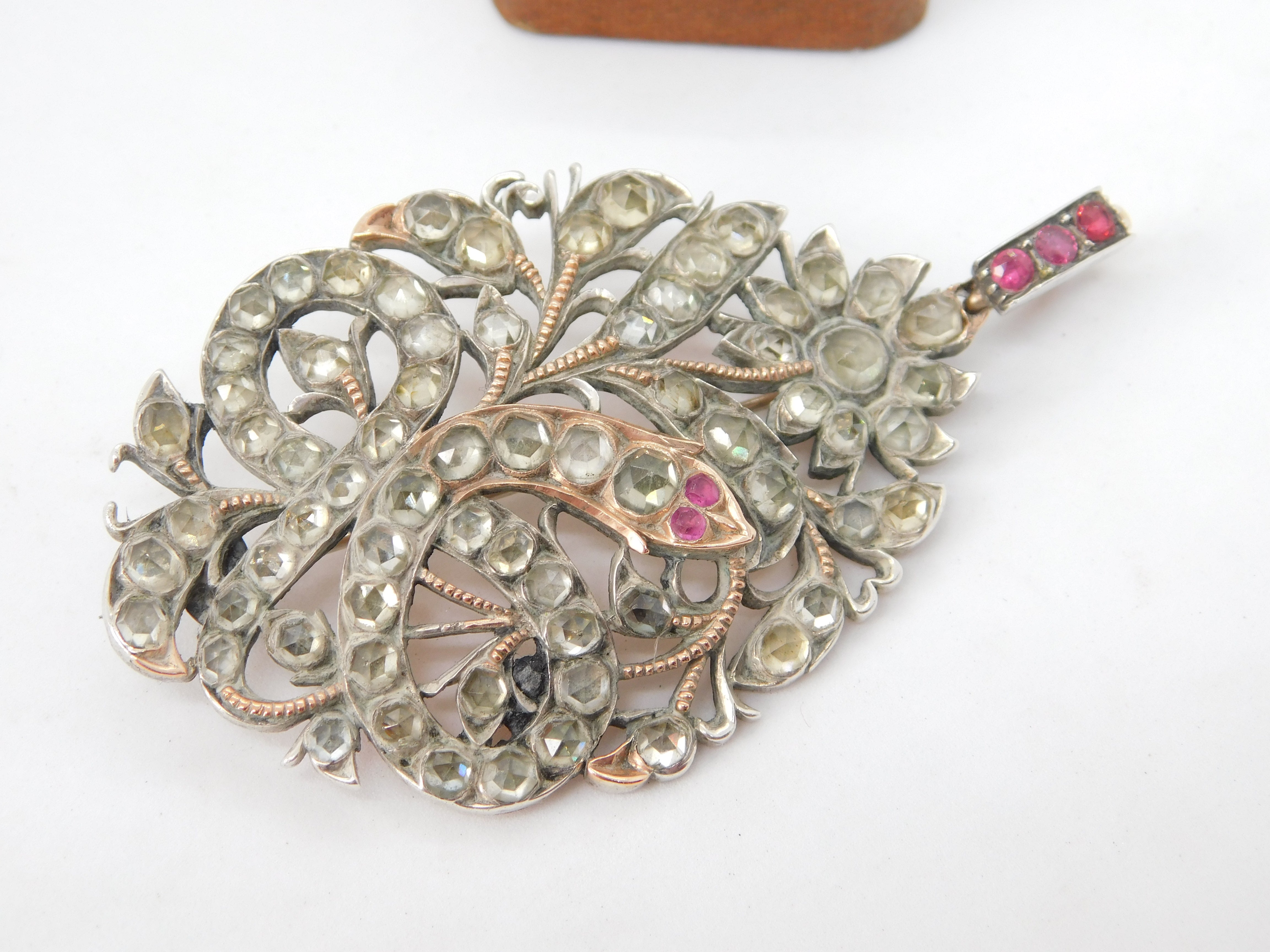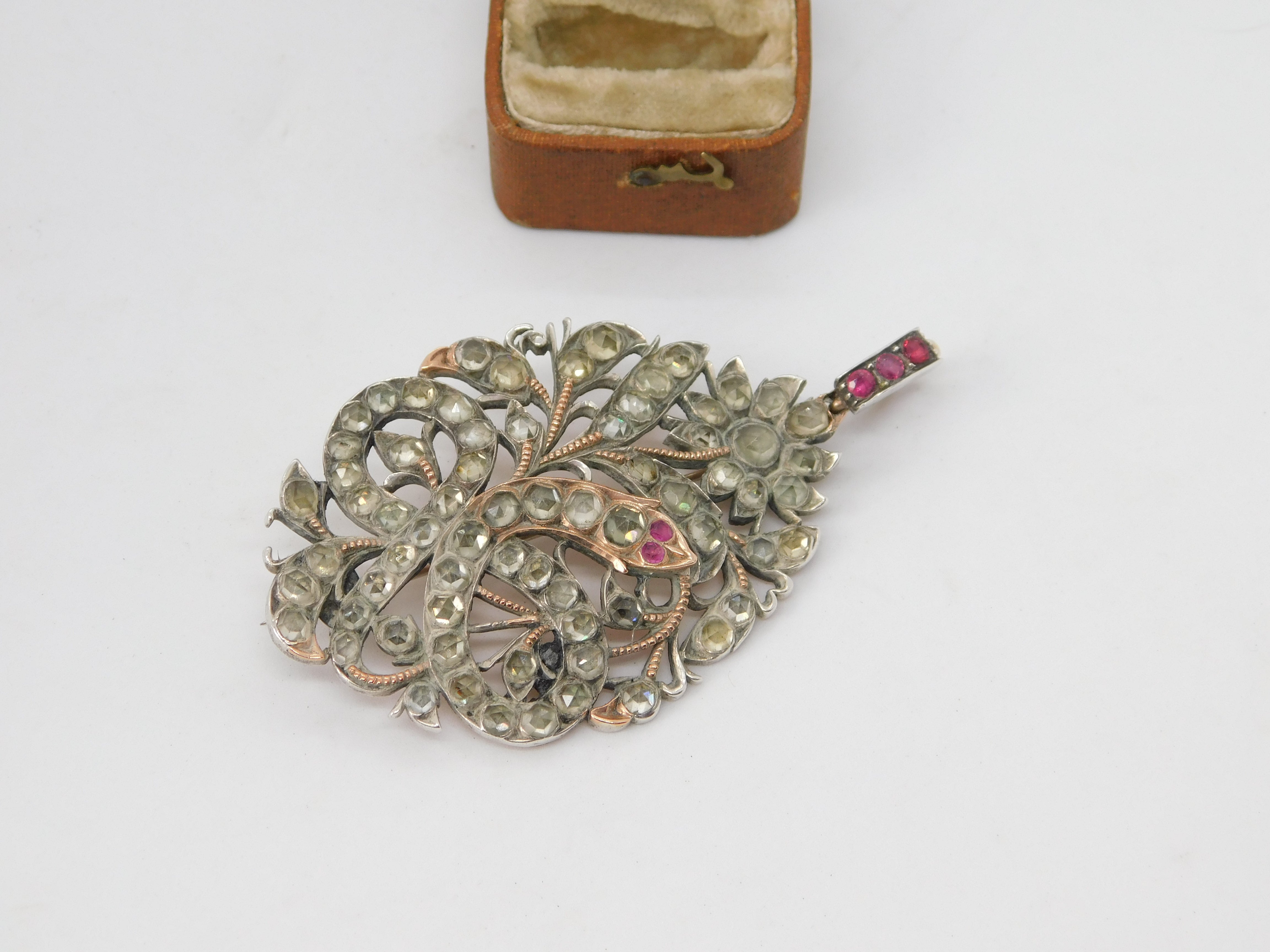 Details: A fantastic and wonderfully designed antique 18th century Indian mughal large coppered sterling silver pendant in the form of a entwined serpent in leaves set with rock crystal and natural rubies c1780. The silver has been tested as it is unmarked. This is a wonderful item that would make a perfect gift or addition to any collection. The BOX pictured is for PRESENTATION ONLY and is NOT included in the listings but used to frame the pictures unless specifically stated otherwise.