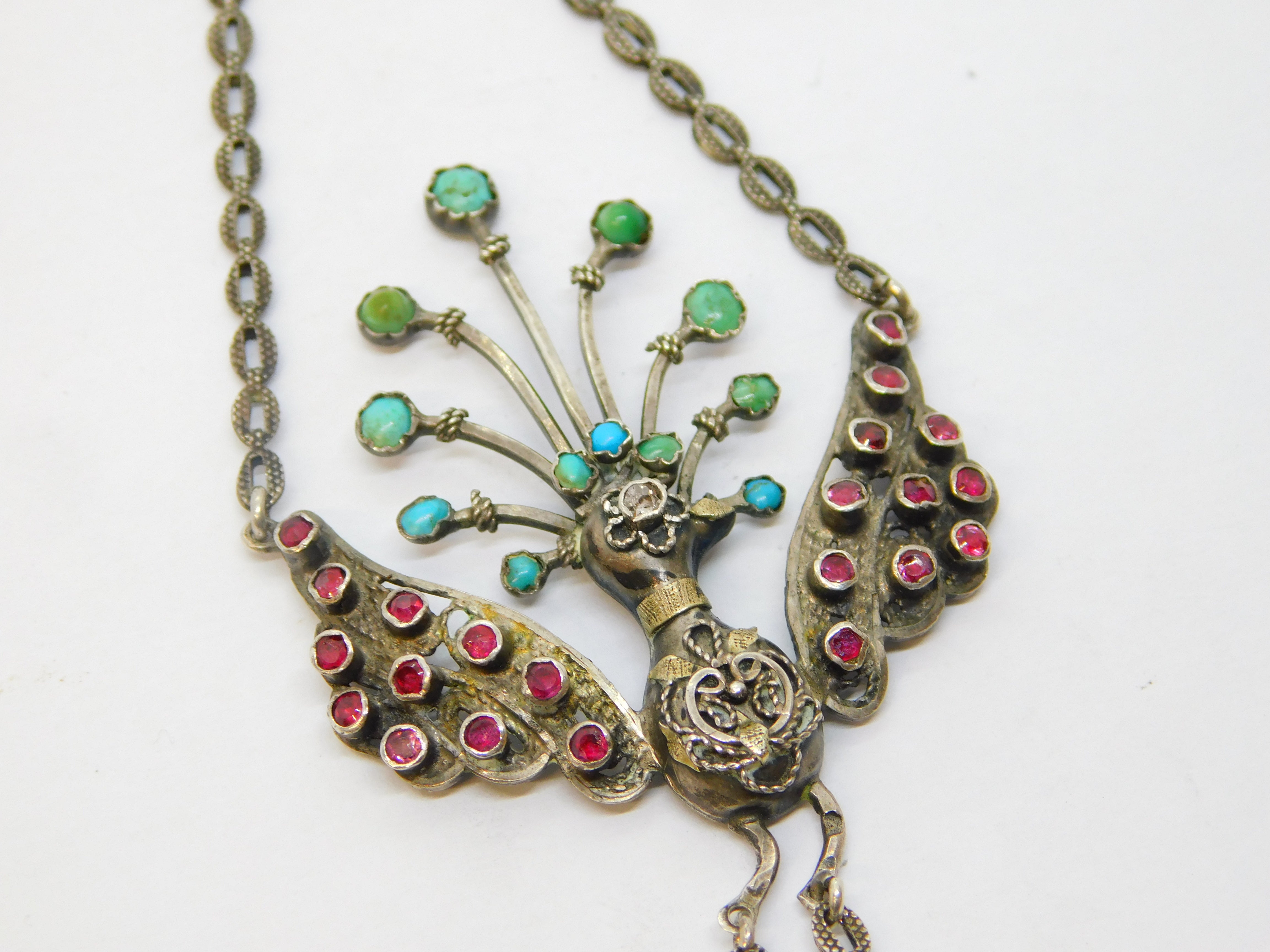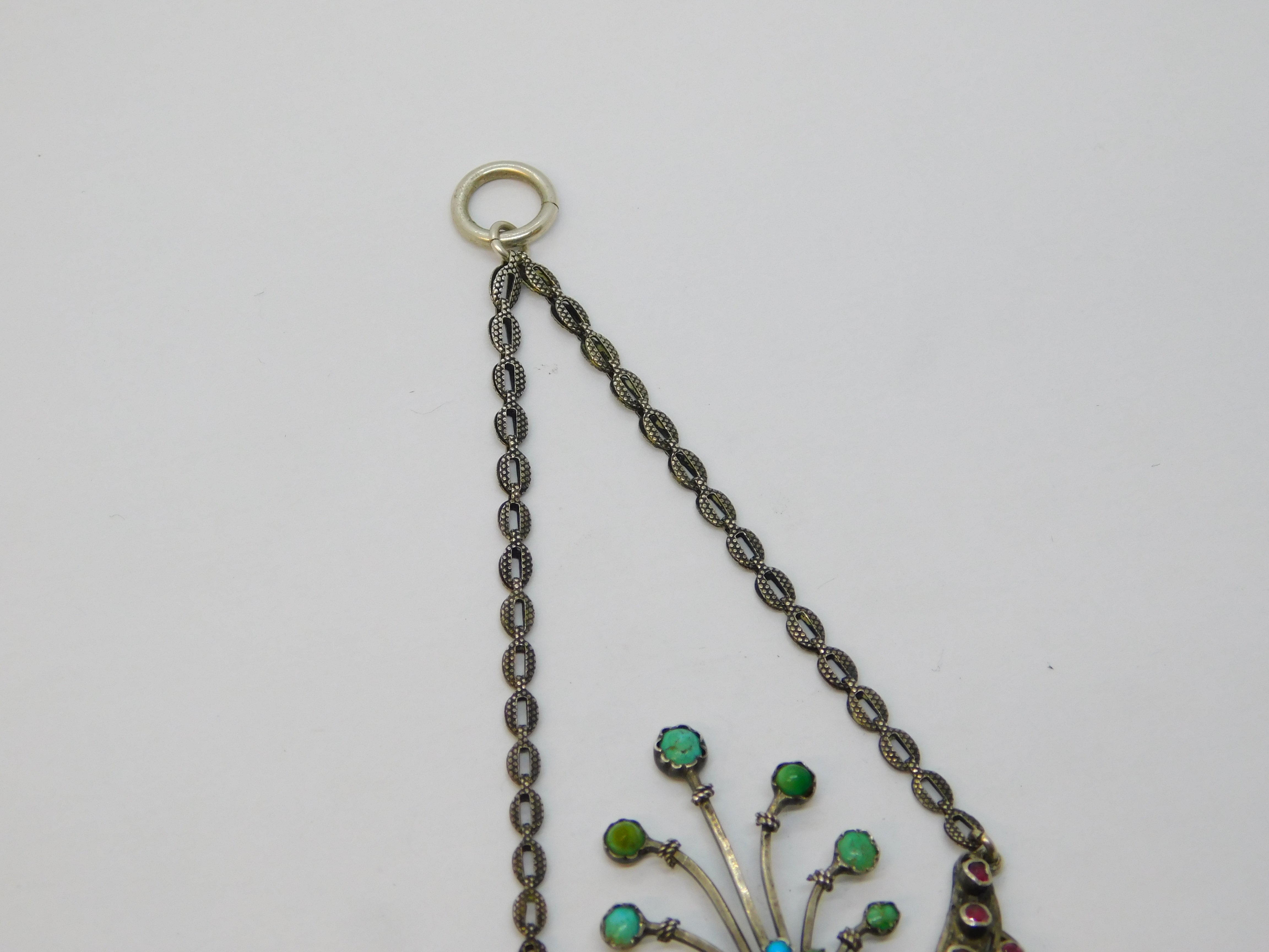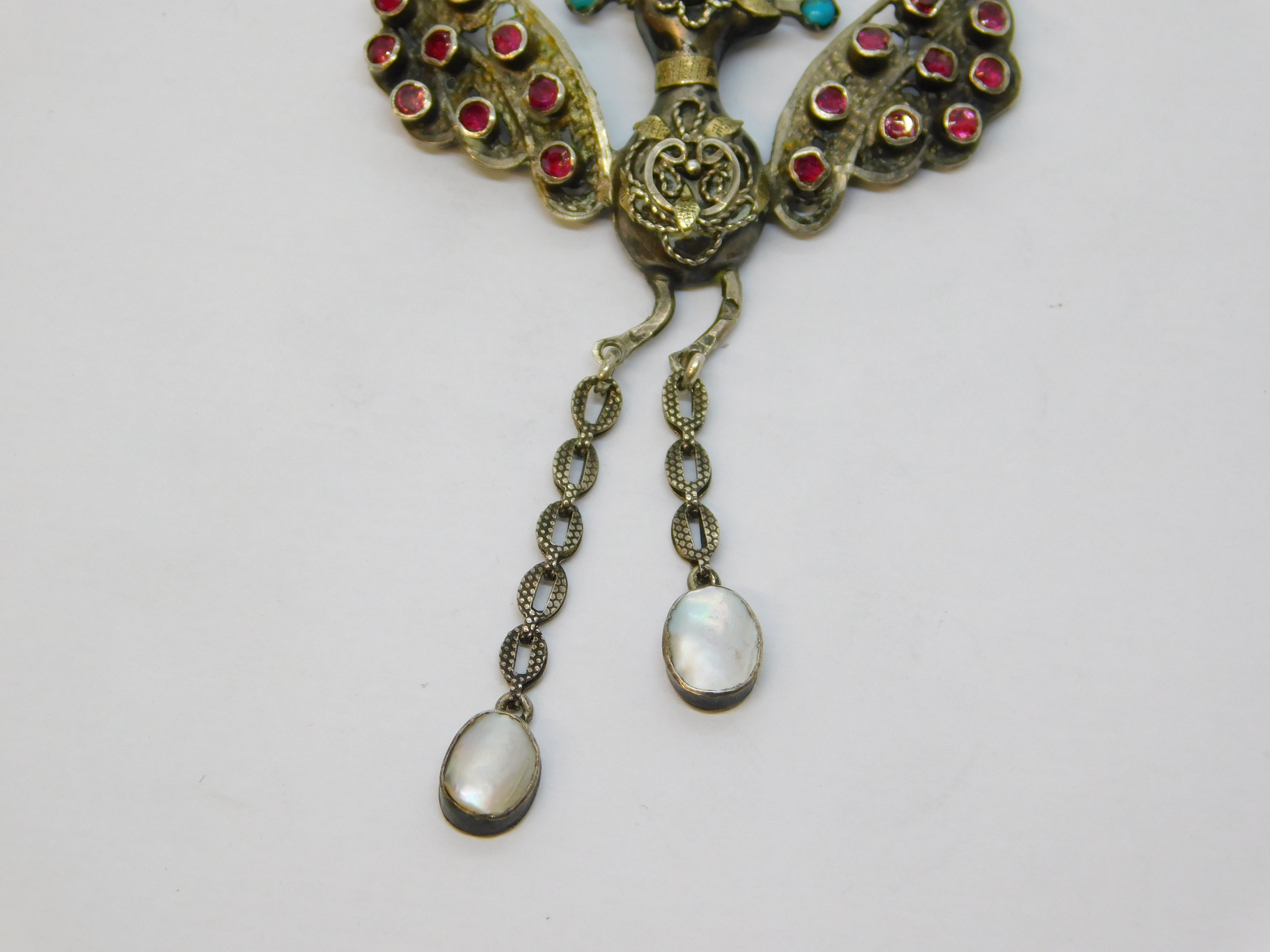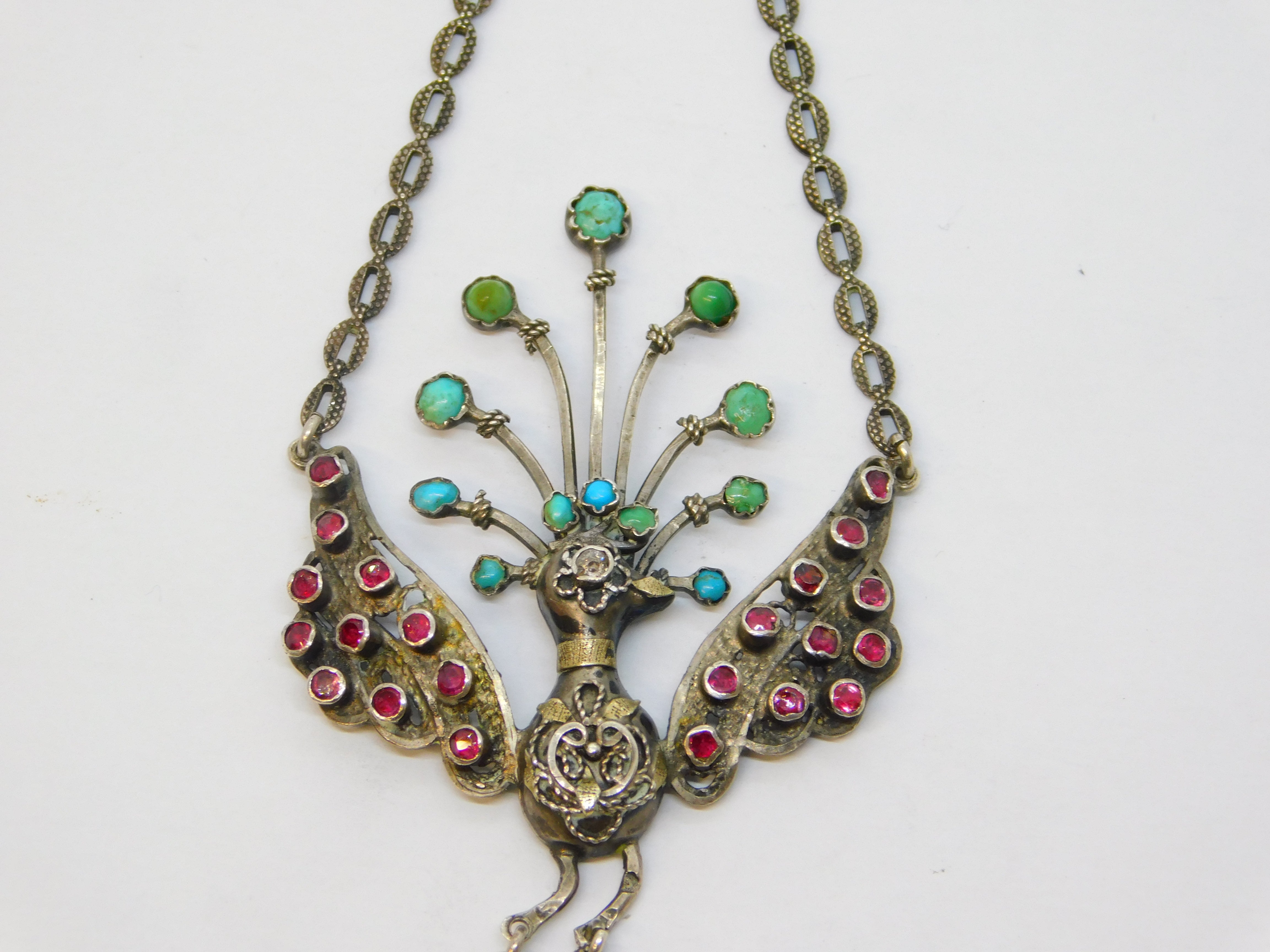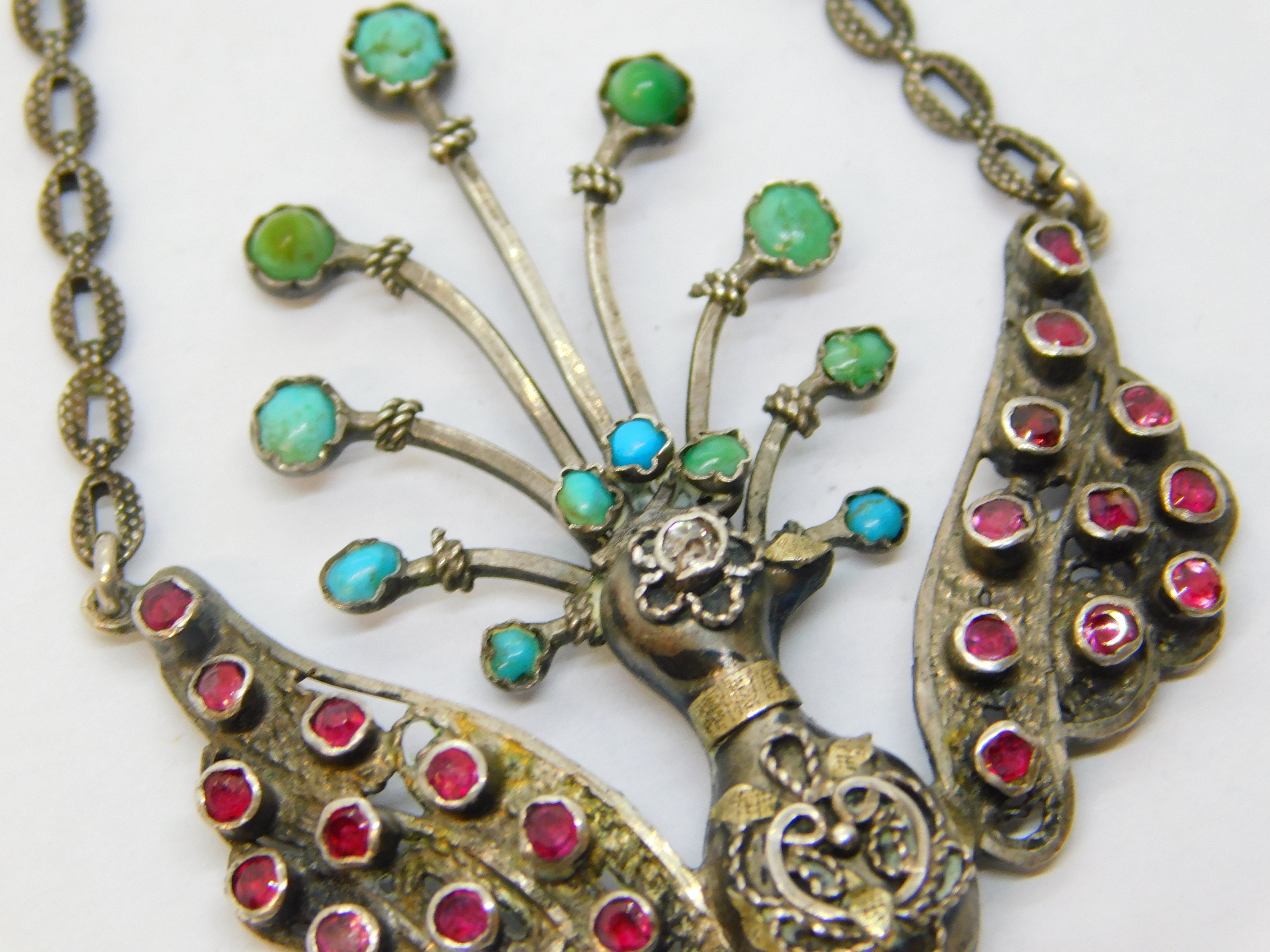 Details: A fantastic and wonderfully designed antique 19th century austro-hungarian sterling silver peacock form drop pendant set with rubies, turquoise, drop pearls and a central old-cut diamond to the eye c1860, the silver has been XRF tested as it is unmarked, the stones have all been tested, a wonderful unique unusually shaped. This is a wonderful item that would make a perfect gift or addition to any collection.