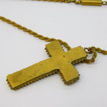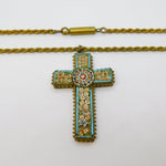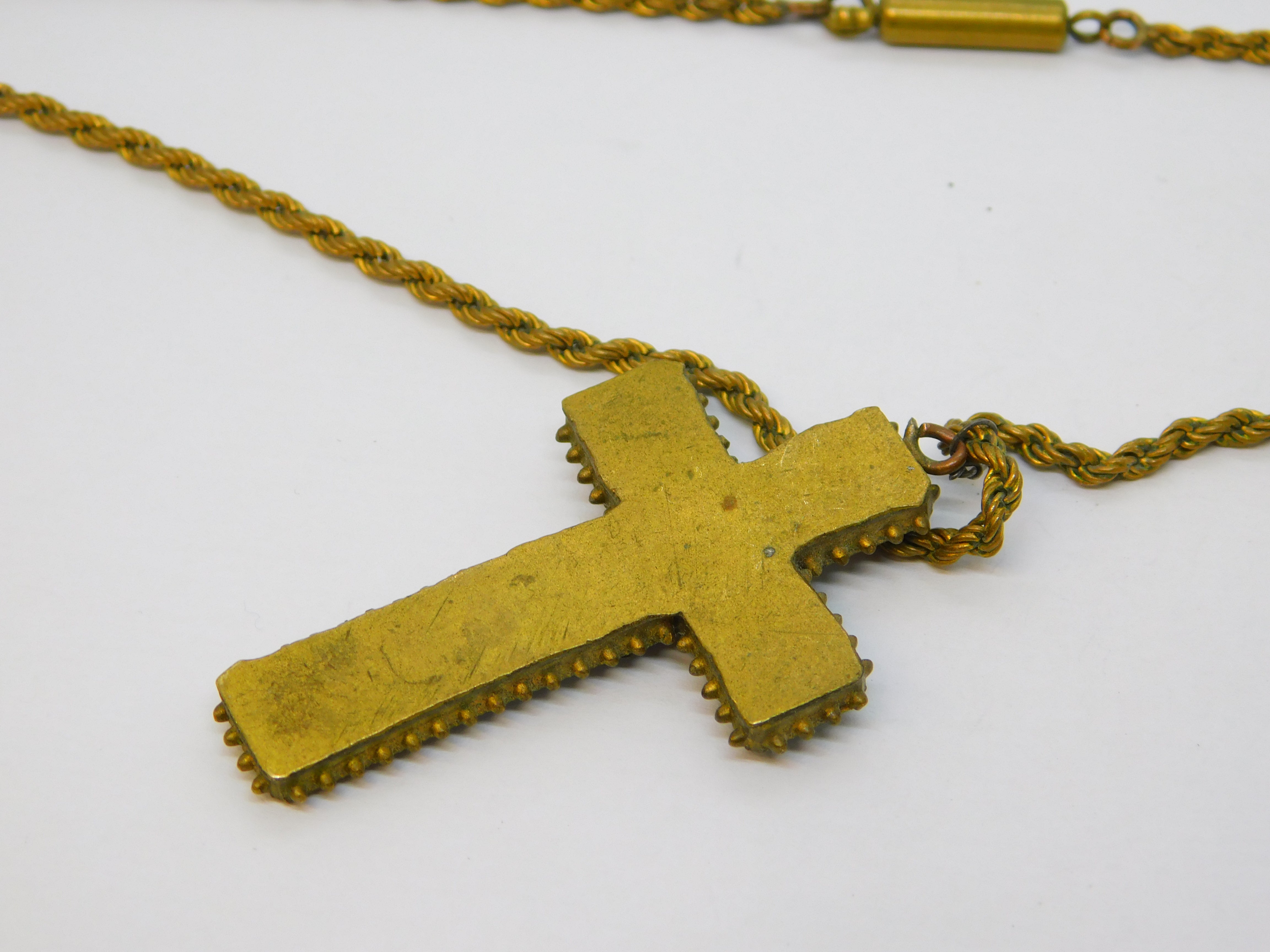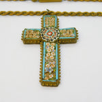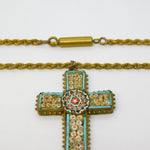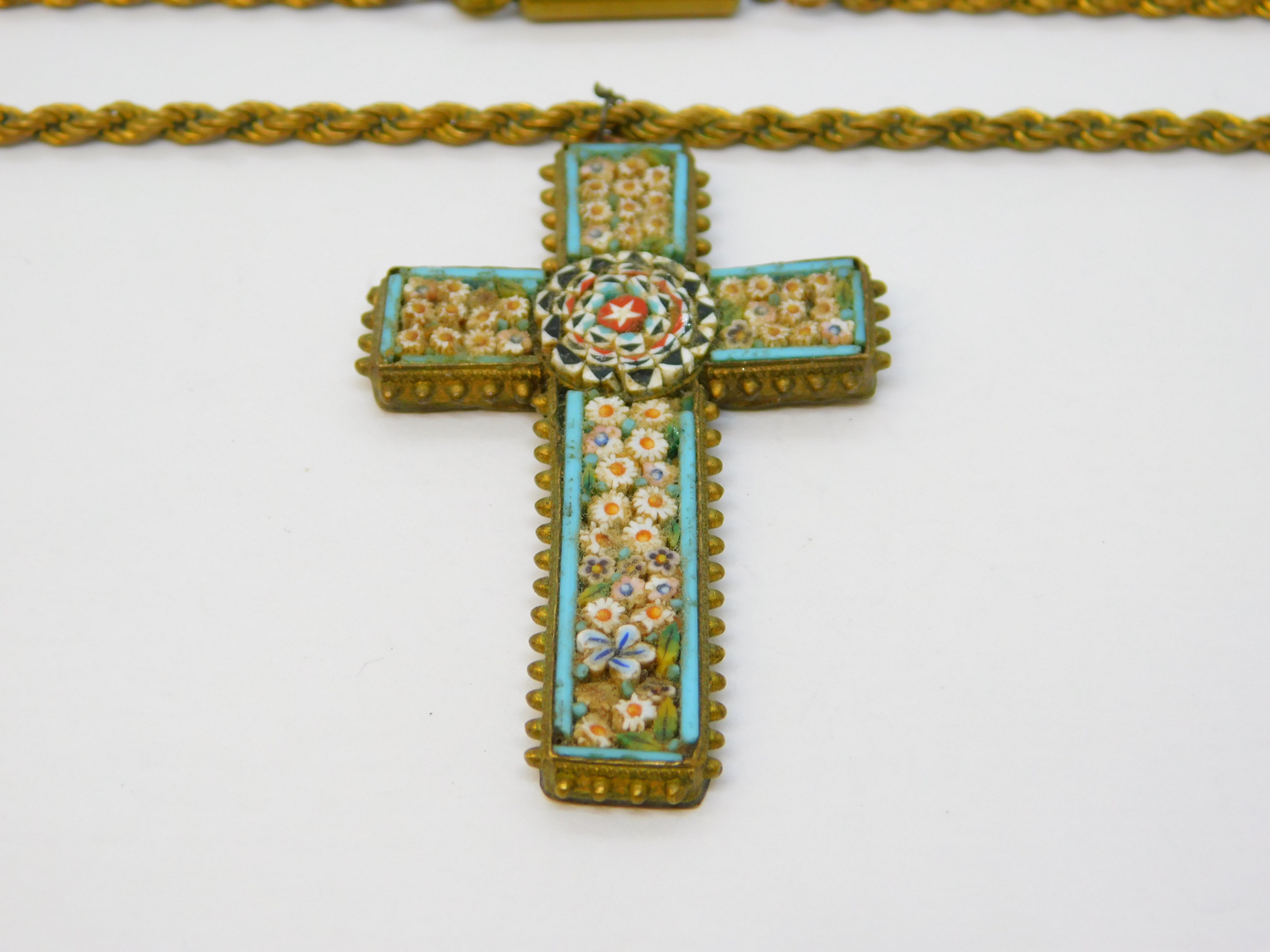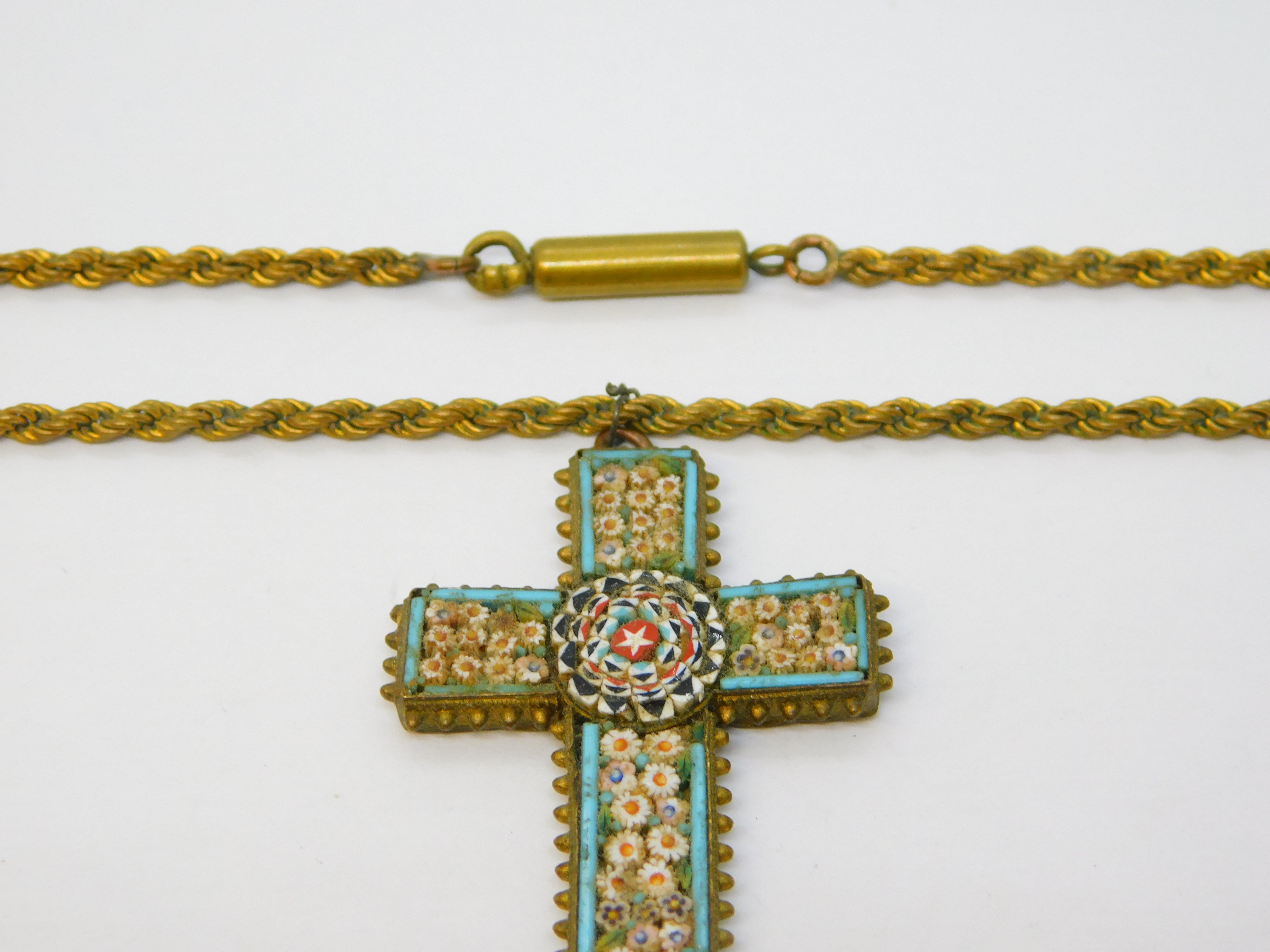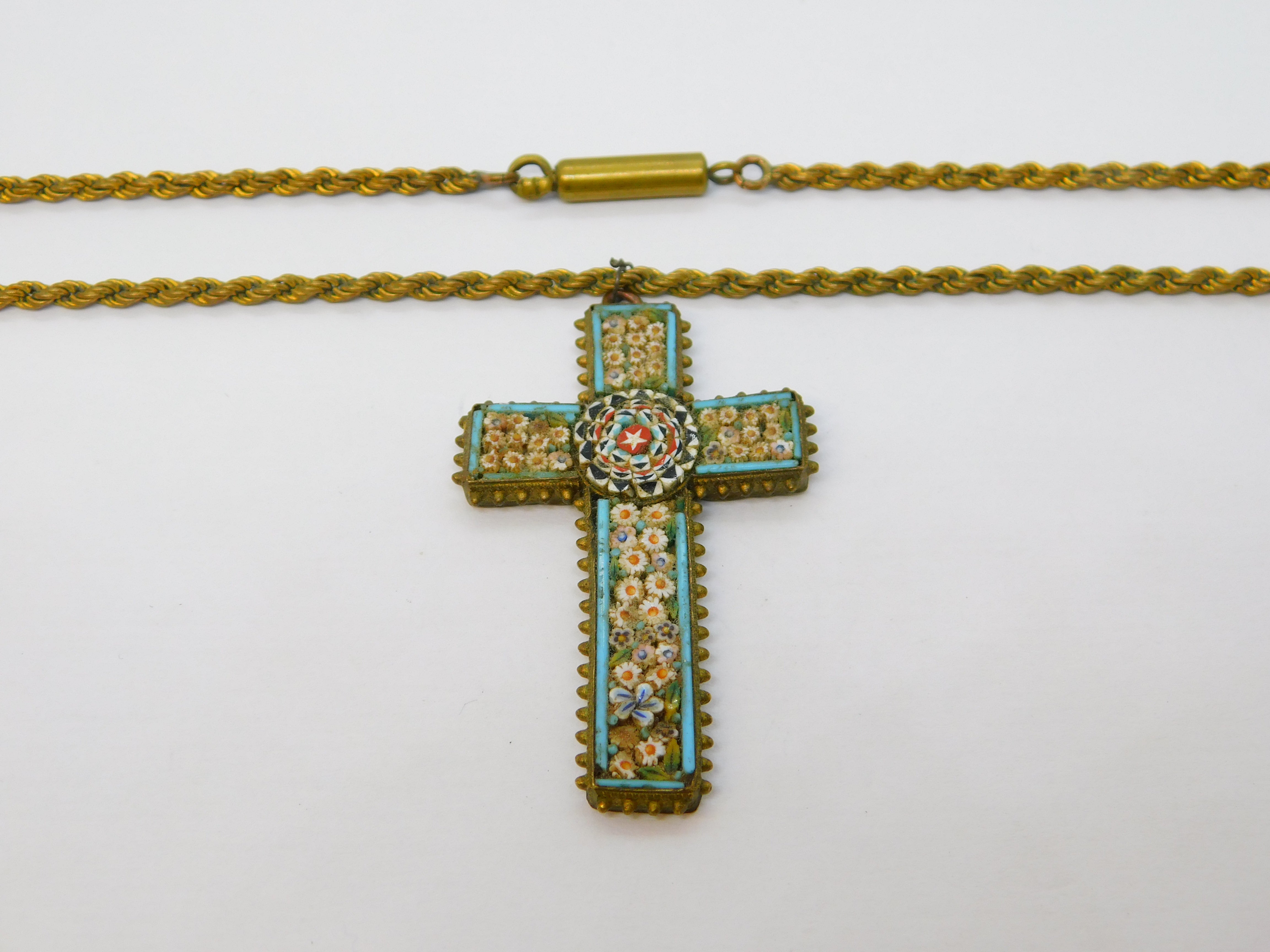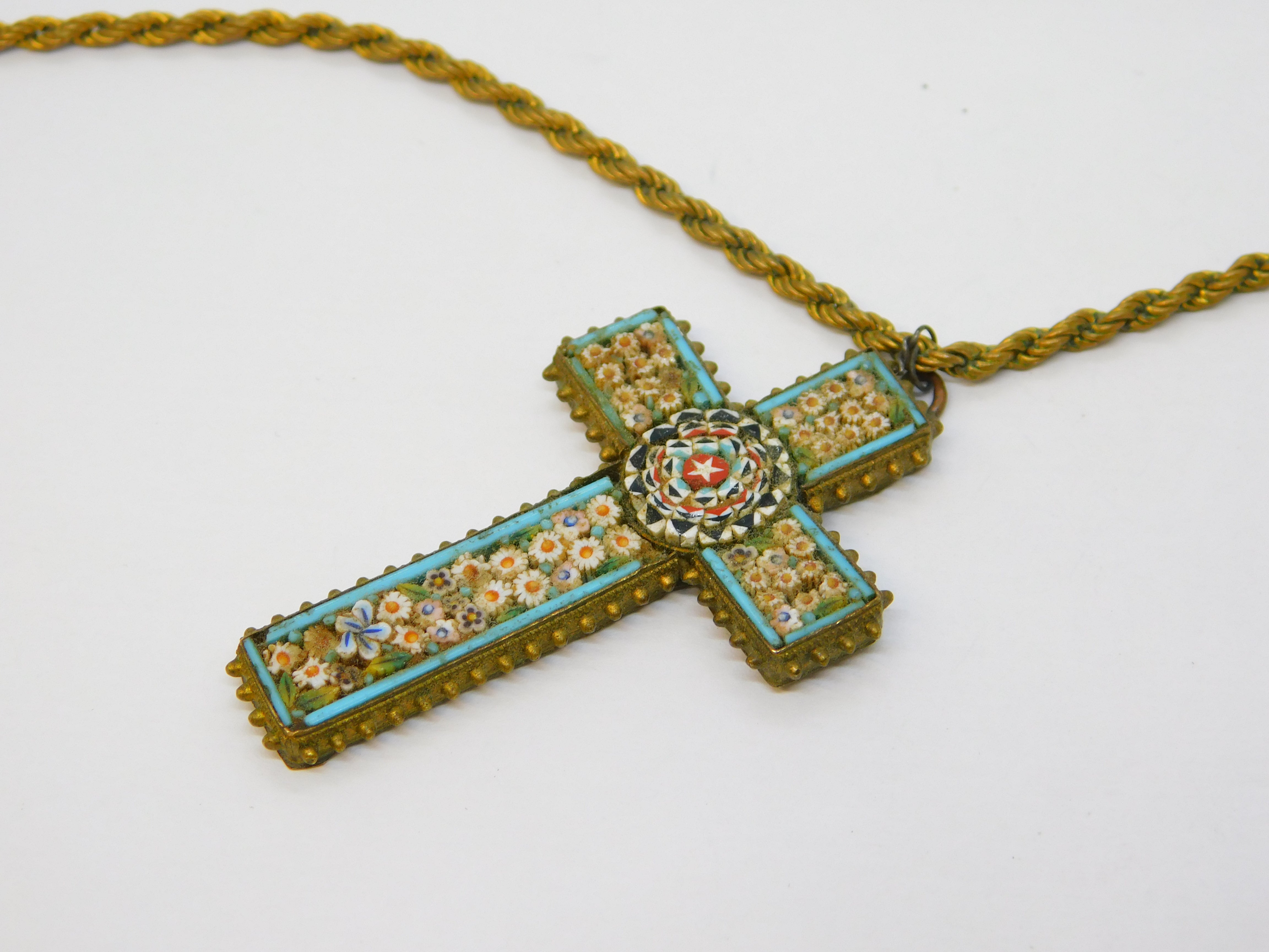 19th Century Italian Gilt Metal Floral Micro Mosaic Cross Pendant Necklace c1860