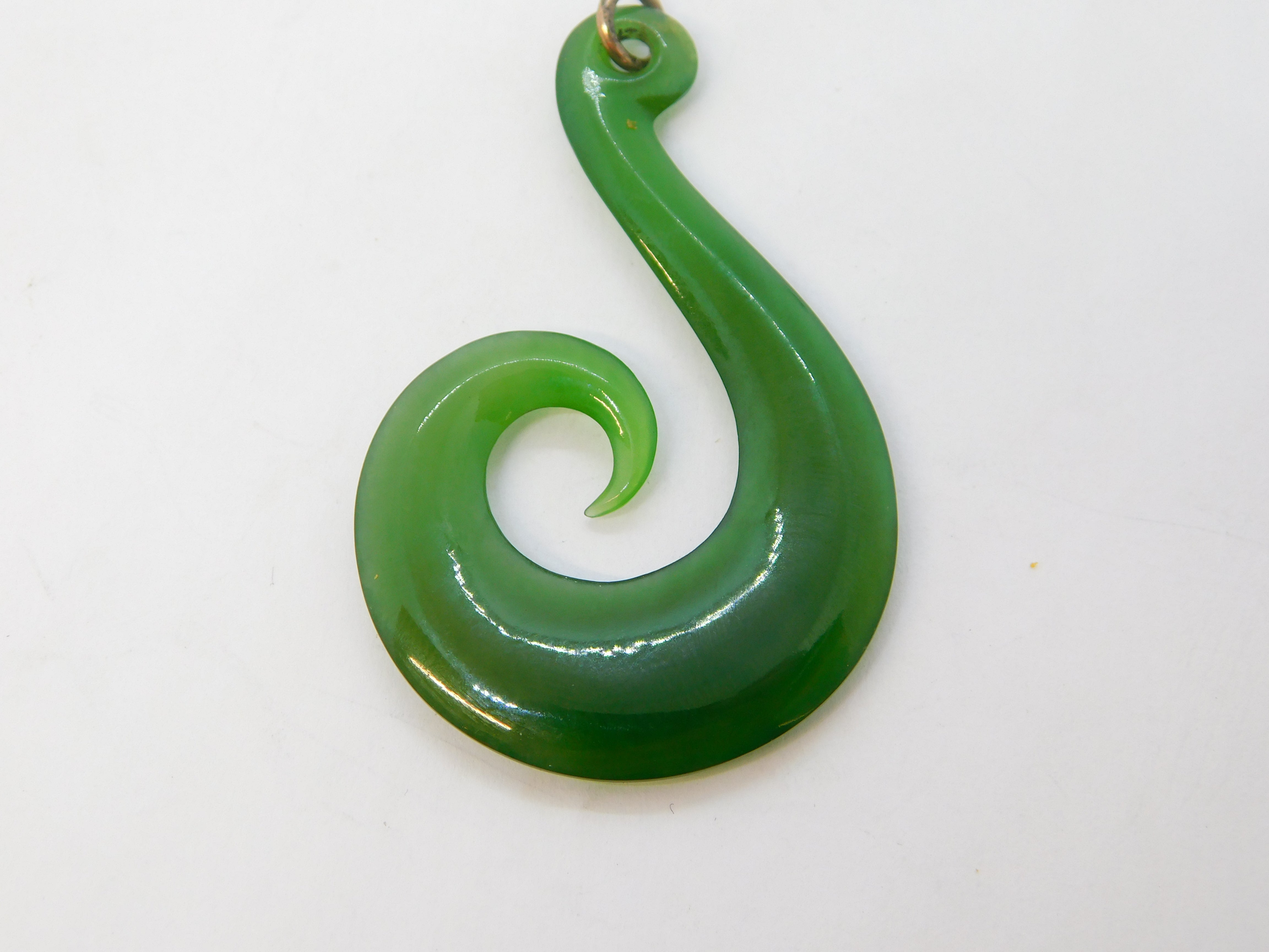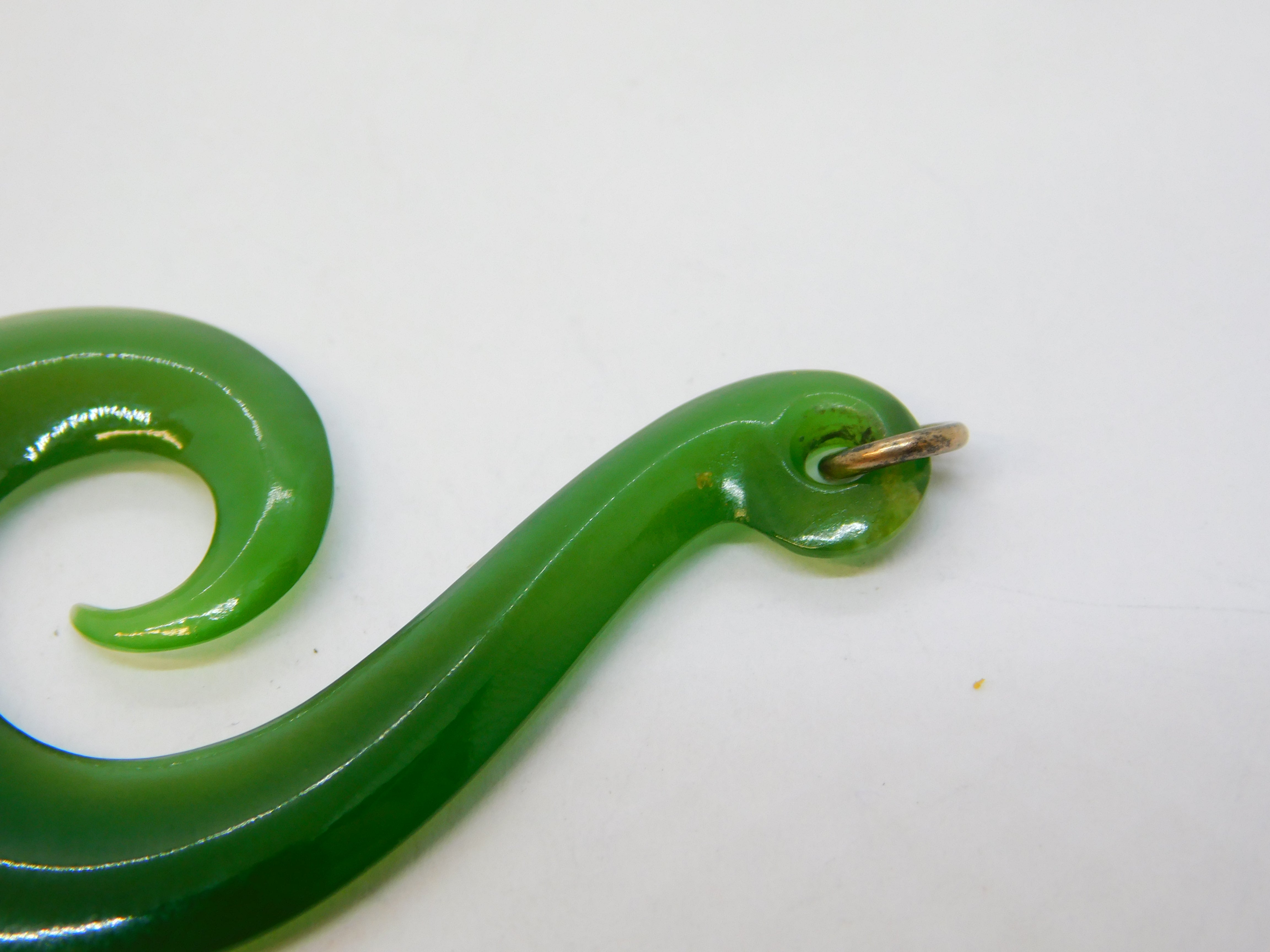 Details: A fantastic and wonderfully designed antique art deco 9ct gold mounted carved New Zealand nephrite jade hei matau fishook pendant with lovely detailing c1930, the gold has been XRF tested, excellent carving to the jade. This is a wonderful item that would make a perfect gift or addition to any collection. We are more than happy to provide XRF reports for items upon request.