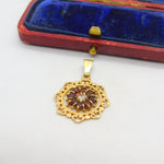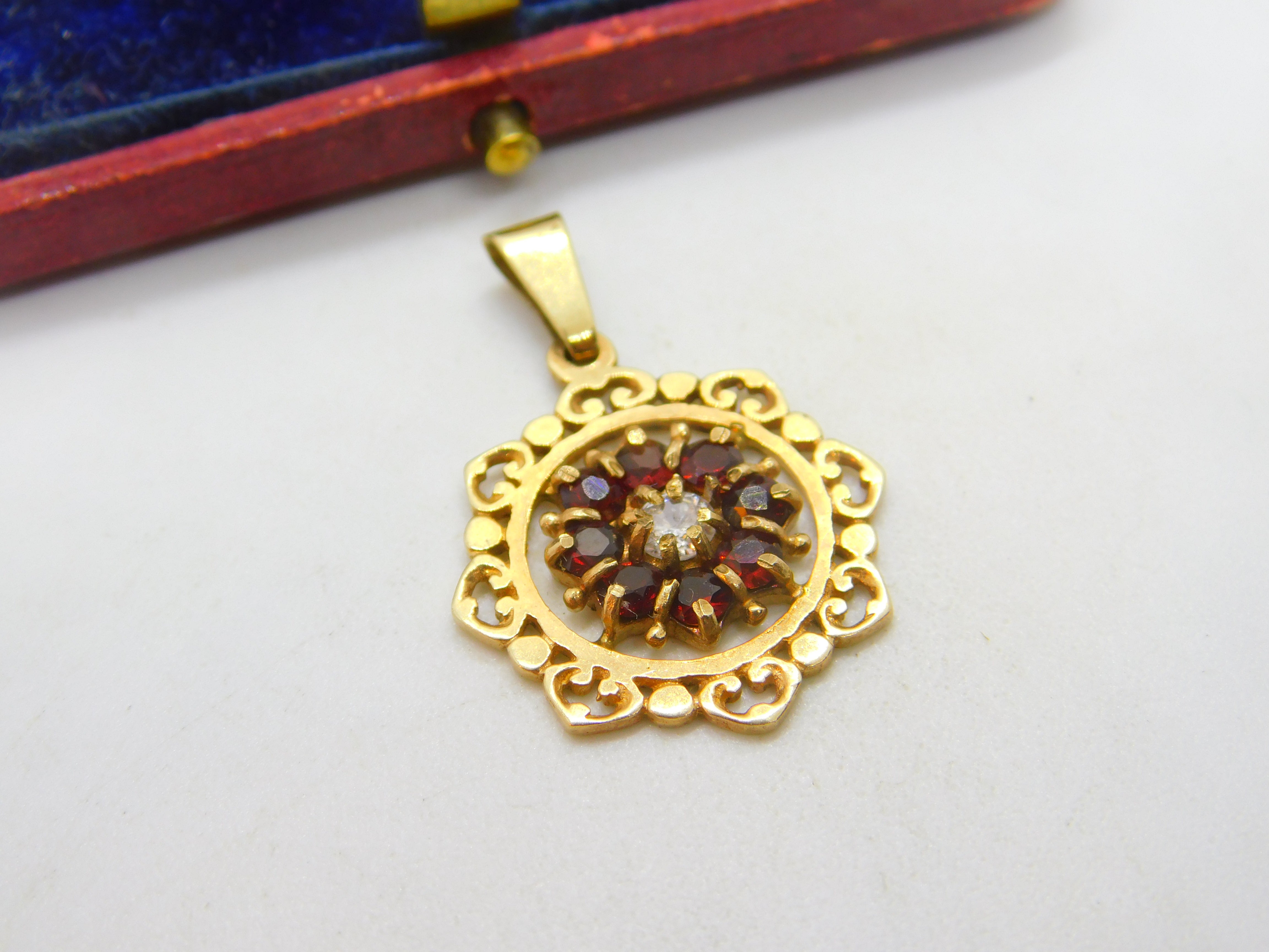 Details: A fantastic and wonderfully designed vintage 9ct yellow gold floral drop pendant with garnets & diamond paste stones hallmarked Birmingham 1974. This is a wonderful item that would make a perfect gift or addition to any collection. The BOX pictured is for PRESENTATION ONLY and is NOT included in the listings but used to frame the pictures unless specifically stated otherwise.
