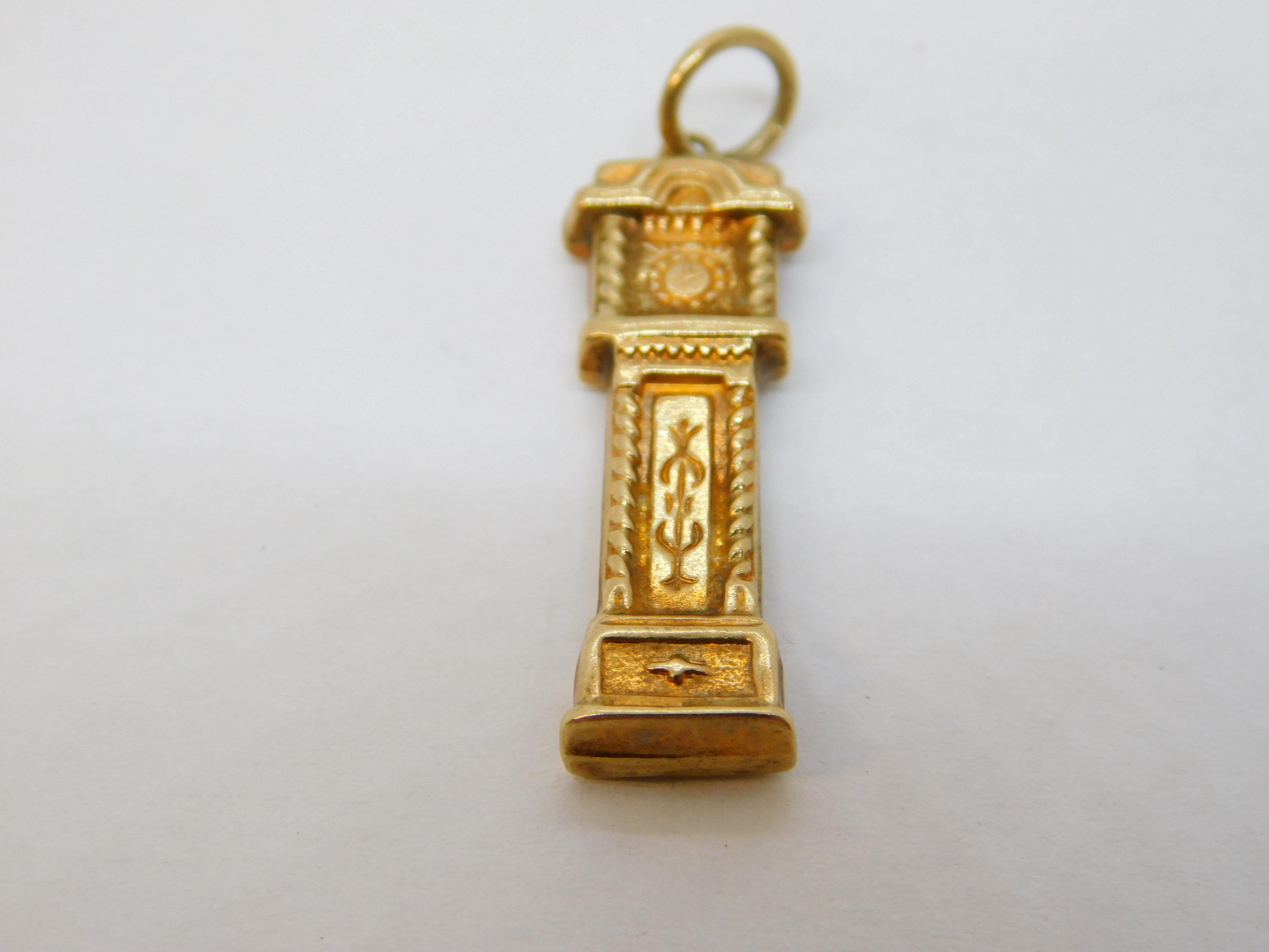 Details: A fantastic and wonderfully designed vintage 9ct yellow gold grandfather clock charm pendant hallmarked Birmingham 1972 to the reverse. This is a wonderful item that would make a perfect gift or addition to any collection.