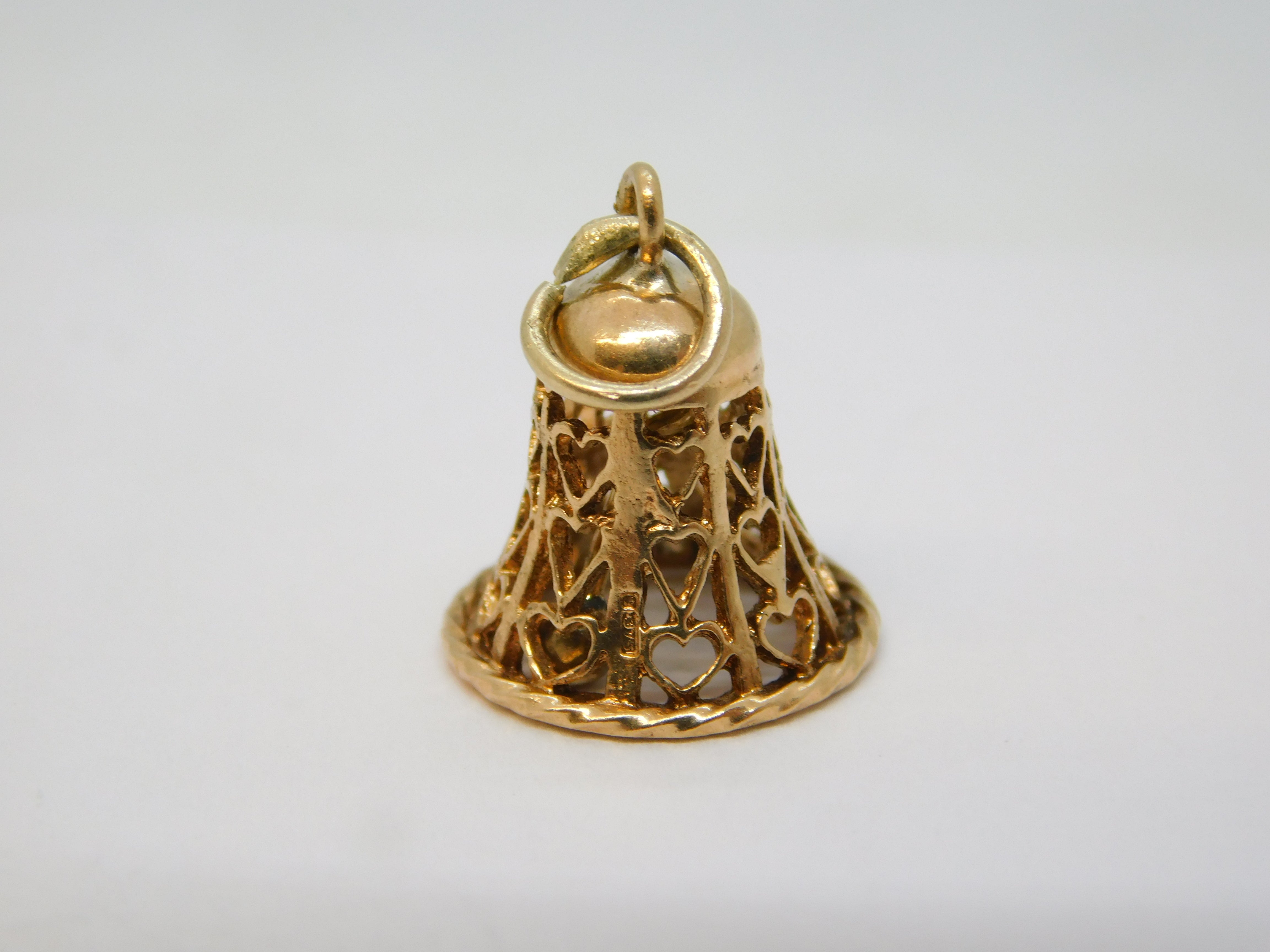 Details: A fantastic and wonderfully designed vintage 9ct yellow gold sweet floral & heart pattern ringing bell charm pendant hallmarked to the edge c1970, still rings nicely. This is a wonderful item that would make a perfect gift or addition to any collection. We are more than happy to provide XRF reports for items upon request.