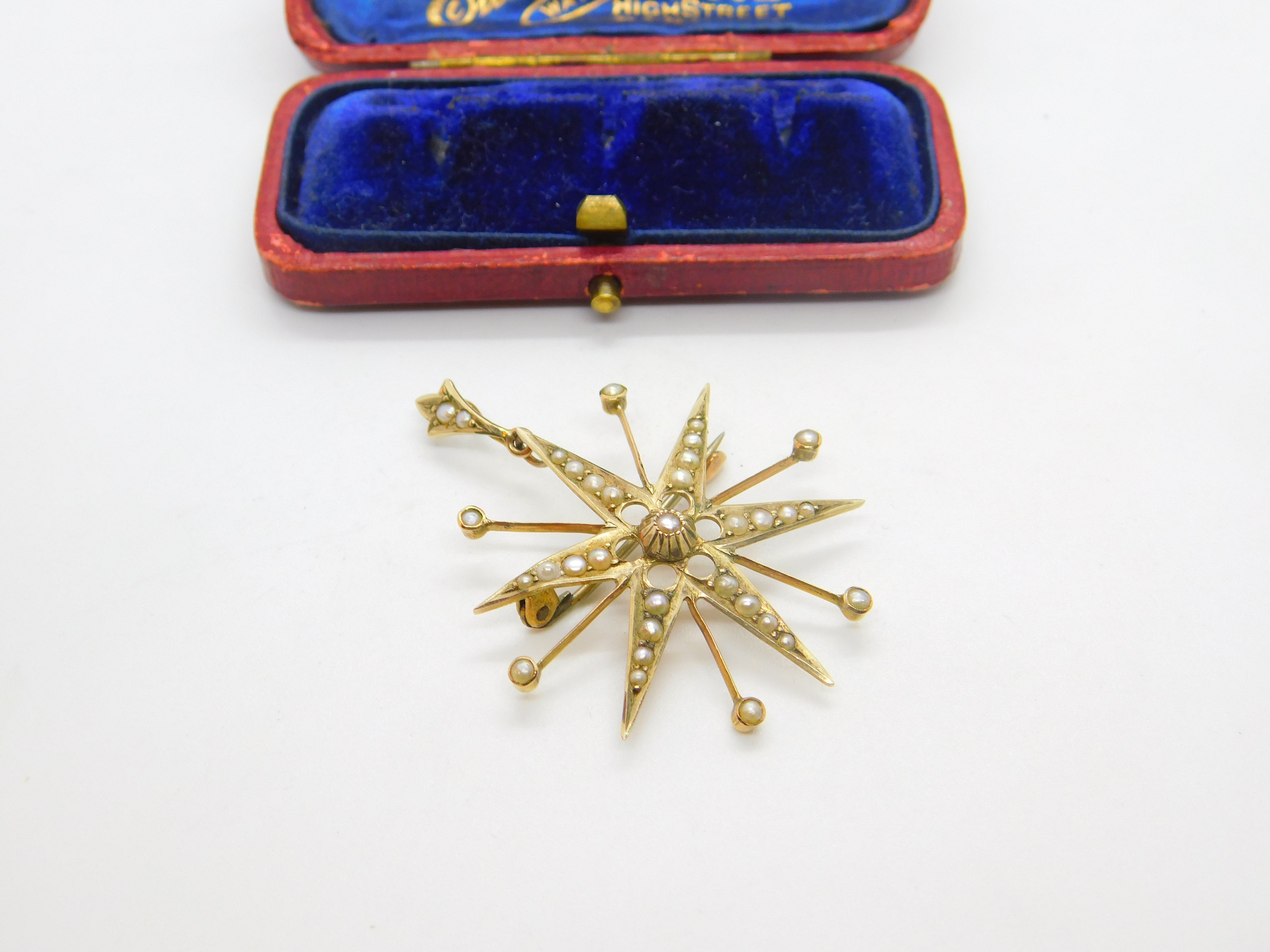 Details: A fantastic and wonderfully designed antique art deco large 9ct yellow gold starburst shooting star pendant set with seed pearls throughout hallmarked Birmingham 1915 to the reverse - the item can also be worn as a brooch. A stunning example. This is a wonderful item that would make a perfect gift or addition to any collection. The BOX pictured is for PRESENTATION ONLY and is NOT included in the listings but used to frame the pictures unless specifically stated otherwise.