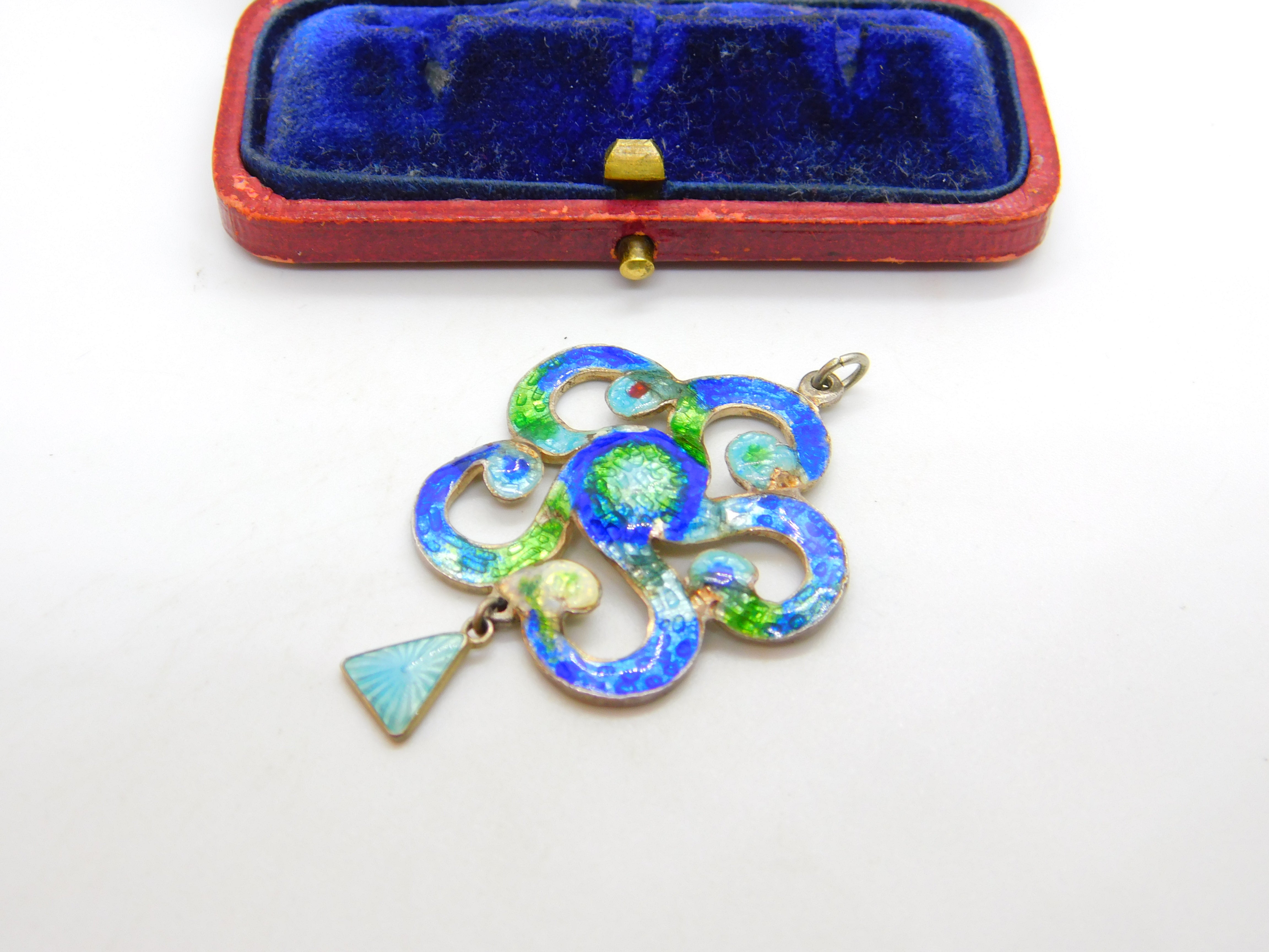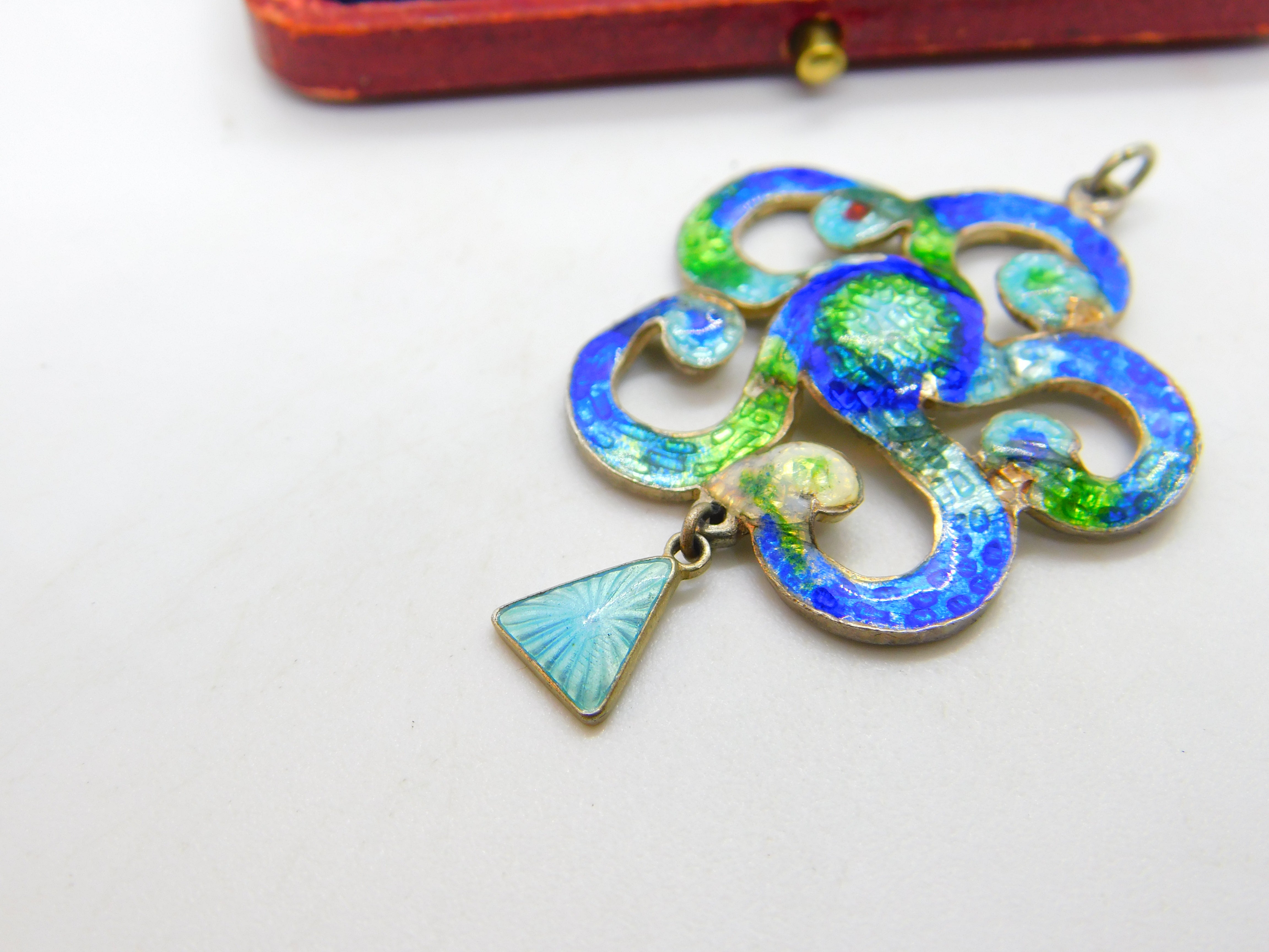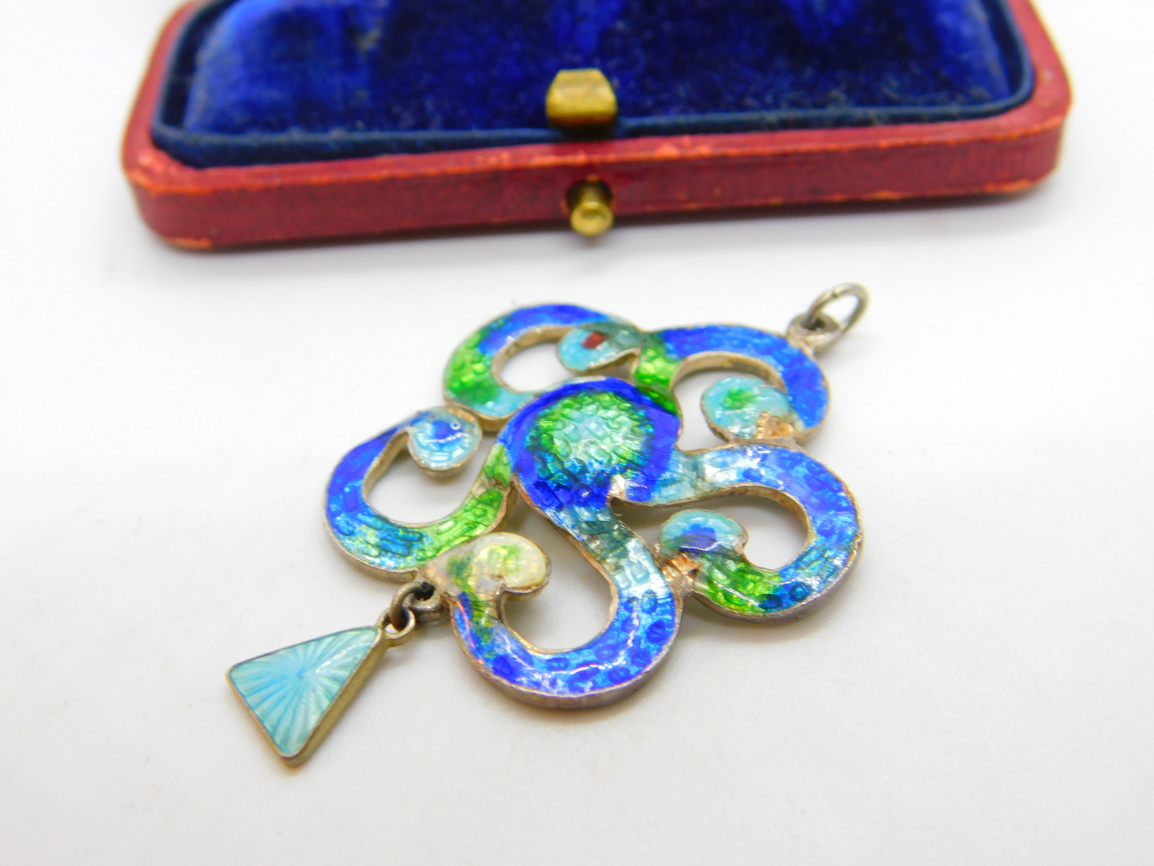 Details: A fantastic and wonderfully designed antique Edwardian sterling silver & colourful guilloche enamel floral swirl pattern drop pendant in true art nouveau style hallmarked Birmingham, 1909 by Henry Pope. Minor dings to the enamel please see pictures. This is a wonderful item that would make a perfect gift or addition to any collection. The BOX pictured is for PRESENTATION ONLY and is NOT included in the listings but used to frame the pictures unless specifically stated otherwise.