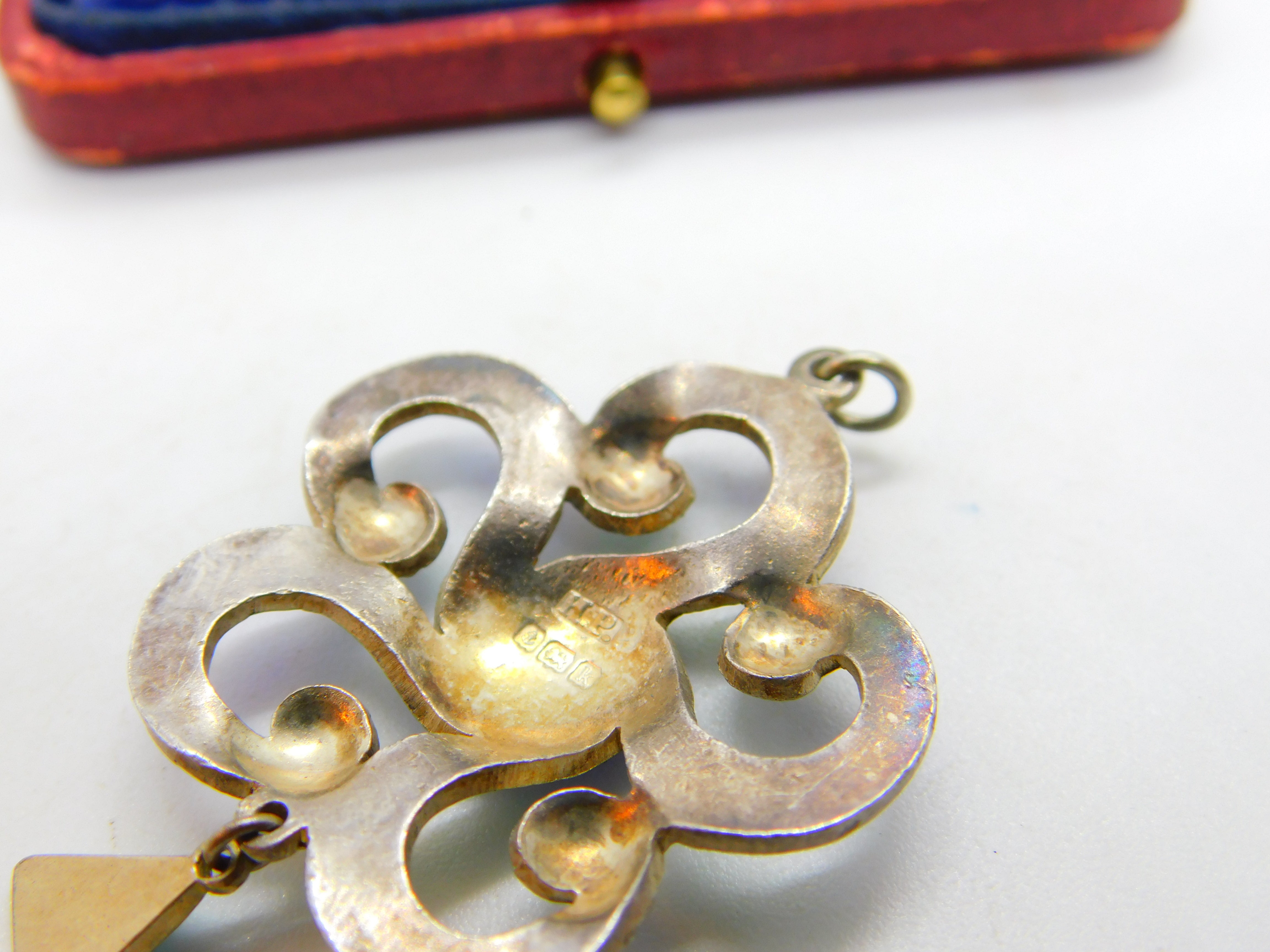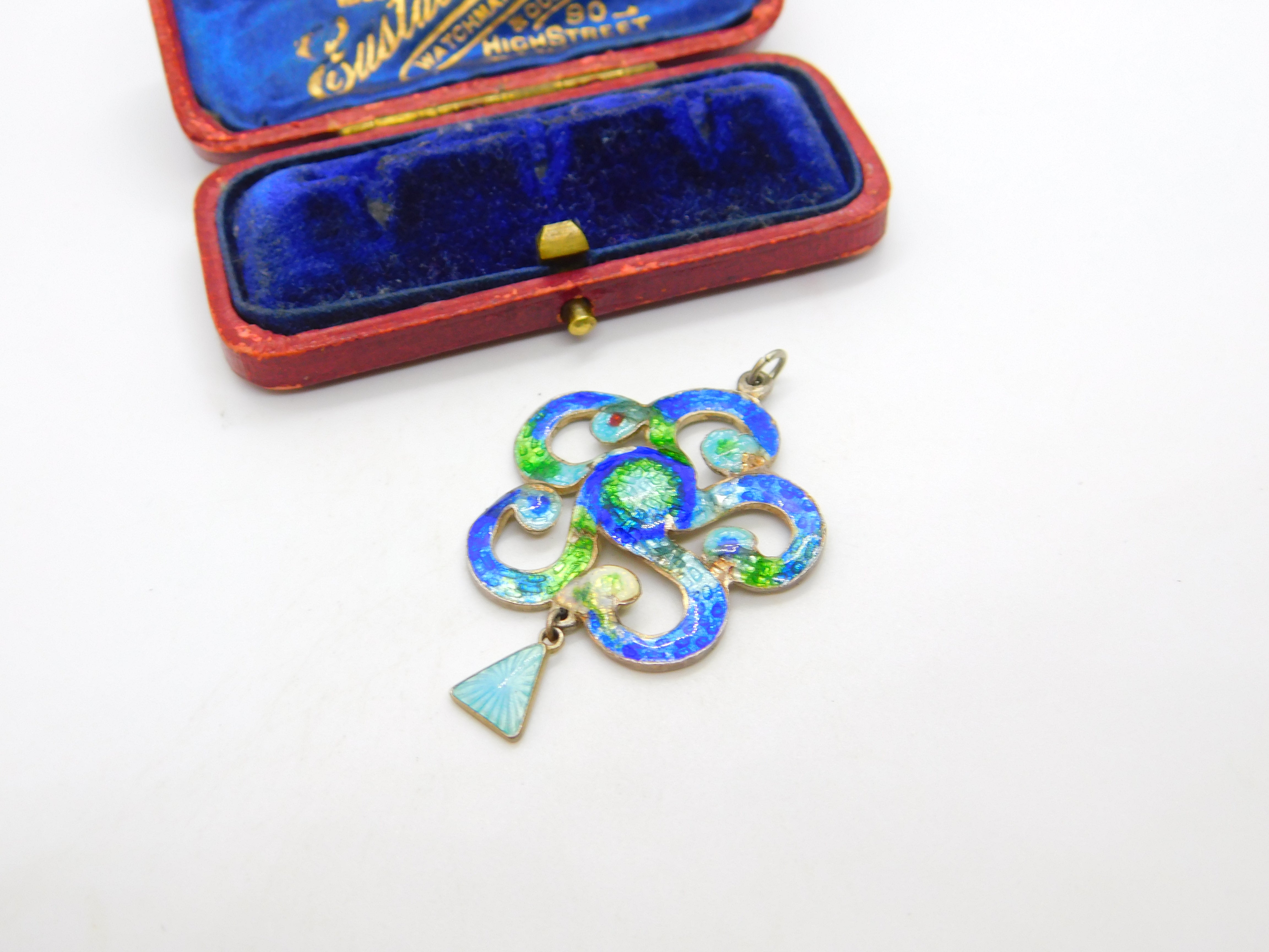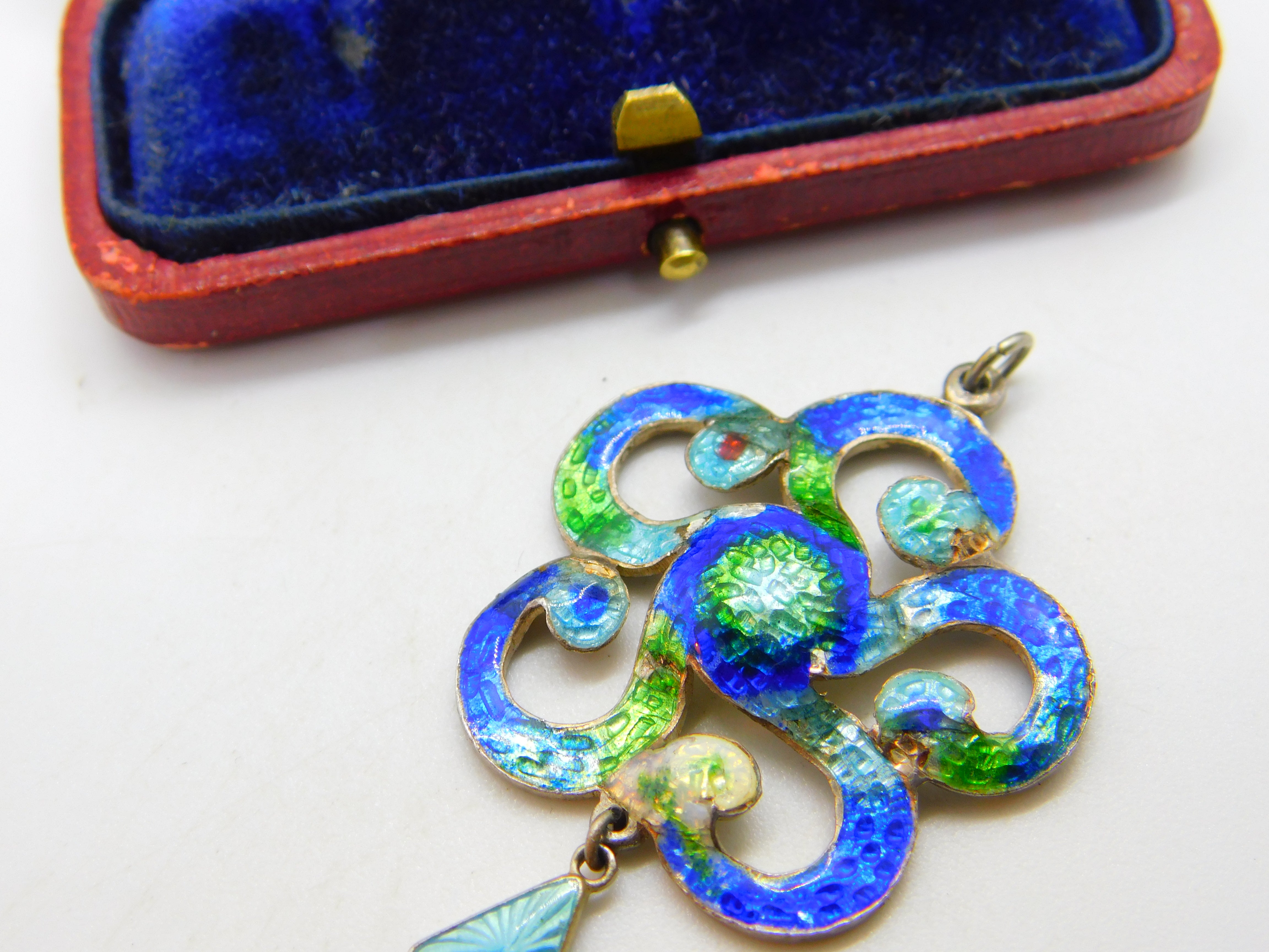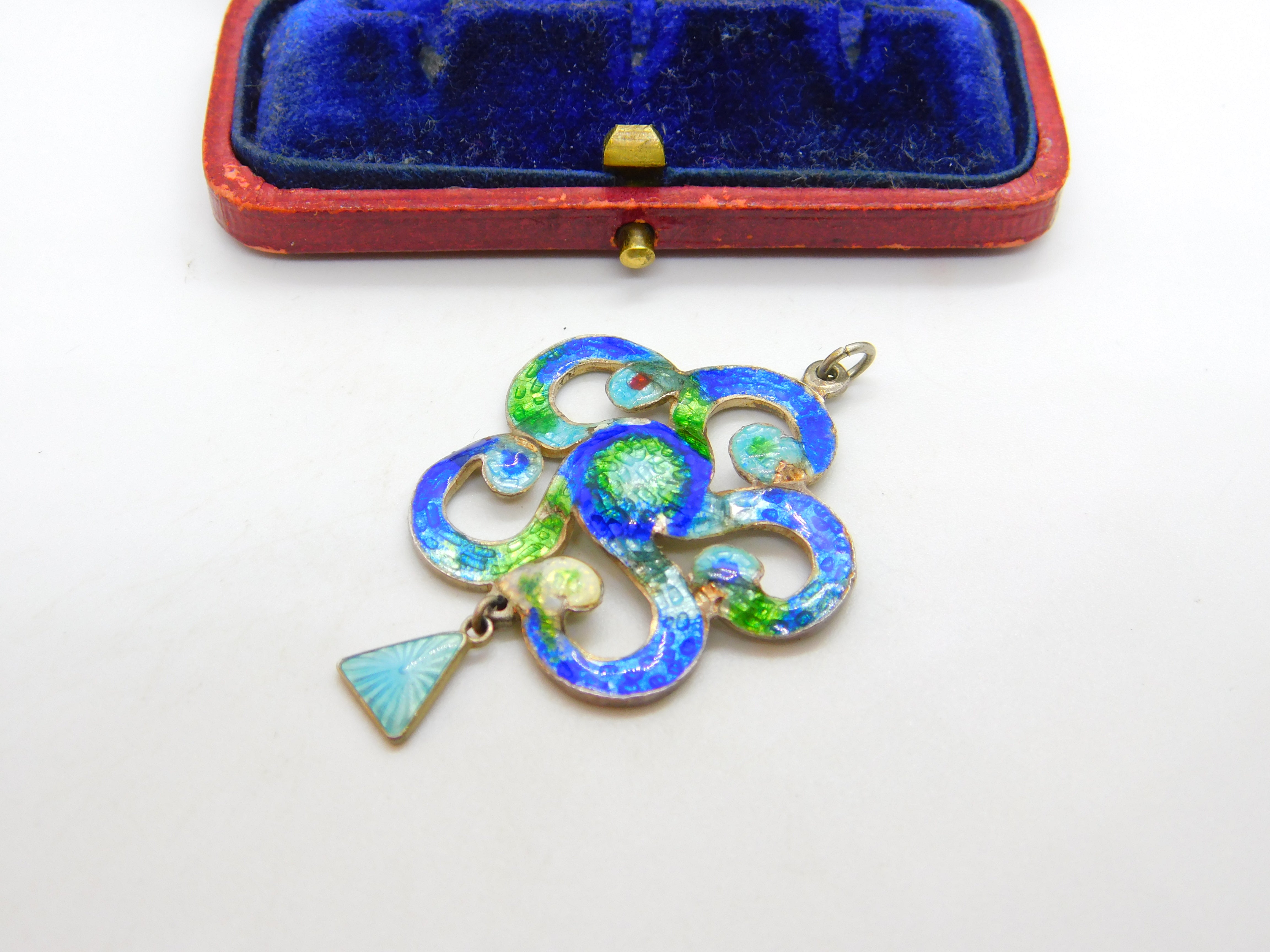 Details: A fantastic and wonderfully designed antique Edwardian sterling silver & colourful guilloche enamel floral swirl pattern drop pendant in true art nouveau style hallmarked Birmingham, 1909 by Henry Pope. Minor dings to the enamel please see pictures. This is a wonderful item that would make a perfect gift or addition to any collection. The BOX pictured is for PRESENTATION ONLY and is NOT included in the listings but used to frame the pictures unless specifically stated otherwise.
