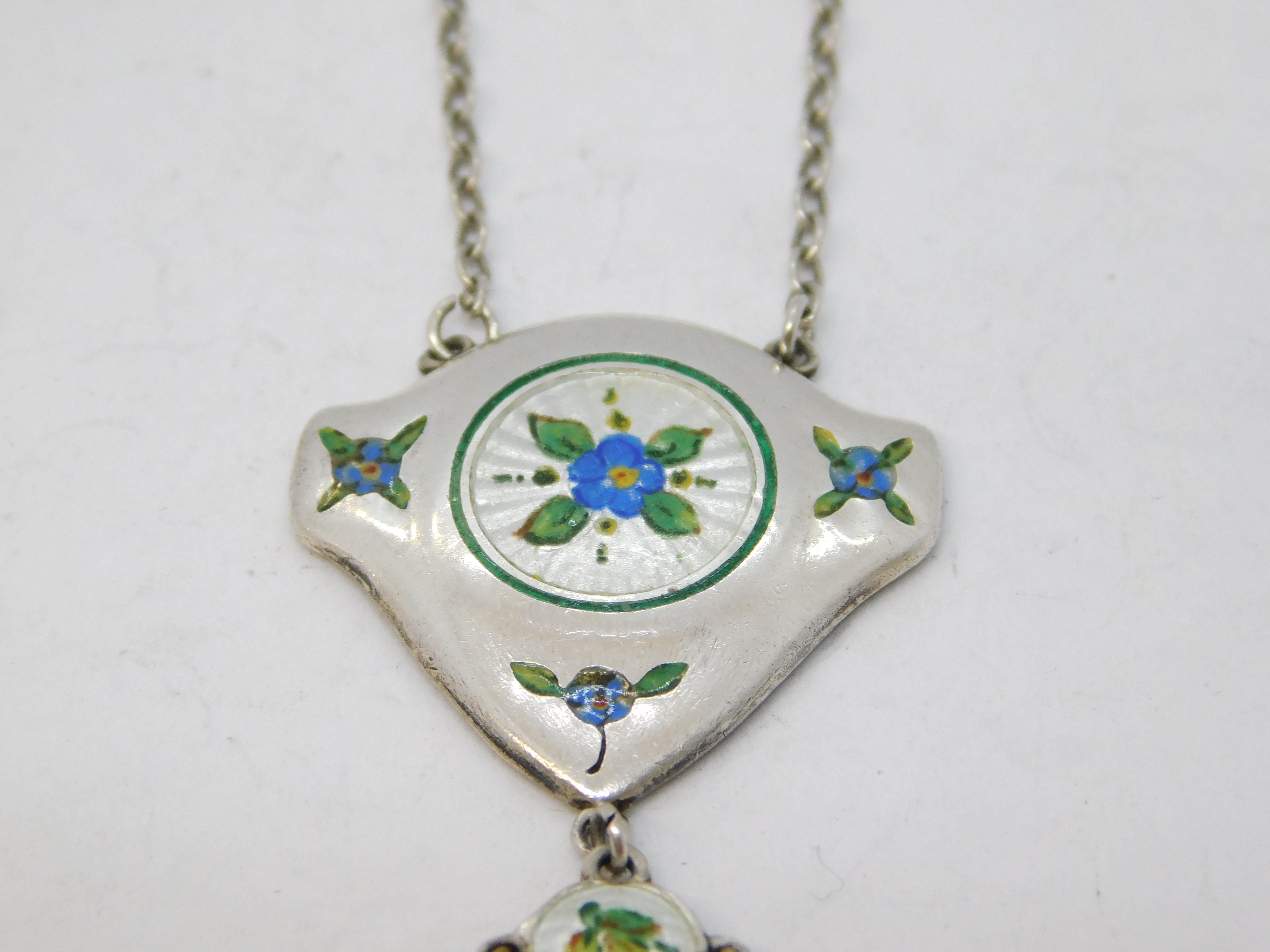 Details: A fantastic and wonderfully designed antique art deco sterling silver & colourful enamel floral decorated lavalier necklace with pearl drops hallmarked Chester 1912 by important maker Charles Horner, lovely condition and design. This is a wonderful item that would make a perfect gift or addition to any collection. We are more than happy to provide XRF reports for items upon request.