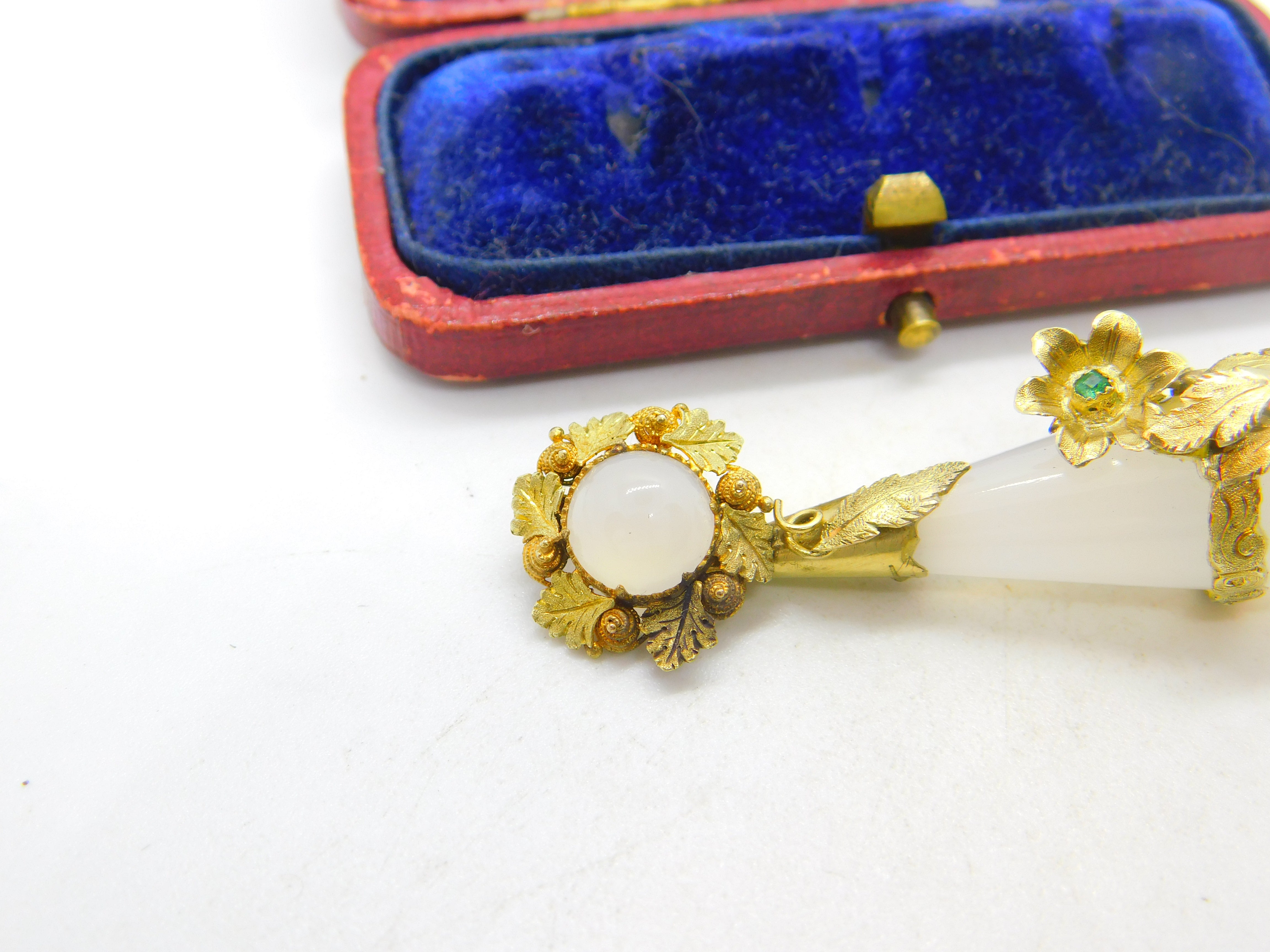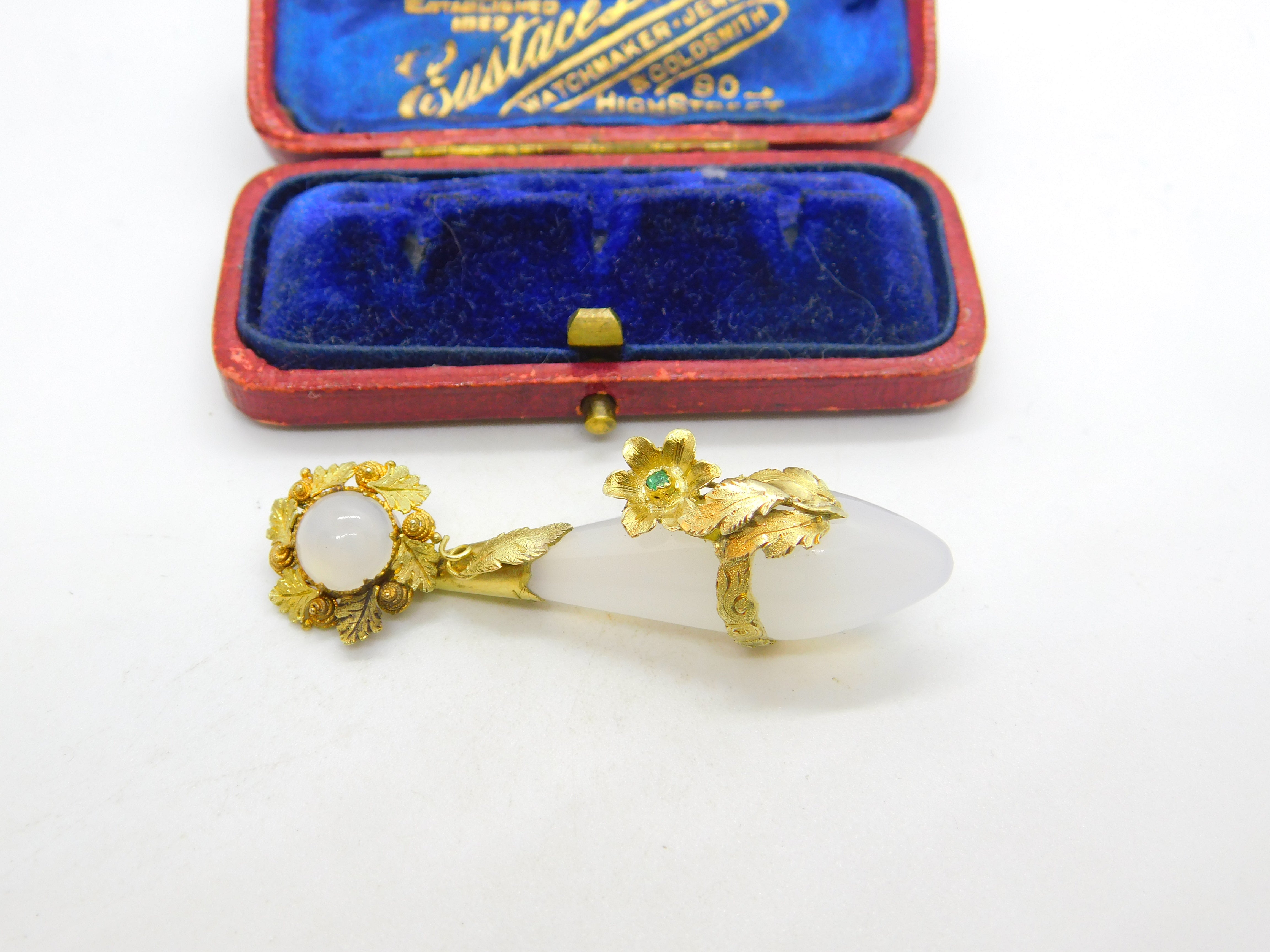 Early Victorian 18ct Gold, Carved Chalcedony & Emerald Floral Pendant c1840