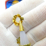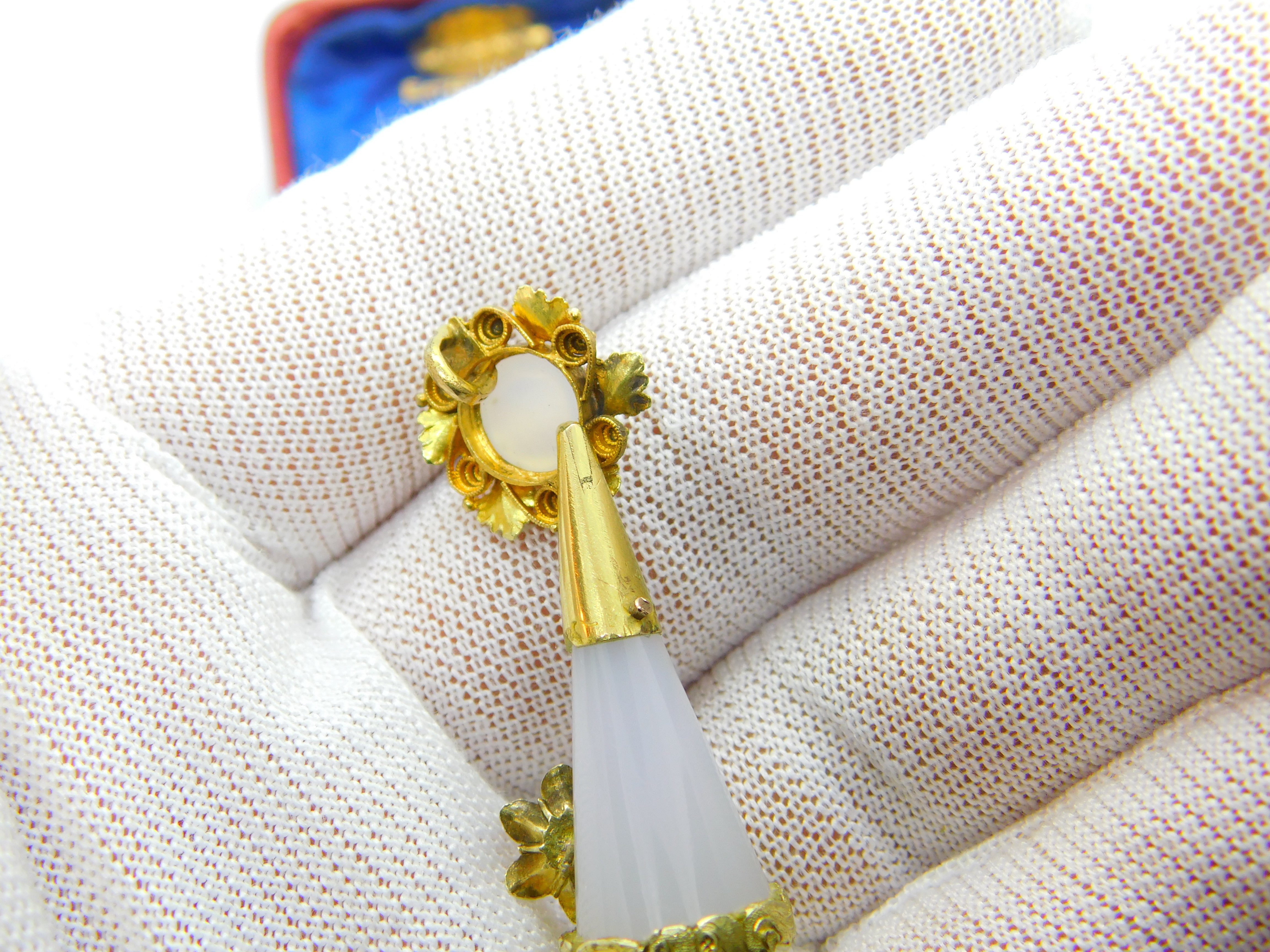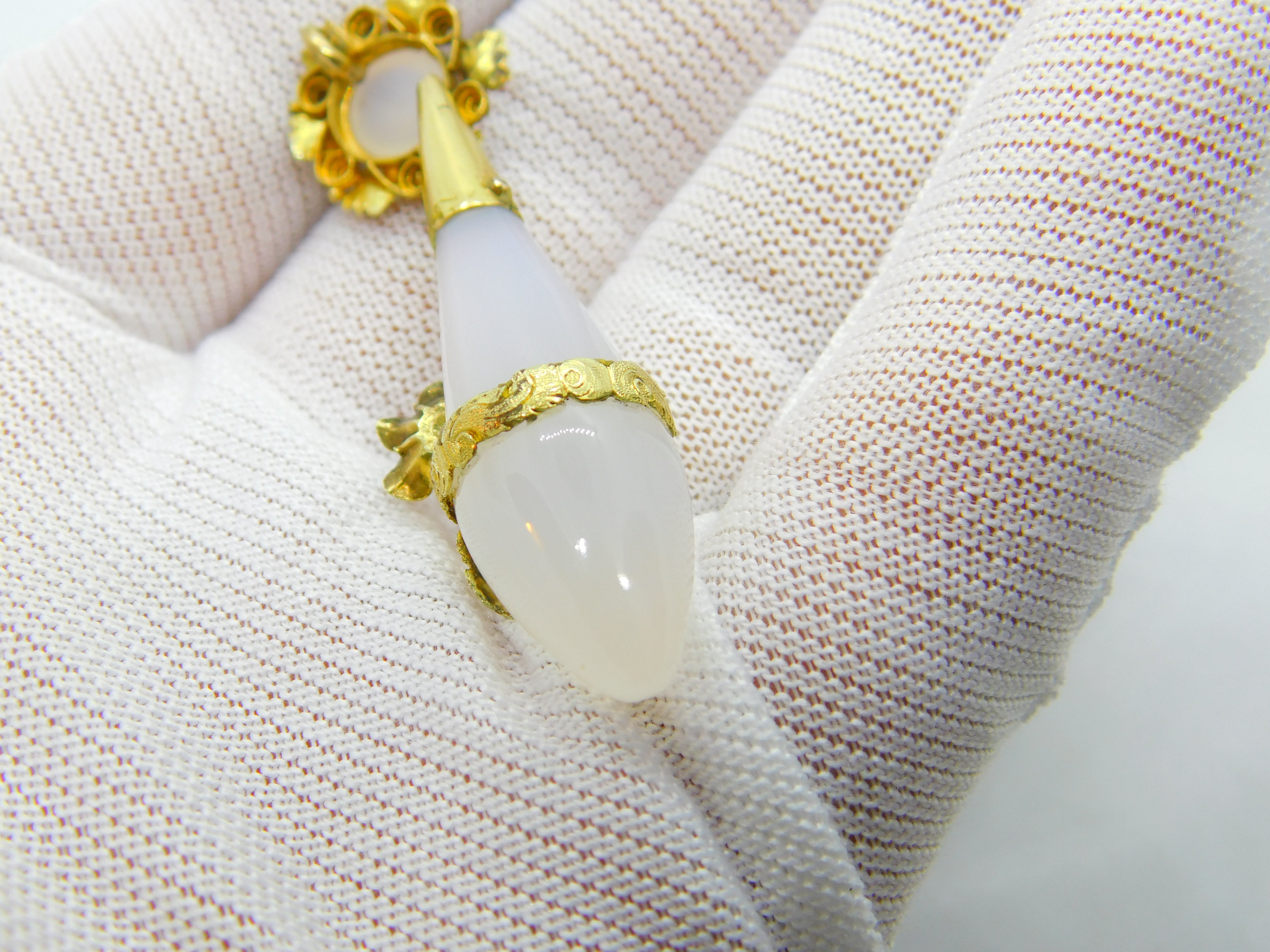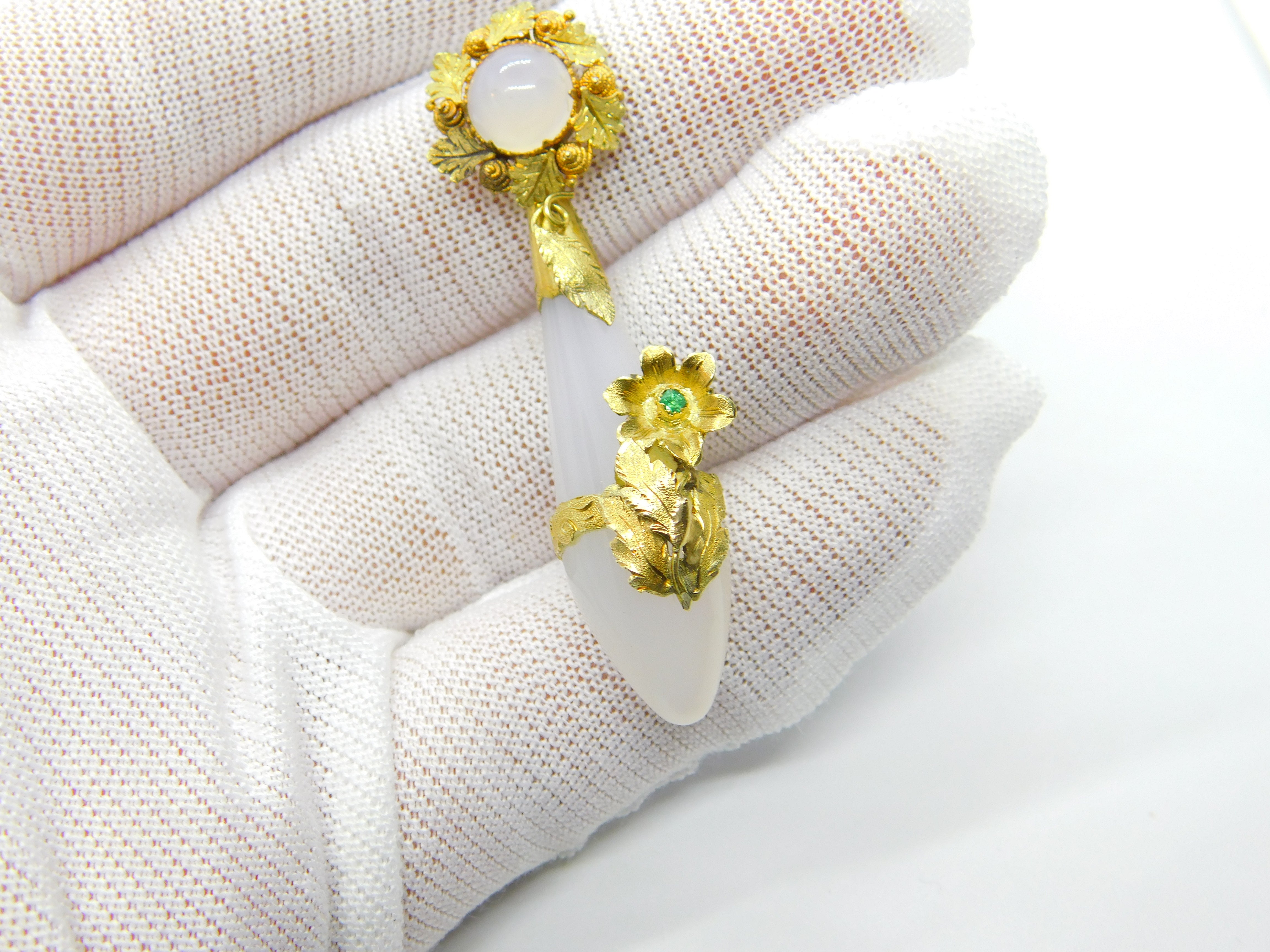 Details: A fantastic and wonderfully designed antique early Victorian 18ct yellow gold large floral drop pendant formed of carved chalcedony agate set with a small emerald stone c1840. The gold has been XRF tested the the chalcedony is perfect. This is a wonderful item that would make a perfect gift or addition to any collection. The BOX pictured is for PRESENTATION ONLY and is NOT included in the listings but used to frame the pictures unless specifically stated otherwise.
