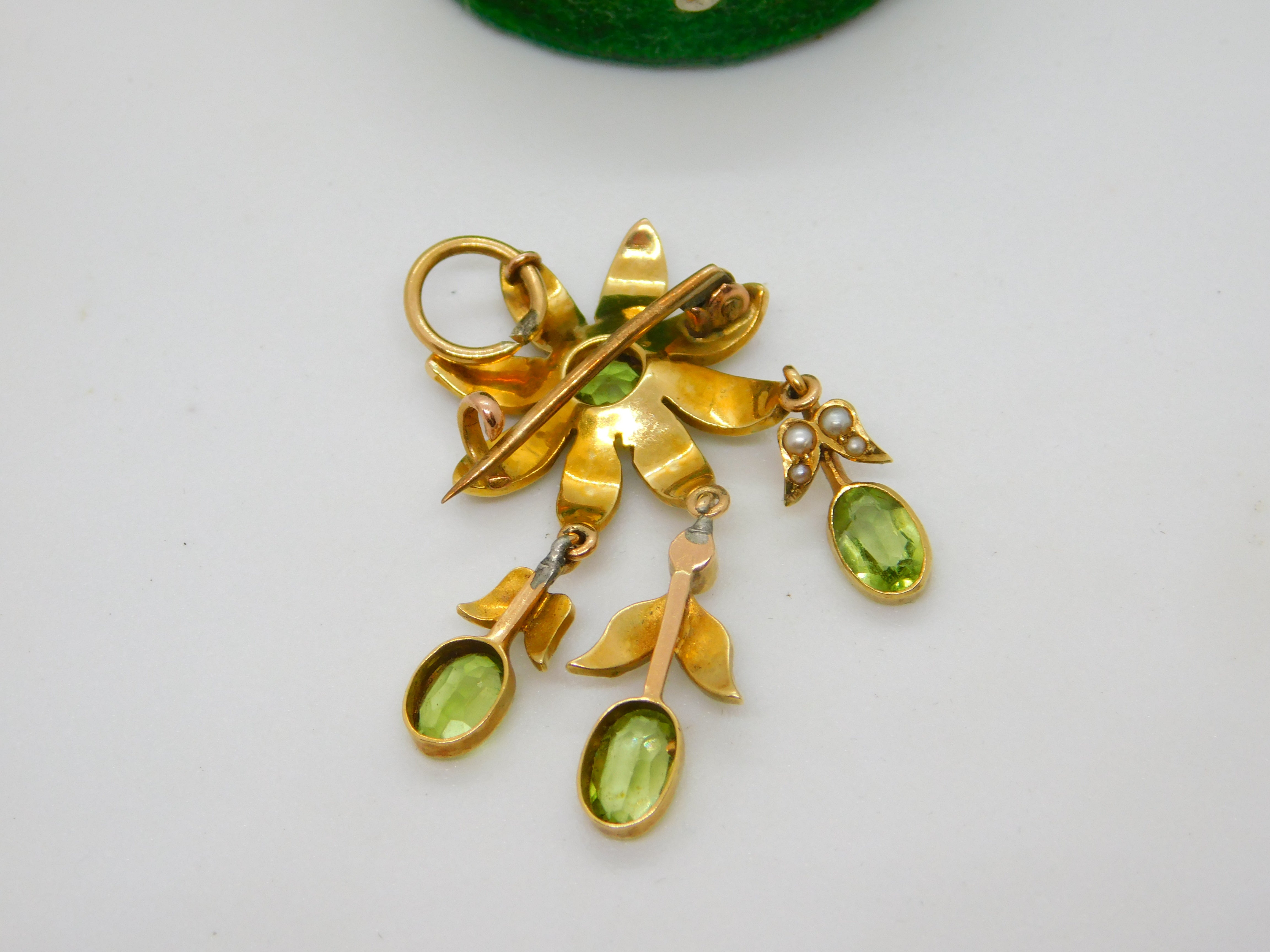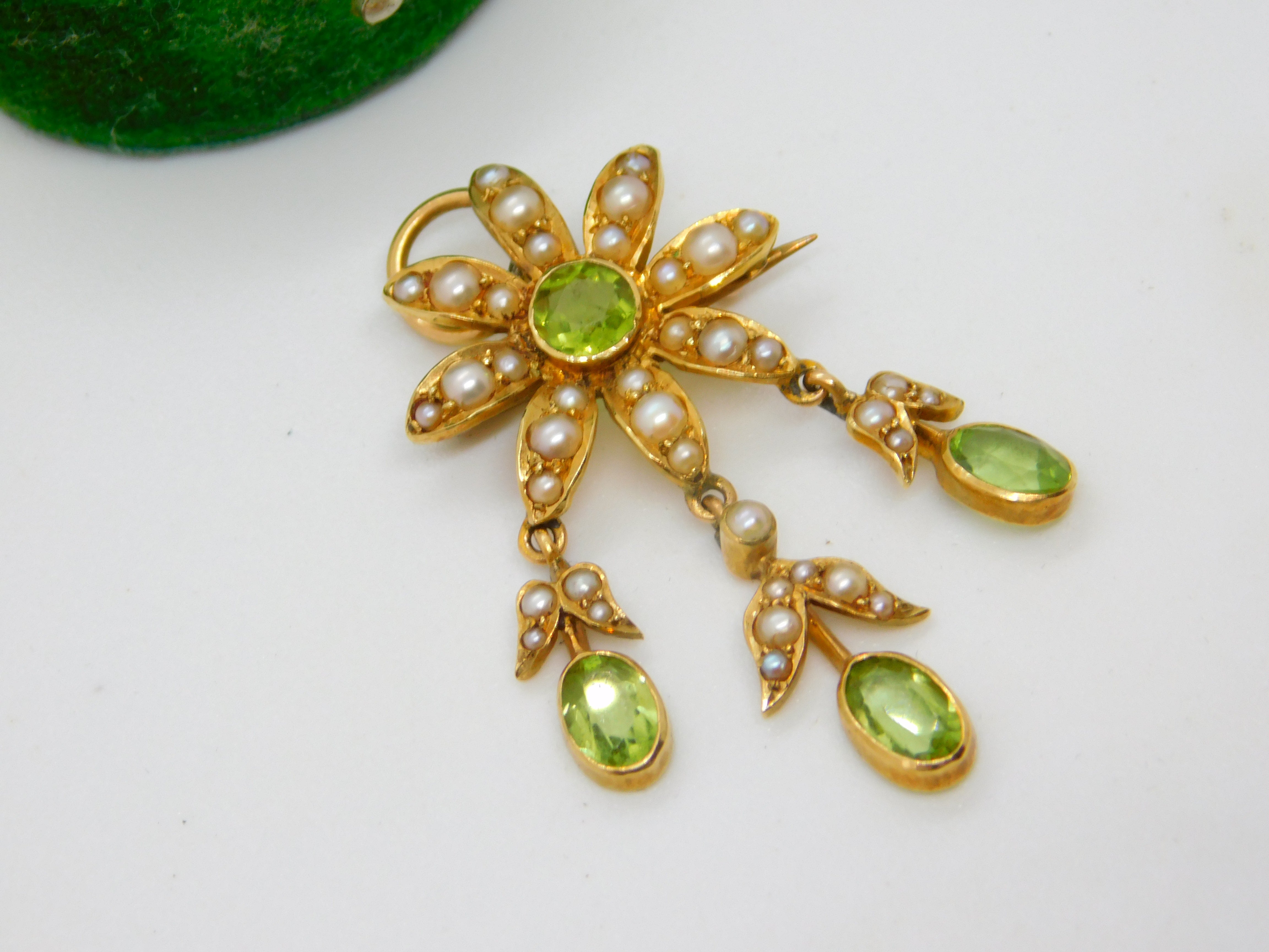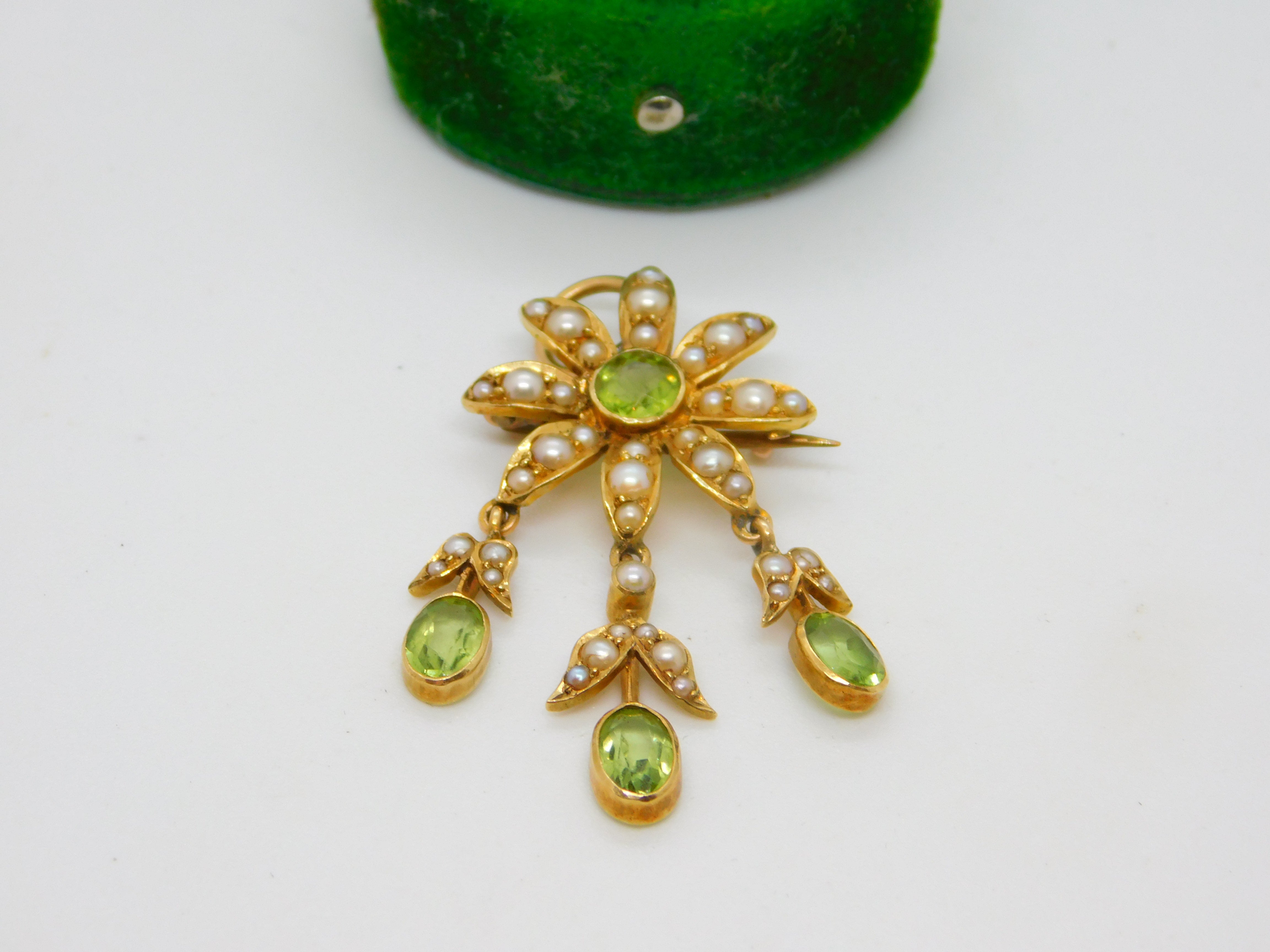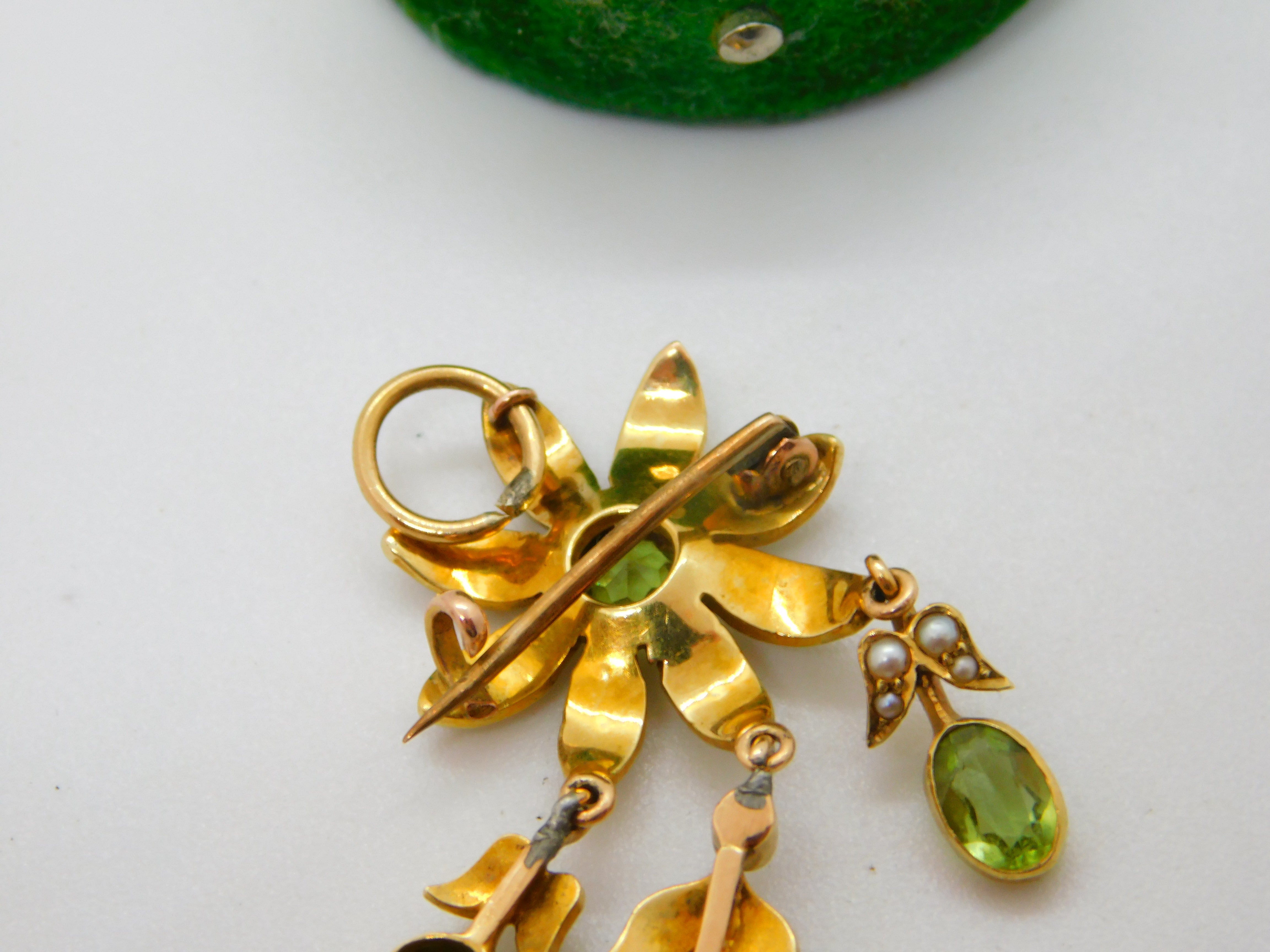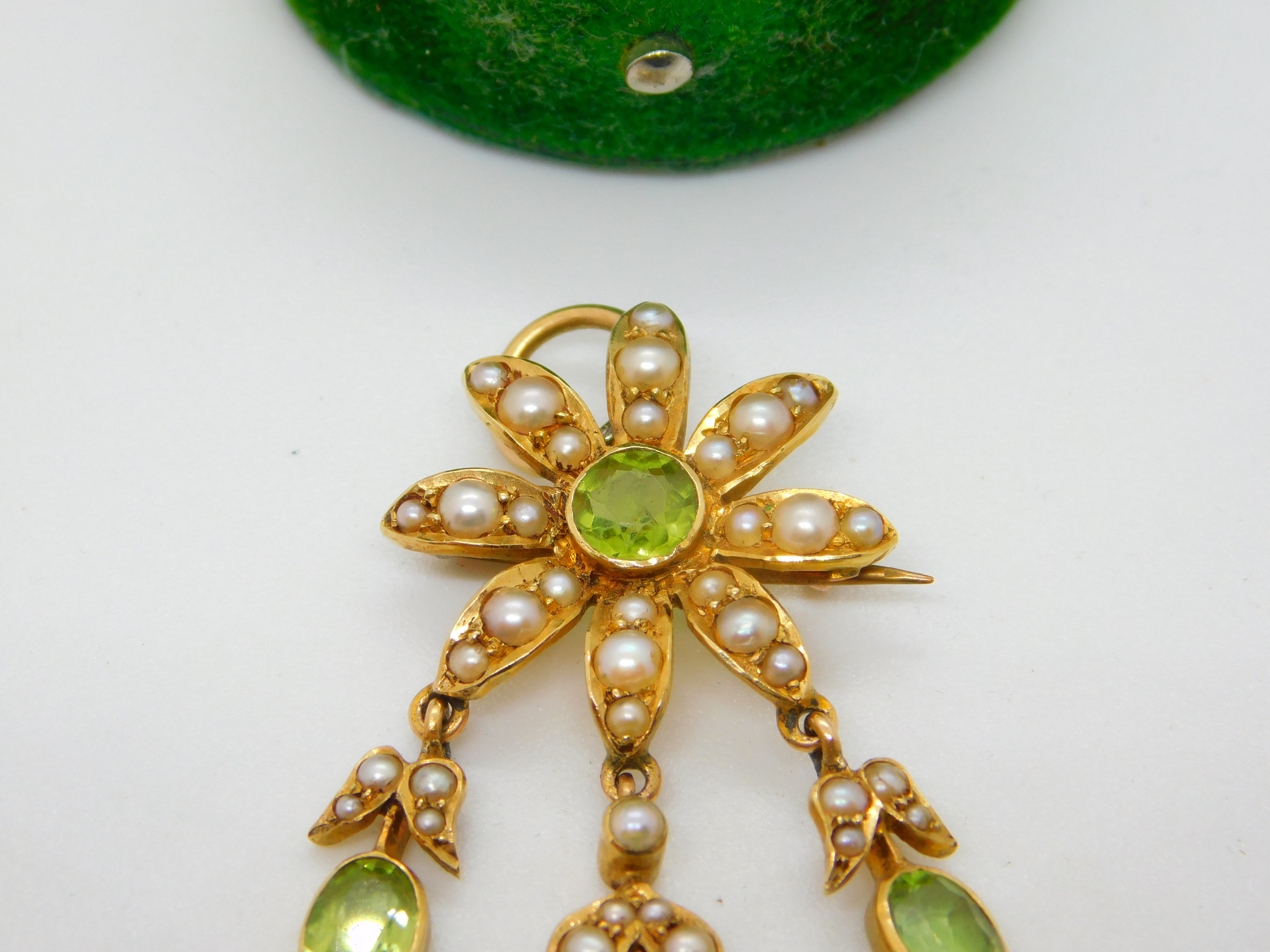Details: A fantastic and wonderfully designed antique Edwardian 18ct yellow gold floral lavalier drop pendant set with seed pearl & peridot c1910, the gold has been XRF tested. A stunning example in Suffragette colours, the item could also be worn as a brooch. This is a wonderful item that would make a perfect gift or addition to any collection. The BOX pictured is for PRESENTATION ONLY and is NOT included in the listings but used to frame the pictures unless specifically stated otherwise.