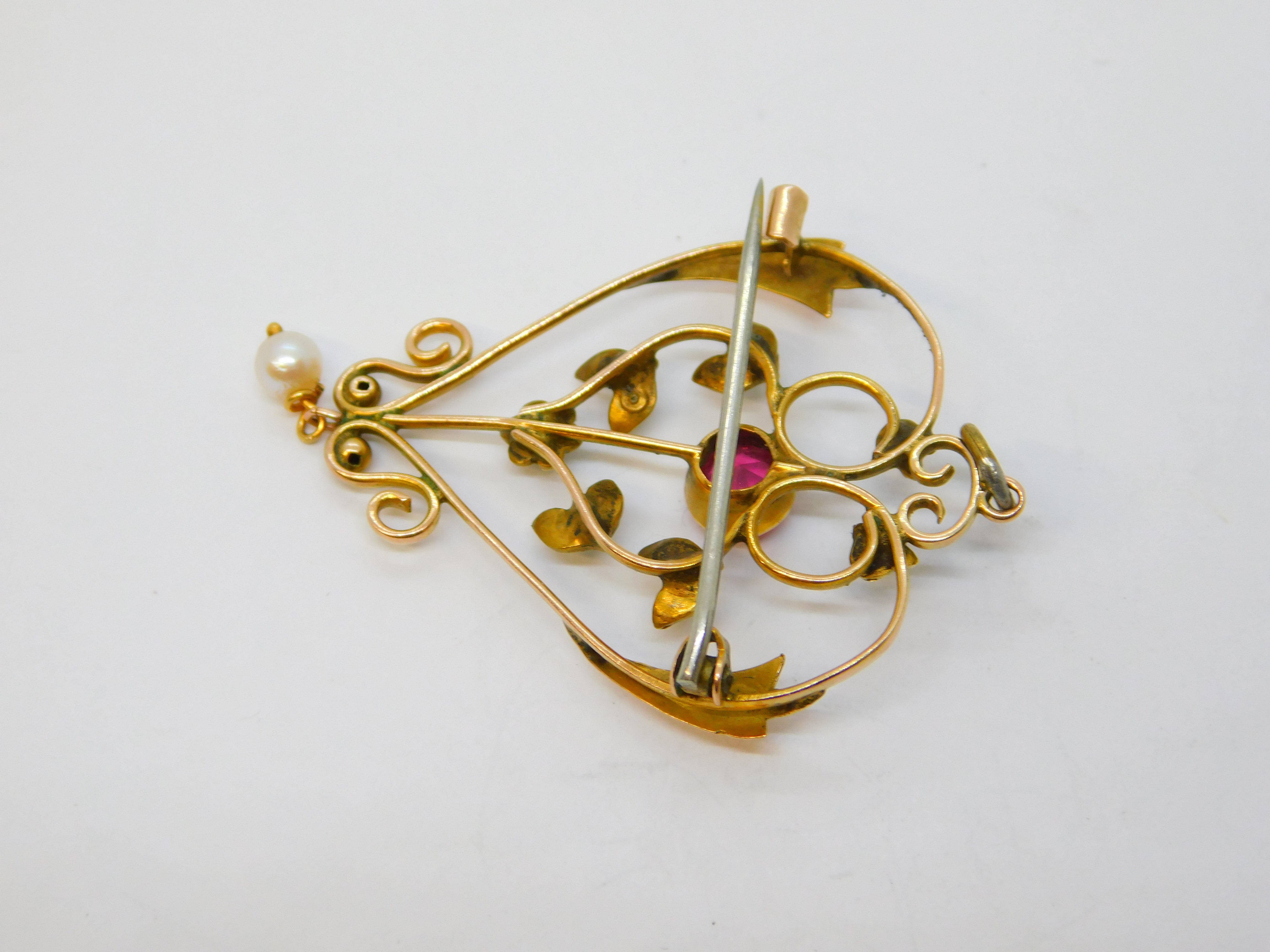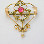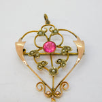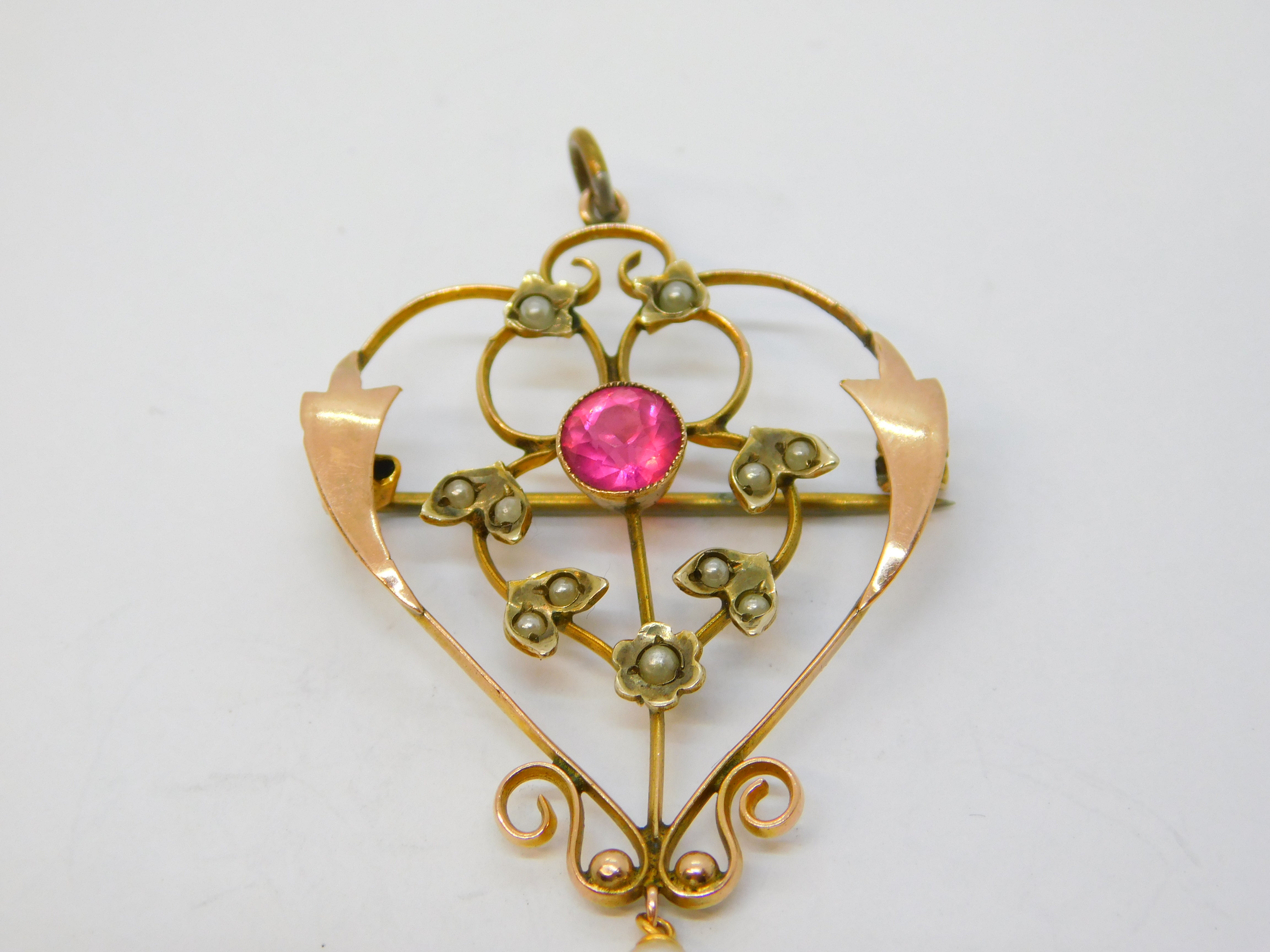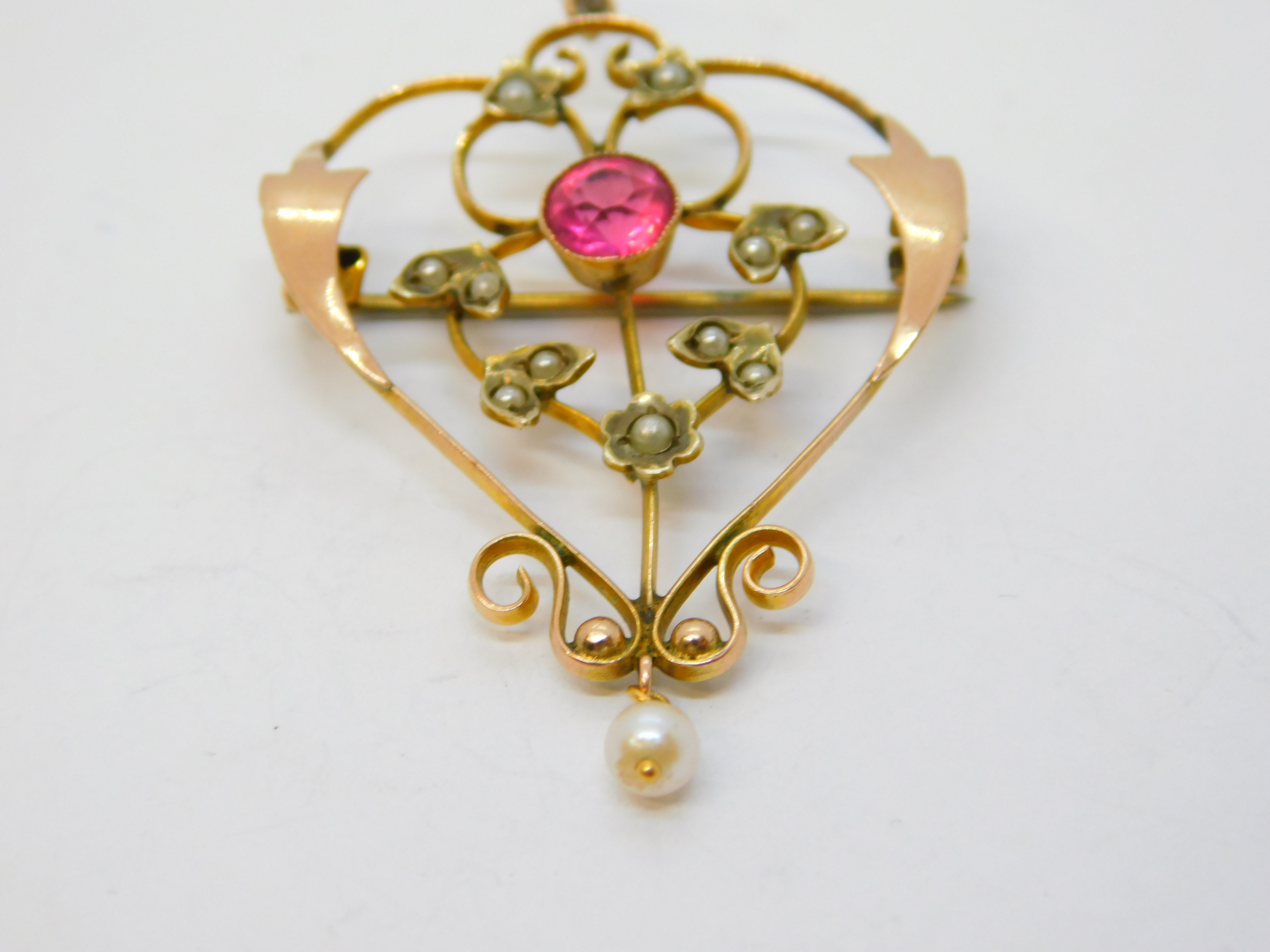 Details: A fantastic and wonderfully designed antique edwardian 9ct yellow gold, pink topaz & seed pearl lavalier drop pendant c1910. This is a wonderful item that would make a perfect gift or addition to any collection. We are more than happy to provide XRF reports for items upon request.