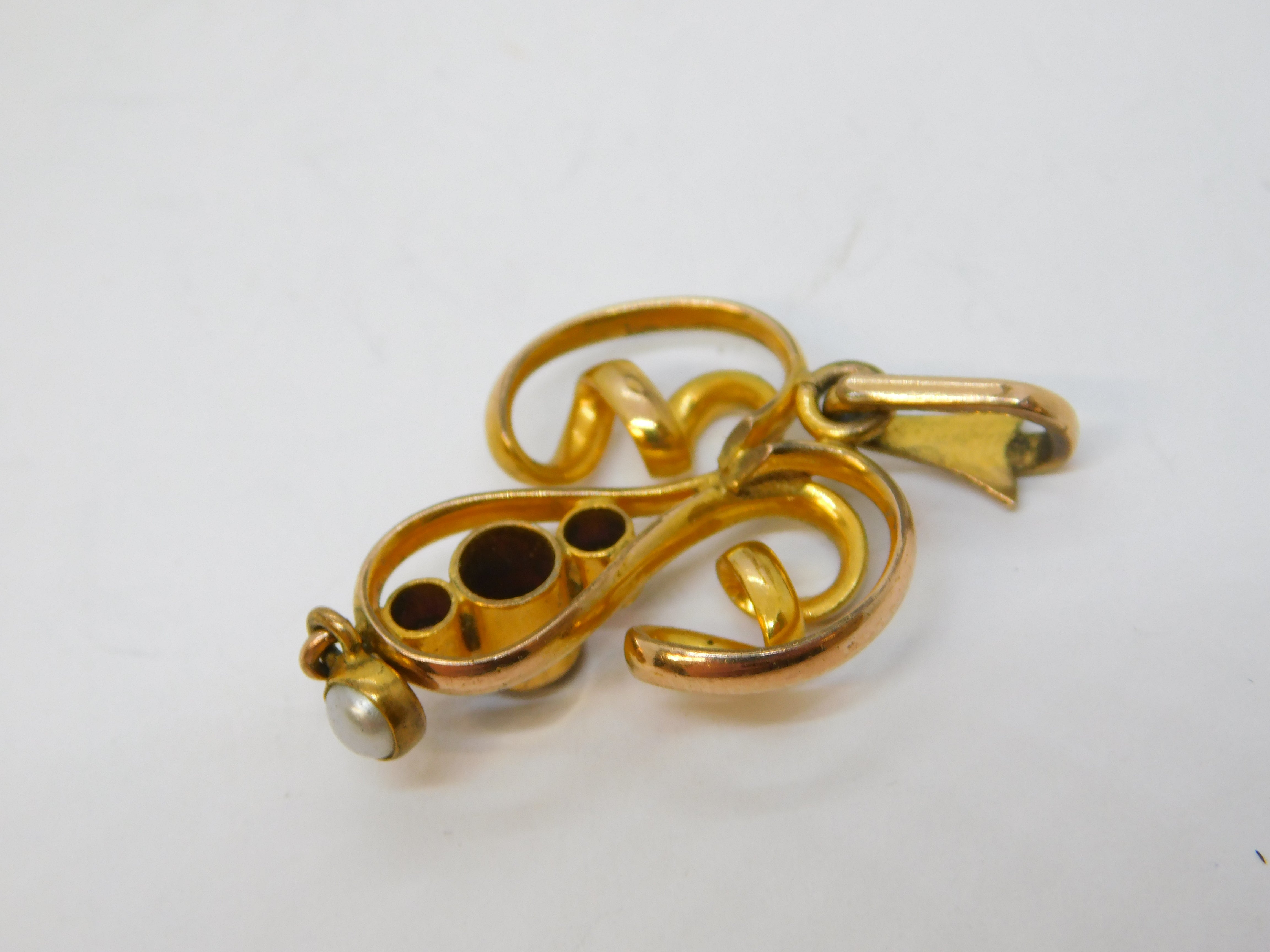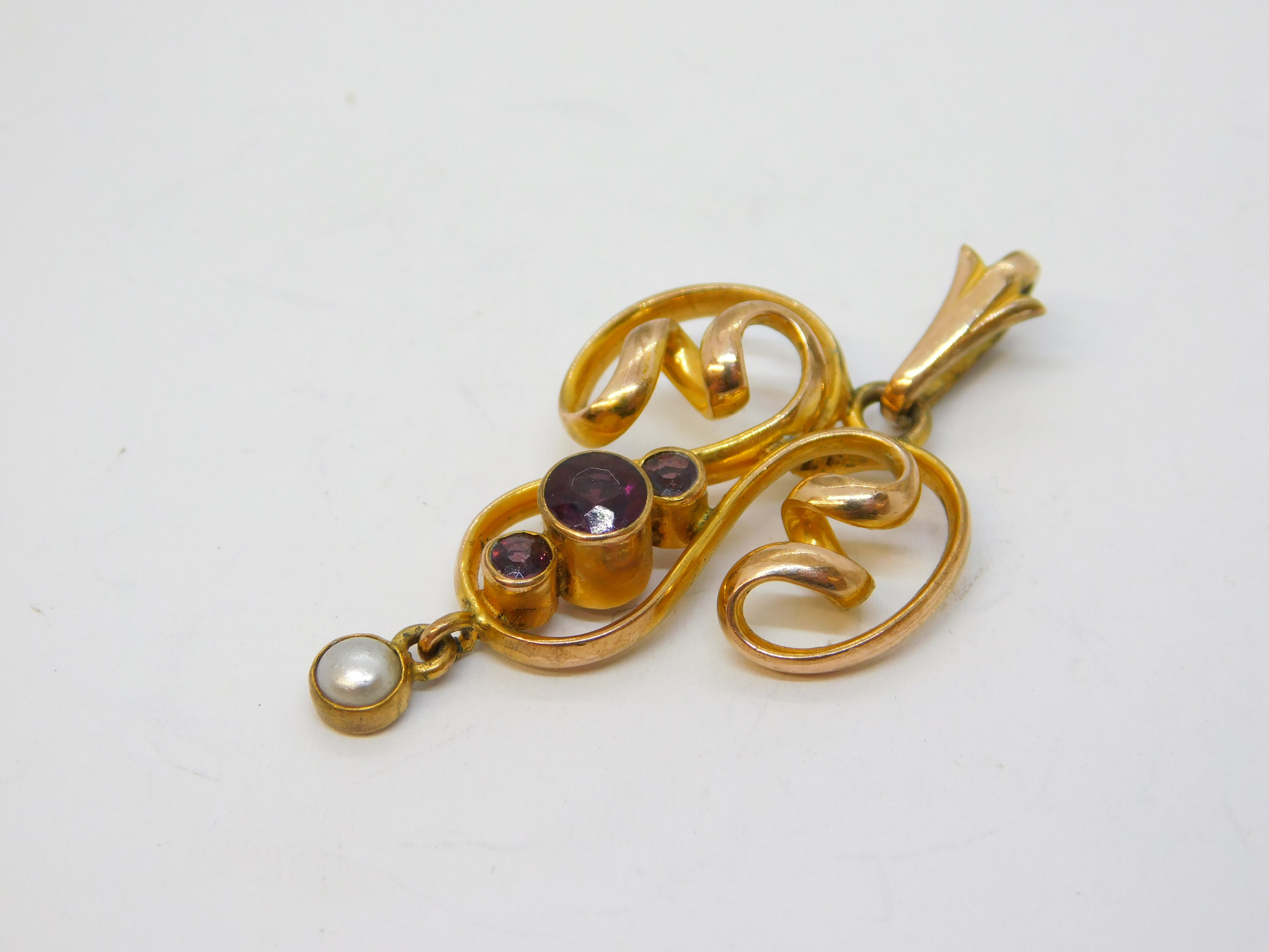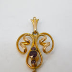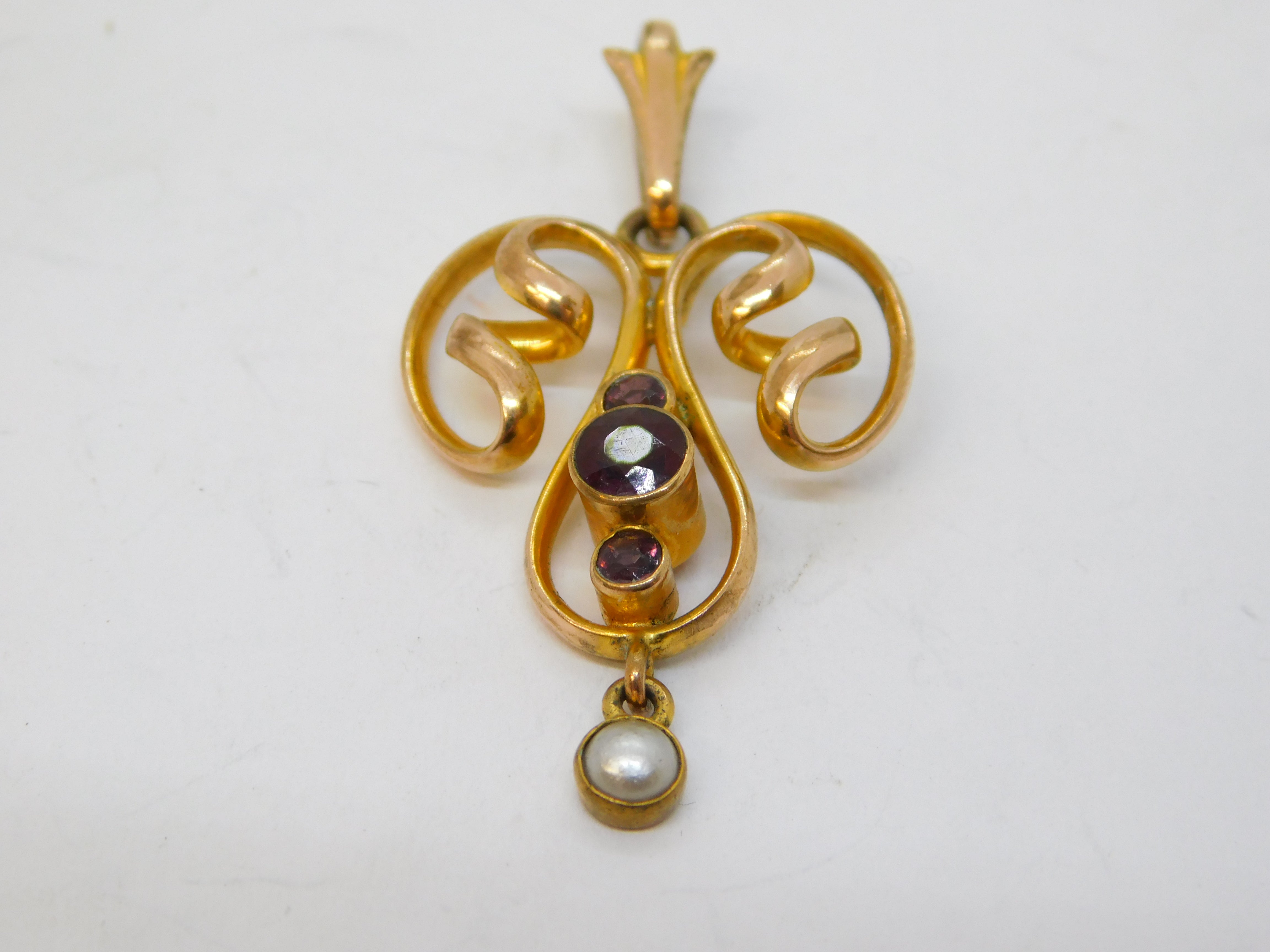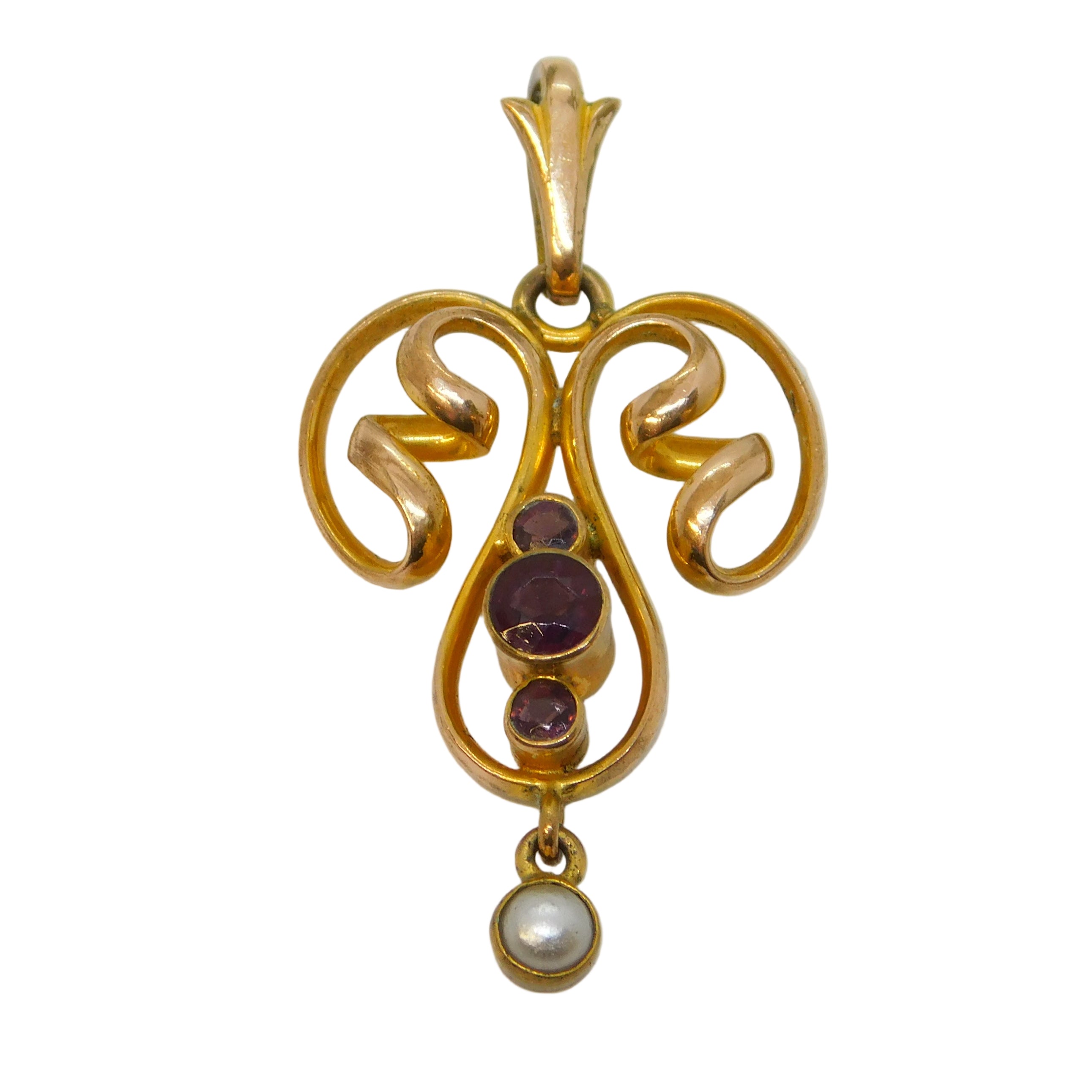 Details: A fantastic and wonderfully designed antique edwardian 9ct yellow gold ornate lavalier drop pendant set with almandine garnets & pearl c1910, the gold has been XRF tested as it is unmarked. This is a wonderful item that would make a perfect gift or addition to any collection. We are more than happy to provide XRF reports for items upon request.