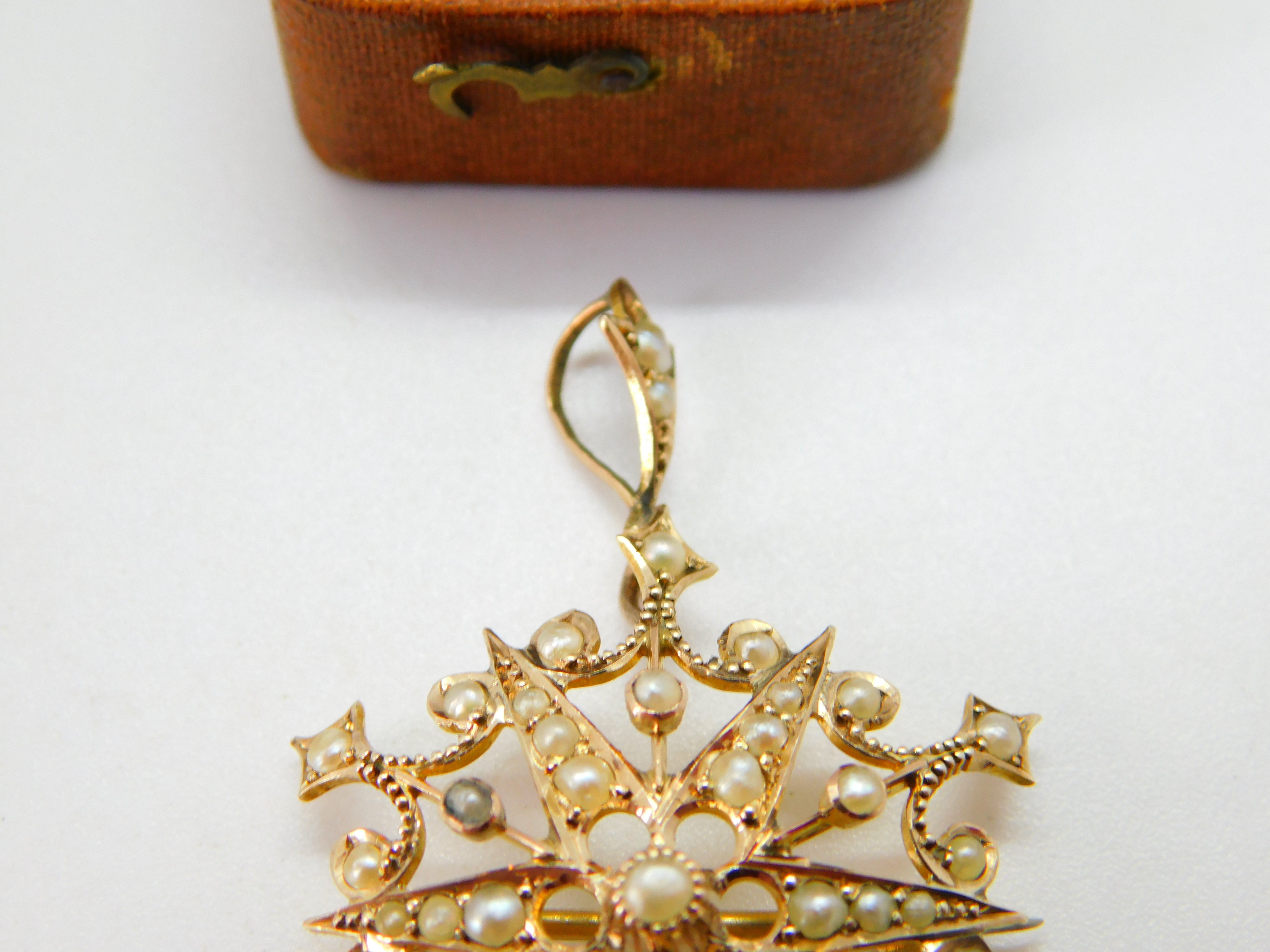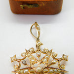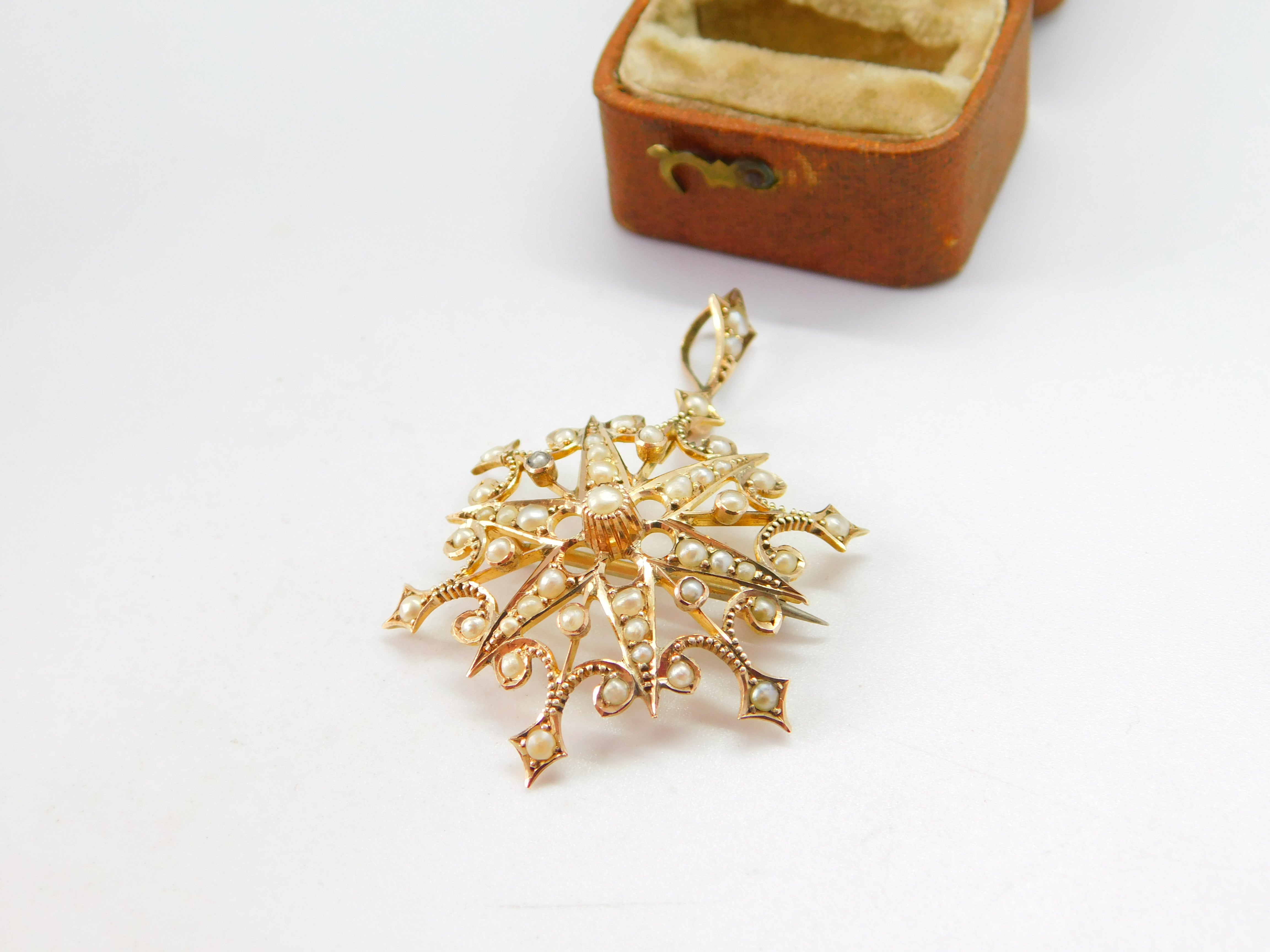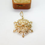 Edwardian 9ct Yellow Gold Seed Pearl Set Starburst Drop Pendant c1910 Antique