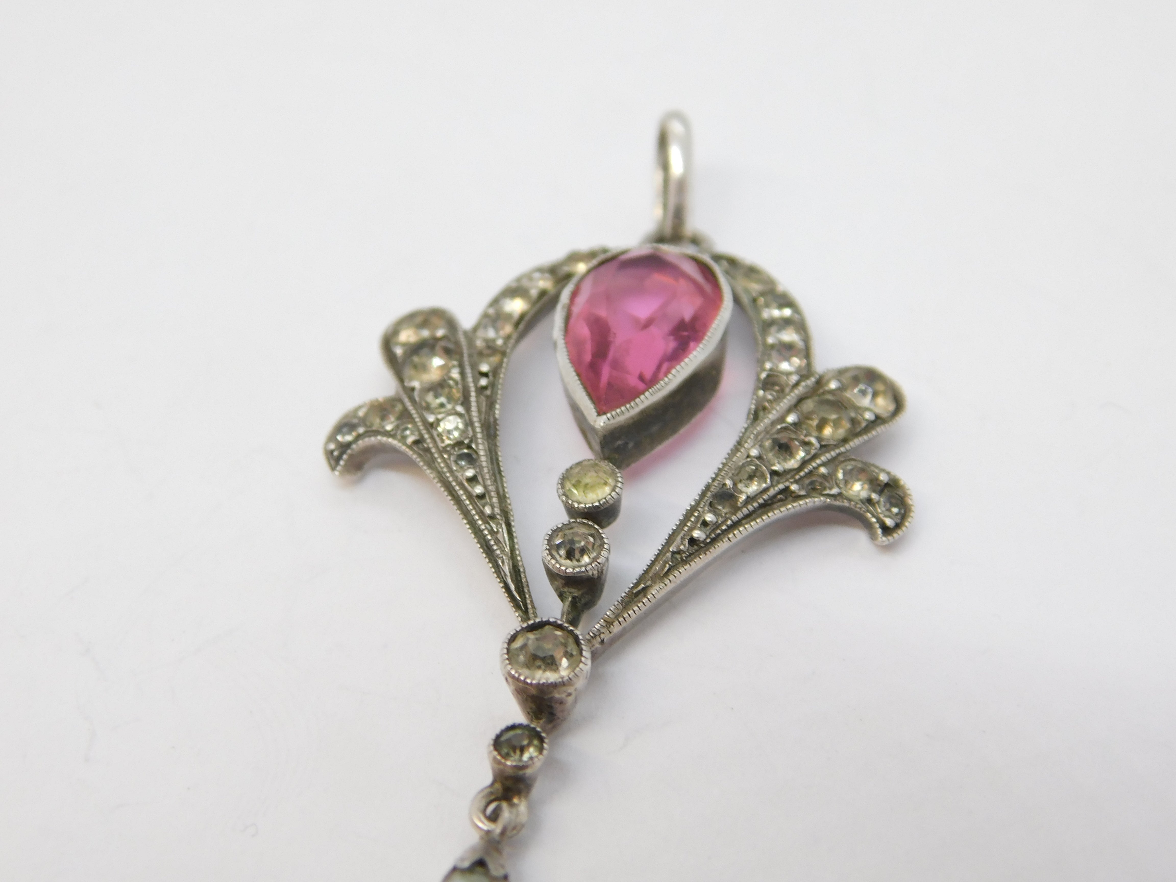 Details: A fantastic and wonderfully designed antique edwardian sterling silver pink-white paste set lavalier drop pendant with lovely detailing hallmarked to the reverse c1910. This is a wonderful item that would make a perfect gift or addition to any collection. We are more than happy to provide XRF reports for items upon request.