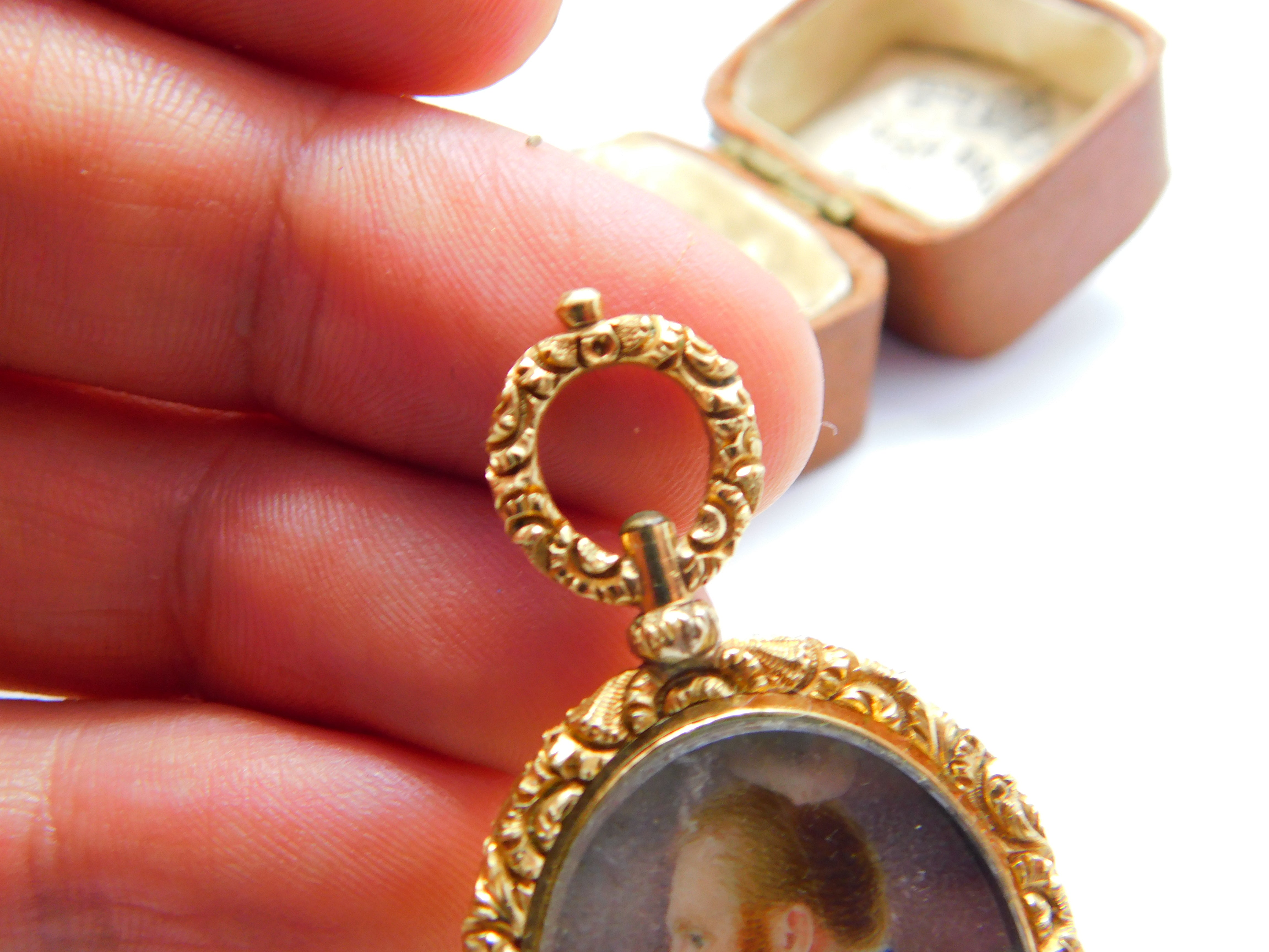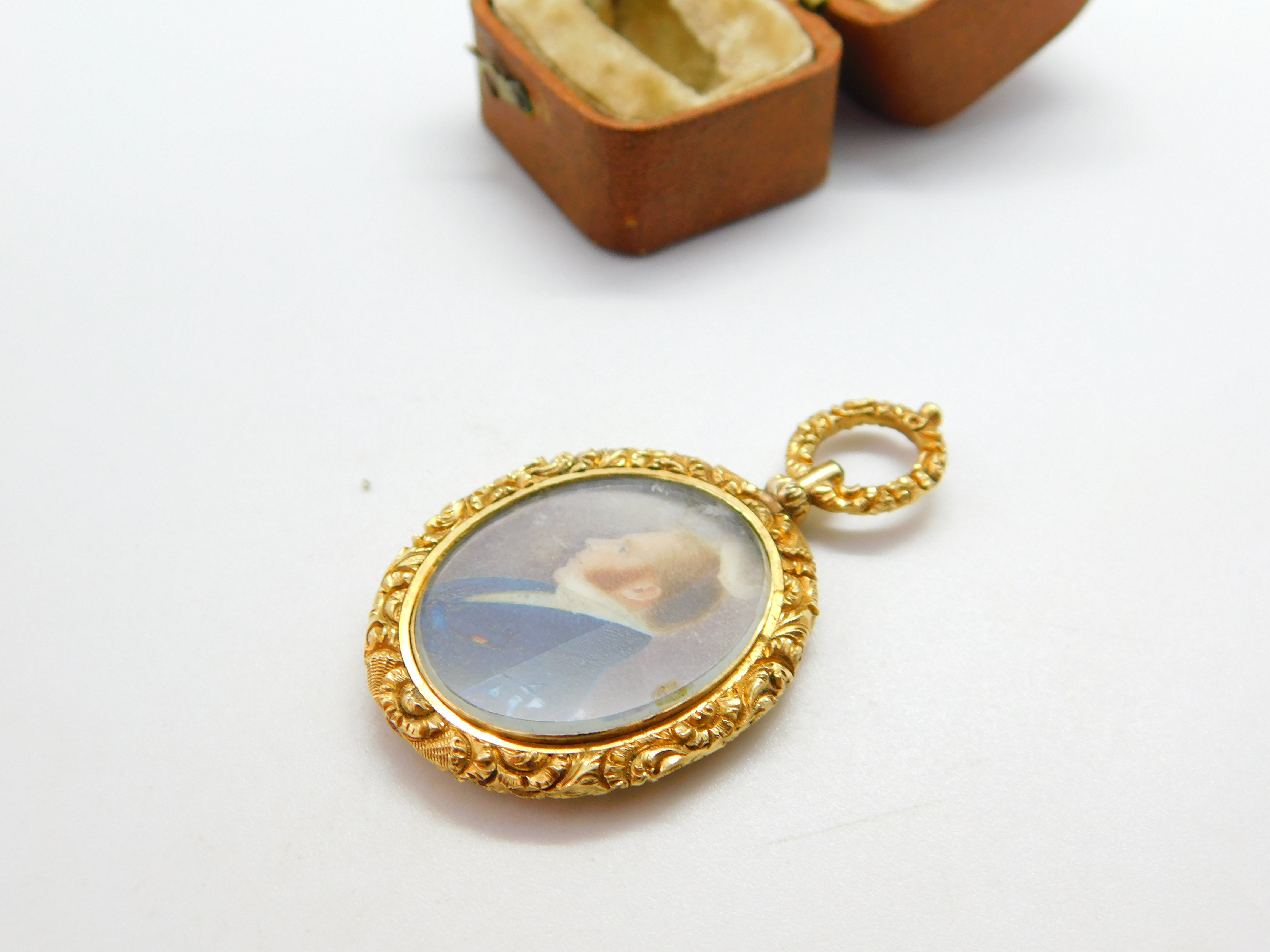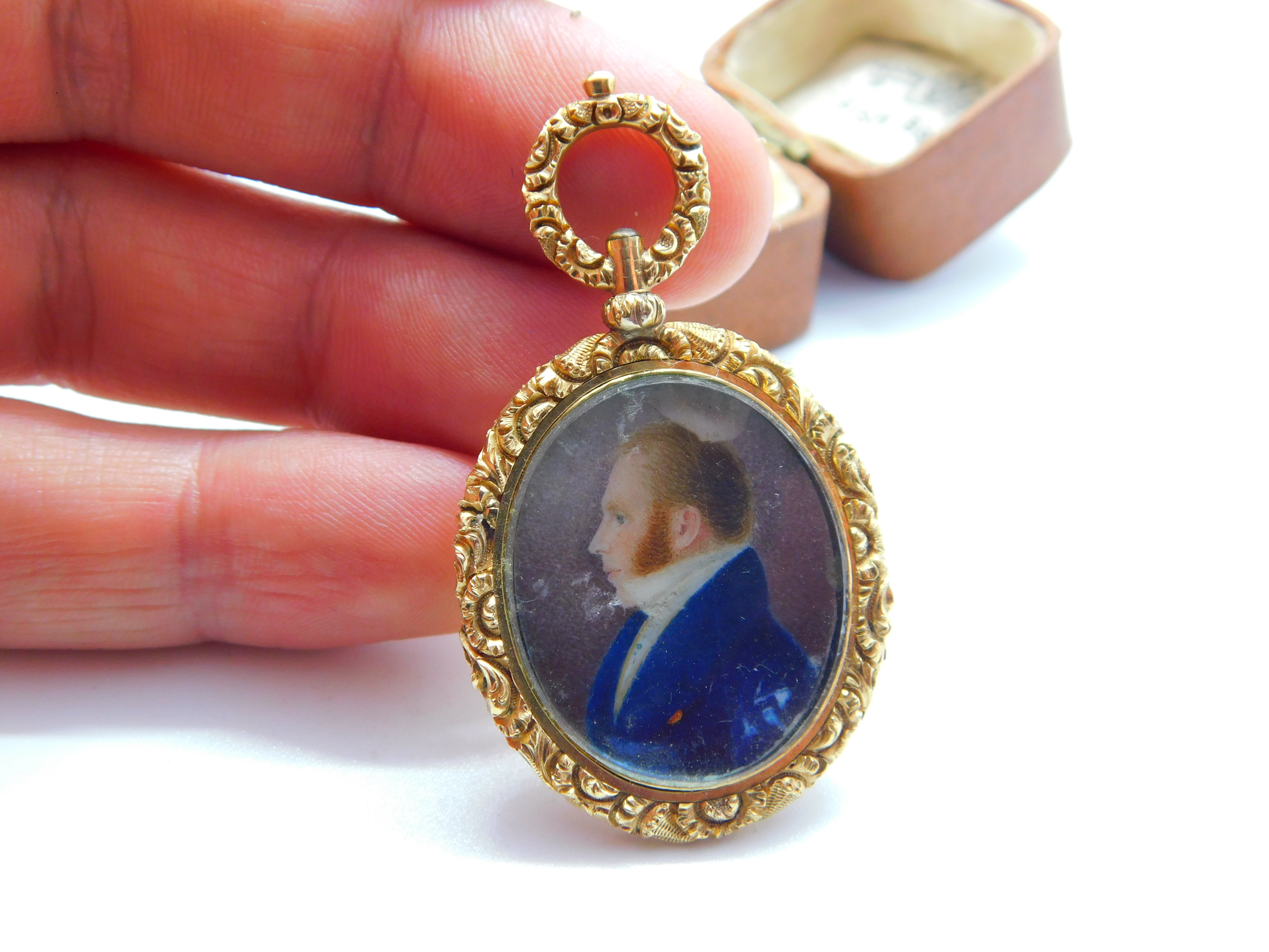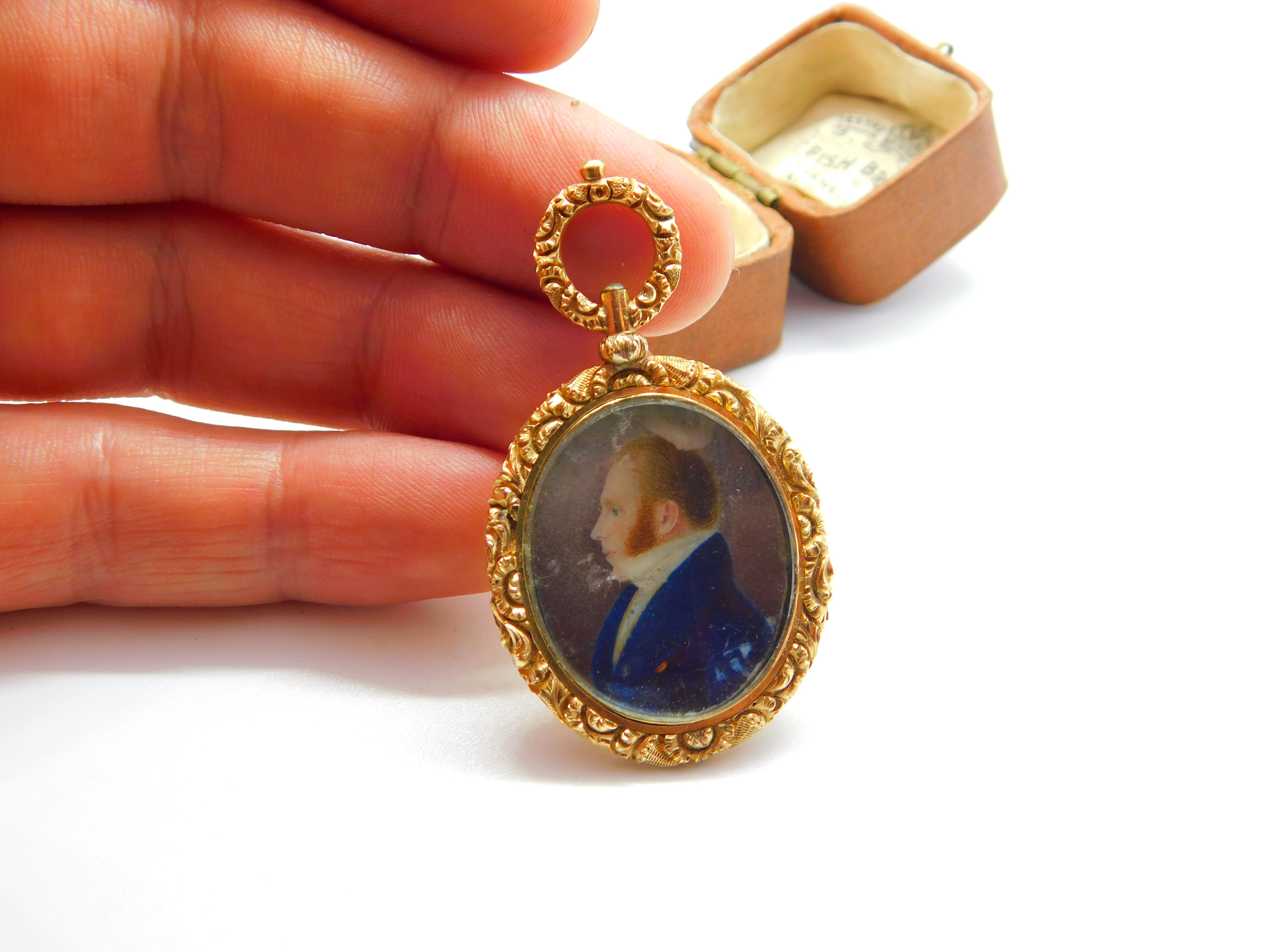 Details: A fantastic and wonderfully designed antique Georgian regency period 15ct yellow gold cased mourning locket pendant set with a watercolour portrait of a gentleman c1830. The gold has been XRF tested as it is unmarked. The gold tests as 15ct but we believe it is cased on a base metal. This is a wonderful item that would make a perfect gift or addition to any collection. The BOX pictured is for PRESENTATION ONLY and is NOT included in the listings but used to frame the pictures unless specifically stated otherwise.