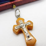 Sterling Silver & Butterscotch Amber Cross Crucifix Pendant Antique c1920 Deco