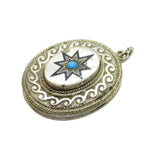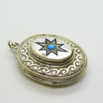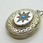 Details: A fantastic and wonderfully designed antique Victorian silver plated large mourning locket set with a central turquoise flanked with black enamel star, set with woven hair to the interior with original glass c1860. This is a wonderful item that would make a perfect gift or addition to any collection. The BOX pictured is for PRESENTATION ONLY and is NOT included in the listings but used to frame the pictures unless specifically stated otherwise.